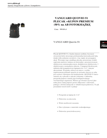 www.abfoto.pl Aparaty fotograficzne cyfrowe i kompaktowe VANGUARD QUOVIO 51 PLECAK +KUPON PREMIUM -50% na AB FOTOKSIĄŻKĘ Cena: 999.00 zł VANGUARD Quovio 51 Plecak QUOVIO 51 z bardzo dużym szybkim, bocznym otwarciem które utrzymuje profesjonalną lustrzankę pod ręką dzięki tylko jednemu suwakowi, więc nigdy nie przegapisz akcji. Wewnątrz tego smukłego plecaka, przestronny środek zapewnia mnóstwo miejsca na lustrzankę z przymocowanym obiektywem zmiennooptycznym, dodatkowym obiektywem, 3 obiektywami o normalnym zakresie, 2 lampami błyskowymi, tabletem lub kompaktowym laptopem do 11.6" i innymi akcesoriami. Wygodny uchwyt na statyw z szybko regulowanymi paskami sprawia że noszenie statywu ze sobą jest szybsze i łatwiejsze niż kiedykolwiek. QUOVIO 51 łatwo zmienia się z plecaka w plecak codzienny z oddzielną przegrodą poprzez zmianę jego konfigurowalnego wewnętrznego organizera. Możesz go również używać jako torbę przez ramię poprzez proste odłączenie i schowanie jednego z dwóch ramiączek w wbudowanym pokrowcu. To jak posiadanie trzech toreb w jednej! Przegroda na laptop do 11.6" Pokrowiec na akcesoria Wiele możliwości noszenia Dno wykonane z materiału wodoodpornego Pokrowiec przeciwdeszczowy 1/1 Powered by TCPDF (www.tcpdf.org)