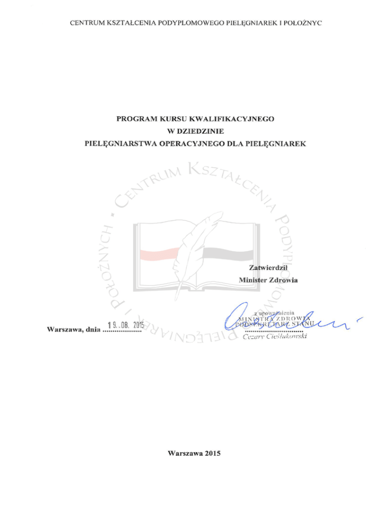 CENTRUM KSZTAŁCENIA PODYPLOMOWEGO PIELĘGNIAREK I POŁOŻNYC PROGRAM PRZYGOTOWANY PRZEZ ZESPÓŁ PROGRAMOWY W SKŁADZIE1 1. dr n. med. Tadeusz Paweł Wasilewski – Przewodniczący Zespołu; Katedra Chirurgii i Pielęgniarstwa Chirurgicznego, Wydział Nauk o Zdrowiu, Uniwersytet Medyczny w Lublinie; Zakład Pielęgniarstwa, Państwowa Wyższa Szkoła Zawodowa w Krośnie 2. mgr Monika Błach-Szydło – Centrum Onkologii Ziemi Radomskiej Sp. z o.o. w Radomiu 3. mgr Halina Idczak – Katedra i Zakład Promocji Zdrowia, Wydział Nauk o Zdrowiu Collegium Medicum im. L. Rydygiera w Bydgoszczy, Uniwersytet Mikołaja Kopernika w Toruniu 4. mgr Urszula Lipińska – Klinika Kardiochirurgii i Transplantologii, Instytut Kardiologii im. Prymasa Tysiąclecia Stefana Kardynała Wyszyńskiego w Warszawie 5. mgr Anna Nagadowska – Blok operacyjny, Instytut „Pomnik Centrum Zdrowia Dziecka” w Warszawie 6. dr n. med. Ewa Sztuczka – Oddział Chirurgii Ogólnej, Gastroenterologicznej i Onkologicznej, Wojewódzki Szpital Zespolony im. L. Rydygiera w Toruniu OSOBY WSPÓŁPRACUJĄCE dr n. med. Iwona Morawik – Samodzielny Publiczny Szpital Kliniczny Nr 4 w Lublinie RECENZENCI PROGRAMU 1. dr n. med. Katarzyna Cierzniakowska – Konsultant Wojewódzki w dziedzinie pielęgniarstwa chirurgicznego i operacyjnego; Zakład Pielęgniarstwa Chirurgicznego i Leczenia Ran Przewlekłych Wydział Nauk o Zdrowiu Collegium Medicum im. L. Rydygiera w Bydgoszczy, Uniwersytet Mikołaja Kopernika w Toruniu; Oddział Kliniczny Chirurgii Ogólnej, Gastroenterologicznej, Kolorektalnej i Onkologicznej Szpital Uniwersytecki nr 2 im. Dr. Jana Biziela w Bydgoszczy 2. mgr Barbara Dąbrowska – Prezes Ogólnopolskiego Stowarzyszenia Instrumentariuszek, Uniwersytecki Dziecięcy Szpital Kliniczny w Białymstoku 1 Powołany Zarządzeniem Dyrektora Centrum Kształcenia Podyplomowego Pielęgniarek i Położnych Nr 76/13 z dnia 26 listopada 2013 r. w sprawie powołania Zespołu do spraw Opracowania Programu Kształcenia Podyplomowego Pielęgniarek i Położnych. str. 2 CENTRUM KSZTAŁCENIA PODYPLOMOWEGO PIELĘGNIAREK I POŁOŻNYC 1. ZAŁOŻENIA ORGANIZACYJNO-PROGRAMOWE Rodzaj kształcenia Kurs kwalifikacyjny jest to rodzaj kształcenia, który zgodnie z ustawą z dnia 15 lipca 2011 r. o zawodach pielęgniarki i położnej (Dz. U. z 2014 r., poz. 1435, z późn. zm.) ma na celu uzyskanie przez pielęgniarkę lub położną wiedzy i umiejętności do udzielania określonych świadczeń zdrowotnych wchodzących w zakres danej dziedziny pielęgniarstwa lub dziedziny mającej zastosowanie w ochronie zdrowia. Efekty kształcenia wskazane w programie kursu kwalifikacyjnego w dziedzinie pielęgniarstwa operacyjnego dla pielęgniarek są dla organizatora i uczestnika kształcenia obowiązkowym elementem programu. Osiągnięcie wskazanych efektów kształcenia gwarantuje, że każdy uczestnik kursu kwalifikacyjnego będzie posiadać takie same kwalifikacje, niezależnie od miejsca ukończenia kształcenia, podmiotu organizującego kształcenie oraz systemu kształcenia. Cel kształcenia Przygotowanie pielęgniarki do realizacji zadań zawodowych na bloku operacyjnym w zakresie instrumentowania do zabiegów operacyjnych w chirurgii ogólnej, chirurgii jednego dnia, chirurgii noworodka i niemowlęcia, chirurgii ortopedycznej i traumatologicznej z podstawami neurochirurgii oraz w ginekologii operacyjnej i położnictwie. Czas trwania kształcenia Łączna liczba godzin przeznaczonych na realizację programu kursu kwalifikacyjnego w kontakcie z wykładowcą/opiekunem stażu wynosi 365 godzin dydaktycznych: zajęcia teoretyczne – 155 godzin, zajęcia praktyczne – 210 godzin. Organizator kształcenia w porozumieniu z kierownikiem kursu, ma prawo dokonać modyfikacji czasu trwania zajęć teoretycznych. Oznacza to, że 80% łącznej liczby godzin przeznaczonych na realizację programu nie podlega zmianie. Wskazane 20%, co stanowi nie więcej niż 73 godziny, może być wykorzystane na samokształcenie. Sposób organizacji Za przebieg i organizację kursu kwalifikacyjnego odpowiedzialny jest organizator kształcenia. Planując realizację kształcenia, organizator powinien: 1. Opracować regulamin organizacyjny kursu kwalifikacyjnego, który w szczególności określa: organizację; zasady i sposób naboru osób; prawa i obowiązki osób uczestniczących; zakres obowiązków kadry dydaktycznej prowadzącej nauczanie teoretyczne i praktyczne; zasady przeprowadzenia egzaminu końcowego. 2. Powołać kierownika kursu kwalifikacyjnego. Do zadań kierownika kursu oprócz zadań określonych w przepisach Ministra Zdrowia z tego zakresu powinno należeć: współdecydowanie o doborze kadry dydaktycznej; przedstawienie uczestnikom kursu: celu, programu i organizacji kształcenia; ocenianie placówek szkolenia praktycznego wg specyfiki i organizacji zajęć; str. 3 CENTRUM KSZTAŁCENIA PODYPLOMOWEGO PIELĘGNIAREK I POŁOŻNYC pomaganie w rozwiązywaniu problemów; udzielanie indywidualnych konsultacji uczestnikom kursu; zbieranie i analizowanie opinii o przebiegu kursu. Przeprowadzić postępowanie kwalifikacyjne. Powołać wykładowców posiadających kwalifikacje określone w programie kursu. Powołać w uzgodnieniu z kierownikiem kursu opiekunów szkolenia praktycznego, którzy powinni być merytorycznymi pracownikami placówek, w których odbywa się szkolenie praktyczne. Do zadań opiekuna szkolenia praktycznego należy: instruktaż wstępny (zapoznanie z celem szkolenia praktycznego, z organizacją pracy, wyposażeniem placówki, jej personelem, zakresem udzielanych świadczeń i in.); instruktaż bieżący (organizacja i prowadzenie zajęć, kontrola nad ich prawidłowym przebiegiem, pomoc w rozwiązywaniu problemów i in.); instruktaż końcowy (omówienie i podsumowanie zajęć, zaliczenie zadań zawodowych określonych w programie kształcenia, ocena uzyskanych wiadomości i umiejętności). Zapewnić bazę dydaktyczną do szkolenia teoretycznego