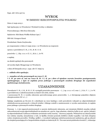 Sygn. akt I ACa 337/15 WYROK W IMIENIU RZECZYPOSPOLITEJ POLSKIEJ Dnia 27 maja 2015 r. Sąd Apelacyjny we Wrocławiu I Wydział Cywilny w składzie: Przewodniczący: SSA Ewa Głowacka Sędziowie: SSA Beata Wolfke-Kobzar (spr.)` SSO del. Grzegorz Karaś Protokolant: Beata Grzybowska po rozpoznaniu w dniu 27 maja 2015 r. we Wrocławiu na rozprawie sprawy z powództwa U. H., J. H., B. H. i I. K. przeciwko (...) Sp. z o.o. w Z. i (...)S.A. (...)w W. o zapłatę na skutek apelacji obu pozwanych od wyroku Sądu Okręgowego we Wrocławiu z dnia 28 listopada 2014 r. sygn. akt I C 1659/13 1. oddala obie apelacje; 2. zasądza od obu pozwanych na rzecz U. H. i J. H. po 900 zł, zaś na rzecz B. H. i I. K. po 1.800 zł tytułem zwrotu kosztów postępowania apelacyjnego, z tym że zapłata przez jednego z pozwanych zwalnia drugiego do wysokości spełnionego świadczenia. UZASADNIENIE Powodowie U. H., J. H., B. H. i I. H. wystąpili przeciwko pozwanym – (...) sp. z o.o. w Z. oraz (...) S.A. V. (...) w W. z powództwem o zadośćuczynienie za śmierć ich córki, siostry i narzeczonej M. H. w wyniku zdarzenia spowodowanego przez pracownika (...), kierującego pojazdem objętym ubezpieczeniem OC w (...) Żądając zasądzenia po 80.000 zł z odsetkami na rzecz każdego z nich powodowie wskazali na odpowiedzialność odszkodowawczą pozwanych z różnych tytułów i dlatego wnieśli o zamieszczenie w wyroku zastrzeżenia, że zapłata przez jednego z pozwanych zwalnia drugiego. Pozwany (...) nie negował przytoczonych w pozwie okoliczności zdarzenia, ani cierpienia bliskich zmarłej, jednak zakwestionował swoją odpowiedzialność na zasadzie art. 430 kc. Jego zdaniem, właściwy byłby tu art. 436 kc, jednak i tę odpowiedzialność wyklucza ewidentne zawinienie osoby trzeciej – kierowcy pojazdu. Wskazał też na oskarżycielski ton rodziny zmarłej, niezasłużony o tyle, że Spółka również poniosła dotkliwe skutki wypadku i nie była obojętna wobec cierpienia powodów. Według spółki (...) wysokość żądanego zadośćuczynienia jest nadmierna, gdy ją odnosić do cierpień pozostających w bezpośrednim związku ze śmiercią M. H.. Ten sam zarzut podniosła również C., wskazując dodatkowo, że powodowie uzyskali już odpowiednie zadośćuczynienie w wyroku skazującym sprawcę wypadku. C. zarzuciła też, że odsetki od uwzględnionego ewentualnie świadczenia winny być zasądzone od daty wyrokowania. W toku sporu rodzice zmarłej rozszerzyli powództwo o 40.000 zł na rzecz każdego z nich, zaś I. K. (partner życiowy zmarłej ) – o 20.000 zł). Wyrokiem z 28.11.2014 r. Sąd Okręgowy zasądził od pozwanych, zastrzegając ich odpowiedzialność in solidum, po 107.000 zł na rzecz U. H. i J. H. (rodziców zmarłej), 71.000 zł na rzecz B. H. (brata) oraz 95.000 zł na rzecz I. K. (partnera zmarłej) wraz z odsetkami ustawowymi od 31.03.2013 r. od 14.05. ( (...)) i od 14.05.2013 r. ( (...)) z tym, że współodpowiedzialność pozwanych w zakresie odsetek przyjął za okres od 14.05.2013 r. do dnia zapłaty. Współodpowiedzialność pozwanych Sad Okręgowy przyjął także co do kosztów procesu, w tym brakujących opłat sądowych. Wyrok zaskarżyli oboje pozwani, którzy w odrębnych apelacjach wnieśli o jego zmianę przez zmniejszenie przyznanego powodom zadośćuczynienia: U. H. i J. H. do 67.000 zł (o 40.000 zł), B. H. do 31.000 zł (o 40.000 zł), I. K. do 75.000 zł (o 20.000 zł). Pozwana C. zaskarżyła też orzeczenie odsetkowe, domagając się jego zmiany przez zasądzenie odsetek od daty wyrokowania. Oboje pozwani zarzucili zawyżenie przyznanego zadośćuczynienia, co narusza art. 446 § 4 kc i jest skutkiem naruszenia art. 233 § 1 kpc, polegającego na dowolnej i nie dość wnikliwej ocenie dowodów powołanych dla wykazania rozmiaru krzywdy powodów. W apelacji pozwanego (...) pojawił się także zarzut zaniechania zasięgnięcia opinii biegłego w sytuacji, gdy przyjęto, że cierpienia powodów przekraczały przeciętną miarę. W obu apelacjach podkreślono, że nie mogą pozwanych obciążać skutki choroby, na którą cierpi J. H. oraz, że B. H. i I. K. są osobami młodymi, z perspektywą, toteż odczuwanie cierpienia z czasem maleje. Powodowie domagali się oddalenia apelacji i przyznania im kosztów postępowania apelacyjnego. Sąd Apelacyjny zważył: Stan faktyczny sprawy jest w istocie niesporny. Niespornym jest w szczególności, że: - M. H. zmarła 2.01.2012 r., kiedy to znajdując się na pasie awaryjnym autostrady (...) w oczekiwaniu na pomoc drogową, została uderzona przez samochód. Auto, którym podróżowała, zostało przesunięte i obrócone w wyniku uderzenia w nie samochodu ciężarowego V., kierowanego przez pozostającego pod wpływem amfetaminy M. B., kierowcę zatrudnionego przez pozwanego (...); - kierowca samochodu V. został prawomocnie skazany za ten czyn i w postępowaniu karnym wykluczono przyczynienie się ofiary zdarzenia; - samochód V. był objęty ubezpieczeniem OC udzielonym przez pozwaną (...); - w wyroku karnym zasądzono od sprawcy wypadku zadośćuczynienie po 13.000 zł na rzecz U. H. i J. H., 9.000 zł na rzecz B. H. oraz 5.000 zł na rzecz I. K., lecz dotąd powodowie nie uzyskali zasądzonego na podstawie art. 46 § 1 kk świadczenia. Bezspornym jest także, ze rodzice i brat zmarłej byli z nią bardzo związani oraz, ze powód I. K. od 2008 roku tworzył z nią udany związek, planowali wkrótce zaręczyny, ślub, później wspólne dzieci. Niespornym jest wreszcie, że dla wszystkich powodów śmierć M. H. była szokującym i bardzo bolesnym przeżyciem. Wywołała u nich ciągle obecny ból, smutek i dolegliwości somatyczne, nadto zdezorganizowała ich życie, początkowo ukierunkowując je także na właściwy i skuteczny przebieg postępowania karnego. Sąd Okręgowy obszernie i szczegółowo ustalił zarówno relacje zmarłej z rodzicami, bratem i partnerem, jak i skutki zdarzenia, które odczuwa