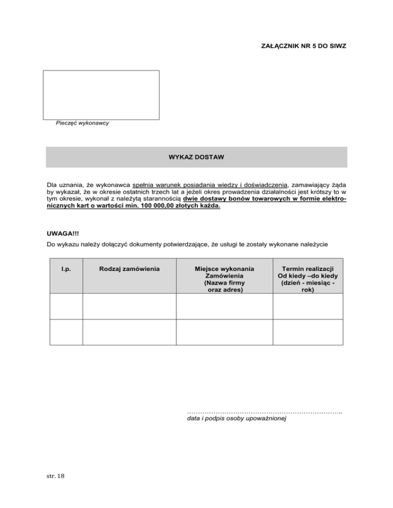 ZAŁĄCZNIK NR 5 DO SIWZ Pieczęć wykonawcy WYKAZ DOSTAW Dla uznania, że wykonawca spełnia warunek posiadania wiedzy i doświadczenia, zamawiający żąda by wykazał, że w okresie ostatnich trzech lat a jeżeli okres prowadzenia działalności jest krótszy to w tym okresie, wykonał z należytą starannością dwie dostawy bonów towarowych w formie elektronicznych kart o wartości min. 100 000,00 złotych każda. UWAGA!!! Do wykazu należy dołączyć dokumenty potwierdzające, że usługi te zostały wykonane należycie l.p. Rodzaj zamówienia Miejsce wykonania Zamówienia (Nazwa firmy oraz adres) Termin realizacji Od kiedy –do kiedy (dzień - miesiąc rok) …………………………………………………………….. data i podpis osoby upoważnionej str. 18