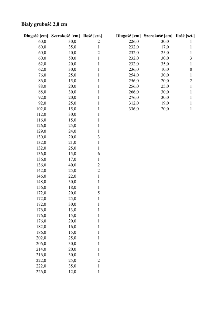 Biały grubość 2,0 cm Długość [cm] Szerokość [cm] Ilość [szt.] 60,0 30,0 2 60,0 35,0 1 60,0 40,0 2 60,0 50,0 1 62,0 20,0 1 62,0 30,0 1 76,0 25,0 1 86,0 15,0 1 88,0 20,0 1 88,0 30,0 1 92,0 20,0 1 92,0 25,0 1 102,0 15,0 1 112,0 30,0 1 116,0 15,0 1 126,0 25,0 1 129,0 24,0 1 130,0 20,0 3 132,0 21,0 1 132,0 25,0 1 136,0 15,0 6 136,0 17,0 1 136,0 40,0 2 142,0 25,0 2 146,0 22,0 1 148,0 30,0 1 156,0 18,0 1 172,0 20,0 5 172,0 25,0 1 172,0 30,0 1 176,0 13,0 1 176,0 15,0 1 176,0 20,0 1 182,0 16,0 1 186,0 15,0 1 202,0 25,0 1 206,0 30,0 1 214,0 20,0 1 216,0 30,0 1 222,0 25,0 2 222,0 35,0 1 226,0 12,0 1 Długość [cm] Szerokość [cm] Ilość [szt.] 226,0 30,0 1 232,0 17,0 1 232,0 25,0 1 232,0 30,0 3 232,0 35,0 1 236,0 10,0 8 254,0 30,0 1 256,0 20,0 2 256,0 25,0 1 266,0 30,0 1 276,0 30,0 1 312,0 19,0 1 336,0 20,0 1