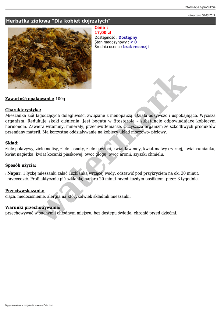 Informacje o produkcie Utworzono 08-03-2017 Herbatka ziołowa "Dla kobiet dojrzałych" Cena : 17,00 zł er m ar k Dostępność : Dostępny Stan magazynowy : < 0 Średnia ocena : brak recenzji Zawartość opakowania: 100g Charakterystyka: Mieszanka ziół łagodzących dolegliwości związane z menopauzą. Działa odżywczo i uspokajająco. Wycisza organizm. Redukuje skoki ciśnienia. Jest bogata w fitosterole – substancje odpowiadające kobiecym hormonom. Zawiera witaminy, minerały, przeciwutleniacze. Oczyszcza organizm ze szkodliwych produktów przemiany materii. Ma korzystne oddziaływanie na kobiecy układ moczowo- płciowy. Skład: ziele pokrzywy, ziele melisy, ziele jasnoty, ziele nawłoci, kwiat lawendy, kwiat malwy czarnej, kwiat rumianku, kwiat nagietka, kwiat kocanki piaskowej, owoc głogu, owoc aronii, szyszki chmielu. Sposób użycia: Napar: 1 łyżkę mieszanki zalać 1szklanką wrzącej wody, odstawić pod przykryciem na ok. 30 minut, przecedzić. Profilaktycznie pić szklankę naparu 20 minut przed każdym posiłkiem przez 3 tygodnie. at ● Przeciwwskazania: ciąża, niedociśnienie, alergia na którykolwiek składnik mieszanki. w Warunki przechowywania: przechowywać w suchym i chłodnym miejscu, bez dostępu światła; chronić przed dziećmi. Wygenerowano w programie www.oscGold.com