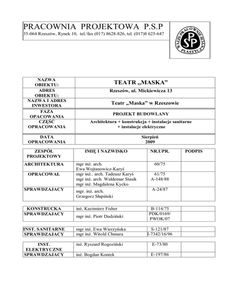 PRACOWNIA PROJEKTOWA P.S.P 35-064 Rzeszów, Rynek 10, tel./fax (017) 8628-826, tel. (017)8 625-647 NAZWA OBIEKTU: ADRES OBIEKTU: NAZWA I ADRES INWESTORA FAZA OPACOWANIA CZ OPRACOWANIA TEATR ,,MASKA” Rzeszów, ul. Mickiewicza 13 Teatr „Maska” w Rzeszowie PROJEKT BUDOWLANY Architektura + konstrukcja + instalacje sanitarne + instalacje elektryczne DATA OPRACOWANIA Sierpie 2009 ZESPÓ PROJEKTOWY IMI I NAZWISKO NR.UPR. ARCHITEKTURA mgr in . arch. Ewa Wojtanowicz-Kary mgr in .. arch. Tadeusz Kary mgr in . arch. Waldemar Stasik mgr in . Magdalena Kycko 60/75 OPRACOWA SPRAWDZAJACY mgr. in . arch. Grzegorz S api ski KONSTRUCKA SPRAWDZAJACY in . Kazimierz Fisher mgr in . Piotr Dudzi ski 61/75 A-148/88 A-24/87 B-114/75 PDK/0169/ PWOK/07 INST. SANITARNE SPRAWDZAJACY mgr in . Ewa Wierzy ska mgr in . Witold Chmura S-121/87 I-7342/16/96 INST. ELEKTRYCZNE SPRAWDZAJACY in . Ryszard Rogozi ski E-73/80 in . Bogdan Kontek E-197/86 PODPIS Opracowanie zawiera: 1. Za czniki: - wiadczenie projektantów o zgodno ci sporz dzonego projektu z obowi zuj cymi przepisami i zasadami wiedzy technicznej; Decyzja Wojewódzkiego Urz du Ochrony Zabytków na pozwolenie prac remontowo – budowlanych; Uprawnienia budowlane projektantów oraz za wiadczenia o przynale no ci projektantów do Izb bran owych; Decyzja o warunkach zabudowy AR.I.54.7331/12/09; Analiza urbanistyczna do decyzji o warunkach zabudowy AR.I.54.7331/12/09; Wypis z rejestru gruntów; Wyrys z mapy ewidencji gruntów. 2. Informacja dotycz ca bezpiecze stwa i ochrony zdrowia 3. Cz architektoniczna 3.1. Opis techniczny 3.2. Cz rysunkowa: - zagospodarowanie terenu - rzut piwnic - rzut parteru - rzut parteru: schody zewn trzne, zadaszenie wej cia, winda dla niepe nosprawnych - rzut parteru: sanitariaty ogólnodost pne, sanitariaty dla osób niepe nosprawnych - rzut pi tra - przekrój A-A - przekrój B-B, C-C - elewacja po udniowa 2 - elewacja wschodnia - elewacja pó nocna - elewacja zachodnia docieplenie ciany rys. nr 1 rys. nr 2 rys. nr 3 rys. nr 4 rys. nr 5 rys. nr 6 rys. nr 7 rys. nr 8 rys. nr 9 rys. nr 10 rys. nr 11 rys. nr 12 4. Cz konstrukcyjna 4.1. Ekspertyza konstrukcyjna – orzeczenie techniczne dotycz ce stanu technicznego budynku wraz z ocen mo liwo ci zmiany sposobu ytkowania pomieszcze gastronomicznych na potrzeby Teatru „Maska” wraz z przystosowaniem Teatru dla osób niepe nosprawnych oraz zmiany zadaszenia nad wej ciem g ównym budynku 4.2. Opis techniczny 4.3. Cz rysunkowa - Rzut fundamentów - Schemat konstrukcji piwnic - Schemat konstrukcji parteru - Schemat konstrukcji stropu nad parterem - Schemat konstrukcji pietra - Schemat konstrukcji stropu nad pi trem i wi by dachowej rys. nr 1 rys. nr 2 rys. nr 3 rys. nr 4 rys. nr 5 rys. nr 6 5. Instalacje elektryczne 5.1. Opis techniczny 6. Instalacja wodoci gowa, instalacje kanalizacji deszczowej 6.1. Opis techniczny. 6.2. Cz rysunkowa - Rzut piwnic- wod.-kan. - Rzut parteru- wod.-kan. - Rzut pi tra- wod.-kan. rys. nr 1 rys. nr 2 rys. nr 3 WIADCZENIE INWESTOR: Teatr „Maska” w Rzeszowie, ul. Mickiewicza 13 ADRES: ul. Mickiewicza 13, Rzeszów wiadczam e projekt budowlany ZMIANY SPOSOBU U YTKOWANIA POMIESZCZE GASTRONOMICZNYCH TETRU „MASKA” – NA POTRZEBY TEATRU W RZESZOWIE PRZY UL. MICKIEWICZA ORAZ BUDOWA ZADASZENIA zosta sporz dzony zgodnie z obowi zuj cymi przepisami i zasadami wiedzy technicznej. Projektanci: Architektura: mgr. in . arch. Ewa Wojtanowicz – Kary upr. Nr 60/72 SPRAWDZAJ CY mgr. in . arch. Grzegorz S api ski upr. Nr A-24/87 Konstrukcja: in . Kazimierz Fiszer upr. Nr B-114/75 SPRAWDZAJ CY Mgr in . Piotr Dudzi ski upr. Nr PDK/0169/PWOK/07 Instalacje sanitarne: Mgr in . Ewa Wierzy ska upr. S-121/87 SPRAWDZAJ CY Mgr in . Witold Chmura upr. Nr 5/96 Instalacje elektryczne: In . Ryszard Rogozi ski upr. E-173/80 SPRAWDZAJ CY In . Bogdan Kontek upr. E-197/86 I N F O R M A C J A DOTYCZ CA BEZPIECZE STWA I OCHRONY ZDROWIA OBIEKT: TEATR ,,MASKA” ADRES INWESTYCJI: RZESZÓW, ul. MICKIEWICZA 13 INWESTOR: TEATR ,,MASKA” OPRACOWA : arch. Ewa Wojtanowicz-Kary zam. Rzeszów, ul. Lwowska 8 SIERPIE 2009 r. CZ OPISOWA 1. ZAKRES ROBÓT ORAZ KOLEJNO REALIZACJI - prace przygotowawcze i organizacyjne; - usuni cie elementów dekoracyjnych i przepierze pozosta ych po pomieszczeniach restauracji oraz zadaszenia nad g ównym wej ciem; - wyburzenie istniej cych schodów zewn trznych; - wyburzenie ciany zewn trznej na wszystkich kondygnacjach cz cej nowy szyb windowy z pomieszczeniem teatru oraz otworu przeznaczonego na nowe g ówne wej cie do teatru; - wyburzenie istniej cego zadaszenia nad wej ciem do cz ci administracyjnej teatru; - wykonanie fundamentów oraz cian szybu windowego wraz z wykonaniem fundamentów i zadaszenia nad wej ciem g ównym z tarasem i dachem; - wykonanie s upów oraz galerii od strony pó nocnej; - monta balustrad przy tarasie i galerii; - wyburzenie cian dzia owych wewn trz parteru i piwnic budynku w miejscu nowoprojektowanych pomieszcze ; - zlikwidowanie kr tych schodów; - usuni cie p yt sufitu podwieszonego; - wykonanie nowego biegu schodów cz cych poziom sanitariatów z poziomem muzeum dobranocek; - wykonanie nowych cian dzia owych w piwnicy i na parterze budynku; - wykonanie cian dzia owych pomieszczenia kasy-kiosku na stela u stalowym, przeszklonym gór , do em zas oni tym p ytami gipsowokartonowymi; - wykonanie nowej instalacji elektrycznej; - wykonanie nowej instalacji Wod.-Kan.; - monta projektowanych i istniej cych drzwi; - malowanie wszystkich pomieszcze i wykonanie elementów wn trzarskich; - wykonanie nowego pod a w piwnicach; enie p ytek ceramicznych we wszystkich projektowanych pomieszczeniach; - monta balustrad i zabezpiecze przy istniej cych schodach cz cych muzeum dobranocek, holu szatniowego i kuluary; - wykonanie nowych schodów wej ciowych amfiteatralnych ob enie schodów kamieniem naturalnym granit; - wykonanie uzupe nie elewacji g ównej; - wykonanie docieplenia i elewacji od strony zachodniej. 2. WYKAZ ISTNIEJ CYCH OBIEKTÓW - kamienica przy u