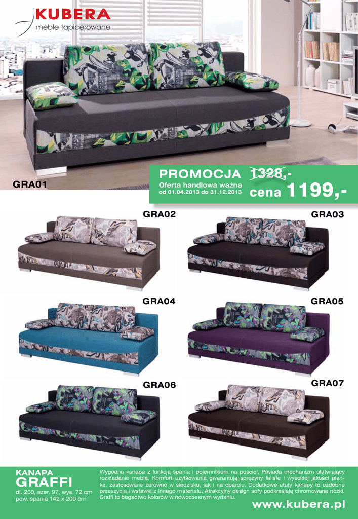 GRA01 KANAPA GRAFFI dł. 200, szer. 97, wys. 72 cm pow. spania 142 x 200 cm PROMOCJA 1328,Oferta handlowa ważna od 01.04.2013 do 31.12.2013 cena 1199,- GRA02 GRA03 GRA04 GRA05 GRA06 GRA07 Wygodna kanapa z funkcją spania i pojemnikiem na pościel. Posiada mechanizm ułatwiający rozkładanie mebla. Komfort użytkowania gwarantują sprężyny faliste i wysokiej jakości pianka, zastosowane zarówno w siedzisku, jak i na oparciu. Dodatkowe atuty kanapy to ozdobne przeszycia i wstawki z innego materiału. Atrakcyjny design sofy podkreślają chromowane nóżki. Graffi to bogactwo kolorów w nowoczesnym wydaniu. www.kubera.pl PROMOCJA NIC01 od 01.04.2013 do 31.12.2013 NIC02 NIC03 NIC04 NIC05 NAROŻNIK NICO 1760,cena 1599,- dł. 227, szer. 140, wys. 75 cm pow. spania 140 x 195 cm Nowoczesny, uniwersalny narożnik z funkcją spania i pojemnikiem na pościel. Dzięki swoim rozmiarom sprawdzi się także w mniejszym salonie. Możemy go ustawić jako prawo- lub lewostronny. Narożnik został zbudowany na sprężynie falistej i piance o podwyższonej wyporności, które znajdują się zarówno w siedzisku, jak i na oparciu mebla. Oryginalne wstawki z tkaniny na boczkach dodają Nico uroku i czynią z niego mebel wyjątkowy.. www.kubera.pl