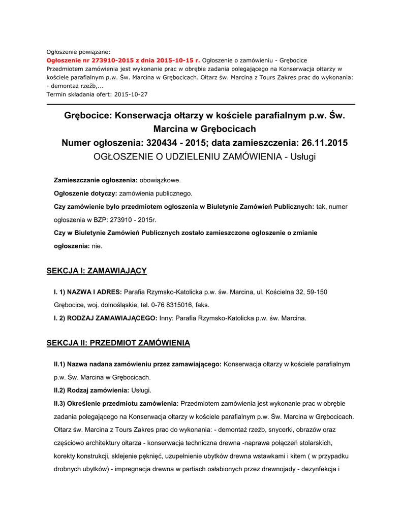 Ogłoszenie powiązane: Ogłoszenie nr 273910-2015 z dnia 2015-10-15 r. Ogłoszenie o zamówieniu - Grębocice Przedmiotem zamówienia jest wykonanie prac w obrębie zadania polegającego na Konserwacja ołtarzy w kościele parafialnym p.w. Św. Marcina w Grębocicach. Ołtarz św. Marcina z Tours Zakres prac do wykonania: - demontaż rzeźb,... Termin składania ofert: 2015-10-27 Grębocice: Konserwacja ołtarzy w kościele parafialnym p.w. Św. Marcina w Grębocicach Numer ogłoszenia: 320434 - 2015; data zamieszczenia: 26.11.2015 OGŁOSZENIE O UDZIELENIU ZAMÓWIENIA - Usługi Zamieszczanie ogłoszenia: obowiązkowe. Ogłoszenie dotyczy: zamówienia publicznego. Czy zamówienie było przedmiotem ogłoszenia w Biuletynie Zamówień Publicznych: tak, numer ogłoszenia w BZP: 273910 - 2015r. Czy w Biuletynie Zamówień Publicznych zostało zamieszczone ogłoszenie o zmianie ogłoszenia: nie. SEKCJA I: ZAMAWIAJĄCY I. 1) NAZWA I ADRES: Parafia Rzymsko-Katolicka p.w. św. Marcina, ul. Kościelna 32, 59-150 Grębocice, woj. dolnośląskie, tel. 0-76 8315016, faks. I. 2) RODZAJ ZAMAWIAJĄCEGO: Inny: Parafia Rzymsko-Katolicka p.w. św. Marcina. SEKCJA II: PRZEDMIOT ZAMÓWIENIA II.1) Nazwa nadana zamówieniu przez zamawiającego: Konserwacja ołtarzy w kościele parafialnym p.w. Św. Marcina w Grębocicach. II.2) Rodzaj zamówienia: Usługi. II.3) Określenie przedmiotu zamówienia: Przedmiotem zamówienia jest wykonanie prac w obrębie zadania polegającego na Konserwacja ołtarzy w kościele parafialnym p.w. Św. Marcina w Grębocicach. Ołtarz św. Marcina z Tours Zakres prac do wykonania: - demontaż rzeźb, snycerki, obrazów oraz częściowo architektury ołtarza - konserwacja techniczna drewna -naprawa połączeń stolarskich, korekty konstrukcji, sklejenie pęknięć, uzupełnienie ubytków drewna wstawkami i kitem ( w przypadku drobnych ubytków) - impregnacja drewna w partiach osłabionych przez drewnojady - dezynfekcja i dezynsekcja drewna - usunięcie wtórnych warstw kolorystycznych - usunięcie nieprawidłowych uzupełnień zaprawy - usunięcie nieprawidłowych uzupełnień drewna - renowacja zapraw -podklejenie złuszczeń i spękań, uzupełnienie ubytków - konserwacja /rekonstrukcja oryginalnego opracowania kolorystycznego: architektura ołtarza w kolorze czarnym, kolumny srebrzone, detal snycerski i dekoracja rzeźbiarska złoco-ne/srebrzone i polichromowane. - Konserwacja dwóch obrazów -oczyszczenie powierzchni, usunięcie werniksu i ewentualnych przemalowań , zespojenie rozdarć płótna i uzupełnienie ubytków podobrazia , podklejenie spękań zaprawy - prasowanie, ewentualny dublaż uzależniony od stanu płótna oryginalnego, uzupełnienie war-stwy malarskiej naśladowczo, werniksowanie. Ołtarz św. Rodziny Zakres prac do wykonania: - demontaż rzeźb, snycerki, oraz architektury ołtarza - konserwacja techniczna drewna -naprawa połączeń stolarskich, korekty konstrukcji, sklejenie pęknięć, uzupełnienie ubytków drewna wstawkami i kitem ( w przypadku drobnych ubytków) - impregnacja drewna w partiach osłabionych przez drewnojady - dezynfekcja i dezynsekcja drewna - rekonstrukcja rzeźby gołębicy -Ducha Świętego -na podstawie analogicznej rzeźby z ołtarza św. Anny - usunięcie wtórnych warstw kolorystycznych - usunięcie nieprawidłowych uzupełnień zaprawy - usunięcie nieprawidłowych uzupełnień drewna - renowacja zapraw - podklejenie złuszczeń i spękań, uzupełnienie ubytków - konserwacja /rekonstrukcja oryginalnego opracowania kolorystycznego architektury ołtarza rzeźb i detalu snycerskiego złocone/srebrzone i polichromowane. Należy założyć że detal snycerski oraz rzeźby (poza partiami karnacji) były w całości złocone/srebrzone. Kolorystykę partii architektonicznych ołtarza należy ustalić, wykonując odpowiednie badania. Ołtarz św. Anny Zakres prac do wykonania: - demontaż rzeźb, snycerki, oraz architektury ołtarza - konserwacja techniczna drewna -naprawa połączeń stolarskich, korekty konstrukcji, sklejenie pęknięć, uzupełnienie ubytków drewna wstawkami i kitem ( w przypadku drobnych ubytków) - impregnacja drewna w partiach osłabionych przez drewnojady - dezynfekcja i dezynsekcja drewna - usunięcie wtórnych warstw kolorystycznych usunięcie nieprawidłowych uzupełnień zaprawy - usunięcie nieprawidłowych uzupełnień drewna renowacja zapraw - podklejenie złuszczeń i spękań, uzupełnienie ubytków - konserwacja / rekonstrukcja oryginalnego opracowania kolorystycznego architektury ołtarza rzeźb i detalu snycerskiego złocone/srebrzone i polichromowane. Należy założyć że detal sny-cerski oraz rzeźby (poza partiami karnacji) były w całości złocone/srebrzone. Kolorystykę par-tii architektonicznych ołtarza należy ustalić, wykonując odpowiednie badania. Przedmiot zamówienia należy wykonać na podstawie PROGRAMU PRAC KONSERWATORSKICH załączonego do SIWZ. Wykonawca ma prawo w obecności przedstawiciela zamawiającego sprawdzić miejsce realizacji zamówienia i dokonać własnych pomiarów i analiz porównawczych. W tym celu należy się skontaktować z osobą upoważnioną do kontaktów (rozdział 8 pkt.5 niniejszej specyfikacji) celem ustalenia terminu wizyty. II.4) Wspólny Słownik Zamówień (CPV): 45.45.31.00-8. SEKCJA III: PROCEDURA III.1) TRYB UDZIELENIA ZAMÓWIENIA: Przetarg nieograniczony III.2) INFORMACJE ADMINISTRACYJNE Zamówienie dotyczy projektu/programu finansowanego ze środków Unii Europejskiej: nie SEKCJA IV: UDZIELENIE ZAMÓWIENIA IV.1) DATA UDZIELENIA ZAMÓWIENIA: 24.11.2015. IV.2) LICZBA OTRZYMANYCH OFERT: 8. IV.3) LICZBA ODRZUCONYCH OFERT: 2. IV.4) NAZWA I ADRES WYKONAWCY, KTÓREMU UDZIELONO ZAMÓWIENIA: Konserwacja Dzieł Sztuki Bogusław Krówka, Ul. Z. Wyrobka 9, 30-217 Kraków, kraj/woj. małopolskie. IV.5) Szacunkowa wartość zamówienia (bez VAT): 284508,00 PLN. IV.6) INFORMACJA O CENIE WYBRANEJ OFERTY ORAZ O OFERTACH Z NAJNIŻSZĄ I NAJWYŻSZĄ CENĄ Cena wy