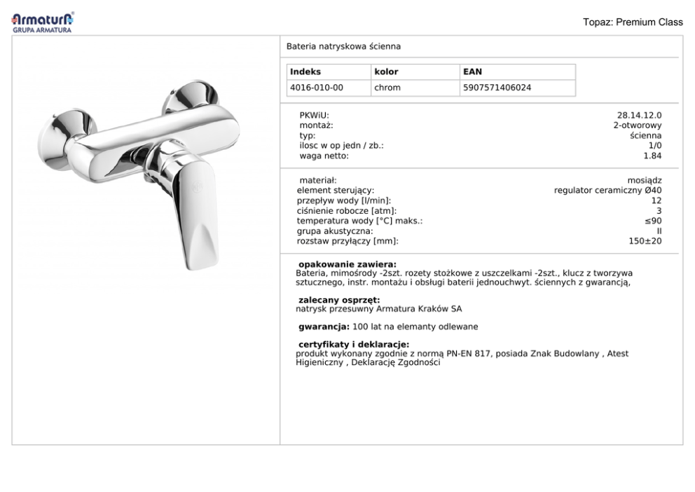 Topaz: Premium Class Bateria natryskowa ścienna Indeks kolor EAN 4016-010-00 chrom 5907571406024 PKWiU: montaż: typ: ilosc w op jedn / zb.: waga netto: materiał: element sterujący: przepływ wody [l/min]: ciśnienie robocze [atm]: temperatura wody [°C] maks.: grupa akustyczna: rozstaw przyłączy [mm]: 28.14.12.0 2-otworowy ścienna 1/0 1.84 mosiądz regulator ceramiczny Ø40 12 3 ≤90 II 150±20 opakowanie zawiera: Bateria, mimośrody -2szt. rozety stożkowe z uszczelkami -2szt., klucz z tworzywa sztucznego, instr. montażu i obsługi baterii jednouchwyt. ściennych z gwarancją, zalecany osprzęt: natrysk przesuwny Armatura Kraków SA gwarancja: 100 lat na elemanty odlewane certyfikaty i deklaracje: produkt wykonany zgodnie z normą PN-EN 817, posiada Znak Budowlany , Atest Higieniczny , Deklarację Zgodności Topaz: Premium Class Topaz: Premium Class