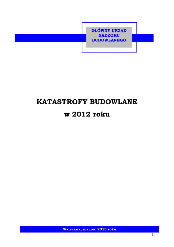 GŁÓWNY URZĄD NADZORU BUDOWLANEGO KATASTROFY BUDOWLANE w 2012 roku Warszawa, marzec 2013 roku 1 1. WSTĘP Katastrofą budowlaną jest niezamierzone, gwałtowne zniszczenie obiektu budowlanego lub jego części, a także konstrukcyjnych elementów rusztowań, elementów formujących, ścianek szczelnych i obudowy wykopów (art. 73 ust.1 ustawy – Prawo budowlane) Główny Urząd Nadzoru Budowlanego prowadzi monitoring katastrof budowlanych. Informacje o katastrofach przekazują do GUNB powiatowi lub wojewódzcy inspektorzy nadzoru budowlanego w ramach zadań i kompetencji określonych w art. 76 ust.1 pkt 2 ustawy. Postępowanie wyjaśniające w sprawie przyczyn katastrof prowadzi właściwy miejscowo organ nadzoru budowlanego I instancji – powiatowy lub wojewódzki inspektor nadzoru budowlanego (art. 76 ust.1 pkt 1 w związku z art. 74 ustawy – Prawo budowlane). Postępowanie to może przejąć organ wyższego stopnia – wojewódzki inspektor nadzoru budowlanego oraz Główny Inspektor Nadzoru Budowlanego (art. 77 ustawy ). Osoby winne powstania katastrofy budowlanej podlegają odpowiedzialności zawodowej oraz karnej. Odpowiedzialność zawodowa dotyczy osób pełniących samodzielne funkcje techniczne w budownictwie, tj. projektanta, kierownika budowy (robót), inspektora nadzoru inwestorskiego, którzy posiadają odpowiednie uprawnienia budowlane i są członkami właściwej okręgowej izby zawodowej. W Głównym Urzędzie Nadzoru Budowlanego jest prowadzony elektroniczny Rejestr Katastrof Budowlanych (opracowany z udziałem środków UE) – do którego dane o zaistniałych katastrofach wprowadzają terenowe organy nadzoru budowlanego. Dostęp do Rejestru Katastrof Budowlanych (RKB) mają tylko upoważnieni przedstawiciele organów nadzoru budowlanego. Na podstawie danych wprowadzonych do Rejestru, w GUNB, w pierwszych miesiącach każdego roku, dokonuje się analizy katastrof budowlanych zaistniałych w poprzednim roku. Wyniki analizy są publikowane na stronie internetowej GUNB (www.gunb.gov.pl). Analizę katastrof budowlanych zaistniałych w 2012 r. przeprowadzono na podstawie danych uzyskanych z RKB w dn. 19.02.2013 r. 2. KATASTROFY BUDOWLANE W 2012 ROKU 2.1. Katastrofy budowlane w Polsce w latach 1995-2012 Katastrofy budowlane w Polsce w latach 1995-2012 1200 1113 1000 800 731 648 620 600 426 400 338 316 327 228 200 89 51 264 167 101 75 187 126 132 20 12 r. r. r. 11 20 r. 10 20 r. 09 20 r. 08 20 r. 07 20 r. 06 20 r. 05 20 r. 04 20 03 20 r. 02 20 r. 01 20 r. 00 20 r. 99 19 r. 98 19 r. 97 19 r. 95 96 19 19 r. 0 2 W latach 1995-2012 w Polsce miało miejsce 5939 katastrof budowlanych (średnio 330 katastrof w roku). W 2012 roku zarejestrowano 426 katastrof budowlanych tj. o 222 katastrofy mniej niż w 2011 r. (w którym wystąpiło 648 katastrof budowlanych) i o 305 katastrof mniej niż w 2010 r. (w którym wystąpiło 731 katastrof budowlanych). 2.2. Katastrofy budowlane w podziale na województwa W 2012 r. (podobnie jak w latach poprzednich) katastrofy budowlane odnotowano we wszystkich województwach, od 5 katastrof w woj. lubelskim, lubuskim, warmińskomazurskim i zachodniopomorskim do 88 katastrof w woj. mazowieckim. Ich rozkład, w układzie poszczególnych województw, zilustrowano na rys. 1. Najwięcej katastrof miało miejsce w województwach: - mazowieckim – 88 katastrof (20,6% ogólnej liczby katastrof), - kujawsko-pomorskim – 58 katastrof (13,6% ogólnej liczby katastrof), - podlaskim – 55 katastrof (12,9% ogólnej liczby katastrof), - pomorskim – 54 katastrofy (12,7% ogólnej liczby katastrof). Liczba katastrof budowlanych w pozostałych województwach: - lubelskie, lubuskie, warmińsko-mazurskie i zachodniopomorskie – po 5 katastrof, - śląskie – 11 katastrof, - świętokrzyskie – 12 katastrof, - dolnośląskie – 14 katastrof, - małopolskie – 15 katastrof, - łódzkie – 22 katastrofy, - opolskie – 24 katastrofy, - podkarpackie – 25 katastrof, - wielkopolskie – 28 katastrof. 2.3. Katastrofy budowlane w podziale na kategorie Zgodnie z podziałem przyjętym na potrzeby Rejestru Katastrof Budowlanych, katastrofy dzielone są na dwie kategorie: • kategorię I – obejmującą katastrofy nie wynikające ze zdarzeń losowych, • kategorię II – obejmującą katastrofy wynikające z przyczyn losowych. Zalicza się do nich katastrofy powstałe na skutek działania sił natury (powodzie, silne wiatry, obfity śnieg, uderzenia pioruna), jak również na skutek wybuchu gazu, uderzenia samochodu w budynek, wybuchu kotłów c.o., itp. Struktura katastrof budowlanych, które miały miejsce w 2012 r. z punktu widzenia podziału na powyższe kategorie, według wstępnych zgłoszeń zawartych w RKB w dn.19.02.2013 r., jest następująca (rys. 2): • 72 katastrofy zaliczono do kategorii I – czyli katastrof nie wynikających z przyczyn losowych (16,9% ogólnej liczby katastrof), • 345 katastrof zaliczono do kategorii II – wynikających z przyczyn losowych (81% ogólnej liczby katastrof), • 9 katastrof nie zakwalifikowano z uwagi na brak danych. Na 426 katastrof zaistniałych w 2012 r. do dnia sporządzania analizy w stosunku do 212 (49,8% wszystkich katastrof) zakończono postępowania wyjaśniające, dotyczące zbadania przyczyn i okoliczności wystąpienia, ustalając, że 50 katastrof to katastrofy kategorii I, a 162 katastrofy kategorii II. 3 Strukturę katastrof budowlanych, w stosunku do których zakończono postępowania wyjaśniające, w układzie wojewódzkim w podziale na kategorie zilustrowano na rys. 3. 2.4. Struktura katastrof budowlanych z uwagi na czas ich wystąpienia W 2012 r., tak jak w układzie wieloletnim, przeważająca część katastrof budowlanych (około 90% ogólnej liczby katastrof) miała miejsce w obiektach budowlanych oddanych do użytkowania (rys. 4). I tak: 1) 384 katastrofy (90,1% ogólnej liczby katastrof) wydarzyły się podczas eksploatacji obiektów budowlanych, w tym: • 370 katastrof (86,9% ogólnej 
