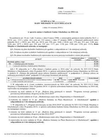 Projekt z dnia 5 września 2016 r. Zatwierdzony przez ......................... UCHWAŁA NR .................... RADY MIEJSKIEJ W GŁUCHOŁAZACH z dnia 14 września 2016 r. w sprawie zmian w budżecie Gminy Głuchołazy na 2016 rok Na podstawie art. 18 ust. 2 pkt. 4 ustawy z dnia 8 marca 1990r. o samorządzie gminnym (tekst jednolity Dz.U. z 2015r. poz. 1515 z późn. zm.) oraz art. 212 ustawy z dnia 27 sierpnia 2009r. o finansach publicznych (tekst jednolity Dz.U. z 2013r. poz. 885; zm. 2013r. poz. 938, poz. 1646; z 2014r. poz. 379, poz. 911, poz. 1146. poz. 1626, poz. 1877; z 2015r. poz. 238. poz. 532. poz. 1117, poz. 1130, poz. 1190, poz. 1358, poz. 1513), Rada Miejska w Głuchołazach uchwala, co następuje: § 1. Zmienia się plan dochodów budżetowych zgodnie z załącznikiem nr 1 do niniejszej uchwały. § 2. Zwiększa się plan wydatków budżetowych zgodnie z załącznikiem nr 2 do niniejszej uchwały. § 3. Do planu rozchodów budżetowych wprowadza się nową pozycję rozchodów o treści jak poniżej: zmniejszenie planu rozchodów paragraf Rozchody ogółem, z tego: 991 Udzielone pożyczki i kredyty 1 pożyczki udzielone z budżetu gminy Głuchołazy zwiększenie planu rozchodów 40.200 40.200 40.200 § 4. 1. W załączniku nr 5 „Plan dotacji z budżetu gminy w 2016 roku” do uchwały Nr XIV/132/15 Rady Miejskiej w Głuchołazach z dnia 30 grudnia 2015r. w sprawie uchwalenia budżetu Gminy Głuchołazy na 2016 rok, w punkcie II. „Dotacje dla jednostek spoza sektora finansów publicznych” w podpunkcie 2 „Dotacje celowe na realizację pozostałych zadań” podpunkt 4.9 otrzymuje brzmienie jak poniżej: lp. 4.9 przedmiot dotacji (zadanie) dotacja przeznaczona na krzewienie i rozwój edukacji, kultury i sztuki wśród dla osób starszych dział dz. 801 - Oświata i wychowanie rozdział rozdz. 80195 - Pozostała działalność kwota dotacji 7 000 2. W załączniku nr 6 „Limit wydatków inwestycyjnych na 2016 roku” do uchwały Nr XIV/132/15 Rady Miejskiej w Głuchołazach z dnia 30 grudnia 2015r. w sprawie uchwalenia budżetu Gminy Głuchołazy na 2016 rok, wprowadza się następujące zmiany: 1) zmienia się treść zadania nr 10 pn. „Budowa dróg gminnych w ramach powiatowej infrastruktury drogowej na lata 2016-2019” "Programu rozwoju gminnej i 2) zmienia się treść zadania nr 22 pn. „Modernizacja części ulicy Magistrackiej w Głuchołazach”, 3) wykreśla się zadanie nr 31 pn. „Budowa fontanny na Placu Basztowym załącznikiem nr 3 do niniejszej uchwały. w Głuchołazach” zgodnie z 3. W załączniku nr 7 „Program inwestycyjny na lata 2016-2019” do uchwały Nr XIV/132/15 Rady Miejskiej w Głuchołazach z dnia 30 grudnia 2015r. w sprawie uchwalenia budżetu Gminy Głuchołazy na 2016 rok, wprowadza się następujące zmiany: 1) zmienia się treść zadania nr 11 pn. „Budowa dróg gminnych w ramach powiatowej infrastruktury drogowej na lata 2016-2019"” "Programu rozwoju gminnej i 2) zmienia się treść zadania nr 28 pn. „Modernizacja części ulicy Magistrackiej w Głuchołazach”, 3) wprowadza się nowe zadanie nr 38 pn. „Budowa fontanny na Placu Basztowym w Głuchołazach”, zgodnie z załącznikiem nr 4 do niniejszej uchwały. Id: EC6C7C6B-ED74-47C9-AAFE-BAF43D631004. Projekt Strona 1 4. W załączniku nr 8 „Wydatki na wieloletnie programy i projekty realizowane ze środków pochodzących z budżetu Unii Europejskiej, z niepodlegających zwrotowi środków pochodzących z pomocy udzielanej przez państwa członkowskie Europejskiego Porozumienia o Wolnym Handlu (EFTA) oraz innych środków niepodlegających zwrotowi pochodzących ze źródeł zagranicznych w latach 2016 - 2019” do uchwały Nr XIV/132/15 Rady Miejskiej w Głuchołazach z dnia 30 grudnia 2015r. w sprawie uchwalenia budżetu Gminy Głuchołazy na 2016 rok, wprowadza się nowe zadanie nr 19 pn. „Inowacyjne nauczanie kluczem do nowoczesnej Europy”, zgodnie z załącznikiem nr 5 do niniejszej uchwały. § 5. W treści uchwały Nr XIV/132/15 Rady Miejskiej w Głuchołazach z dnia 30 grudnia 2015r. w sprawie uchwalenia budżetu Gminy Głuchołazy na 2016 rok do paragrafu 14 dodaje się ustęp 3 o treści jak poniżej: „3. 3. Upoważnia się Burmistrza Głuchołaz do udzielania pożyczek z budżetu gminy Głuchołazy w 2016 roku do łącznej wysokości 50.000 zł.”. § 6. Wykonanie uchwały powierza się Burmistrzowi Głuchołaz. § 7. Uchwała wchodzi w życie z dniem podjęcia i podlega opublikowaniu w Dzienniku Urzędowym Województwa Opolskiego Przewodniczący Rady Miejskiej Stanisław Szul Id: EC6C7C6B-ED74-47C9-AAFE-BAF43D631004. Projekt Strona 2 Załącznik nr 1 do Uchwały Nr …………./16 Rady Miejskiej w Głuchołazach z dnia 14 września 2016r. Zmiana planu dochodów budżetowych (w złotych) Tabela nr 1 - Dochody bieżące dział - rozdział - paragraf Różne rozliczenia 758 75814 Różne rozliczenia finansowe 2030 90002 Gospodarka odpadami 2700 zwiększenie planu dochodów 0 108 208 0 108 208 dotacje celowe otrzymane z budżetu państwa na realizację własnych zadań bieżących gmin (związków gmin) Gospodarka komunalna i ochrona środowiska 900 zmniejszenie planu dochodów 108 208 0 30 541 0 30 541 środki na dofinansowanie własnych zadań bieżących gmin (związków gmin), powiatów (związków powiatów), samorządów województw, pozyskane z innych źródeł 30 541 II. Dochody bieżące - środki pochodzące z budżetu Unii Europejskiej, z niepodlegających zwrotowi środków pochodzących z pomocy udzielanej przez państwa członkowskie Europejskiego Porozumienia o Wolnym Handlu (EFTA) oraz innych środków niepodlegających zwrotowi pochodzących ze źródeł zagranicznych Oświata i wychowanie 801 80195 73 522 Pozostała działalność 2707 73 522 środki na dofinansowanie własnych zadań bieżących gmin (związków gmin), powiatów (związków powiatów), samorządów województw, pozyskane z innych źródeł 73 522 Razem zmniejszen