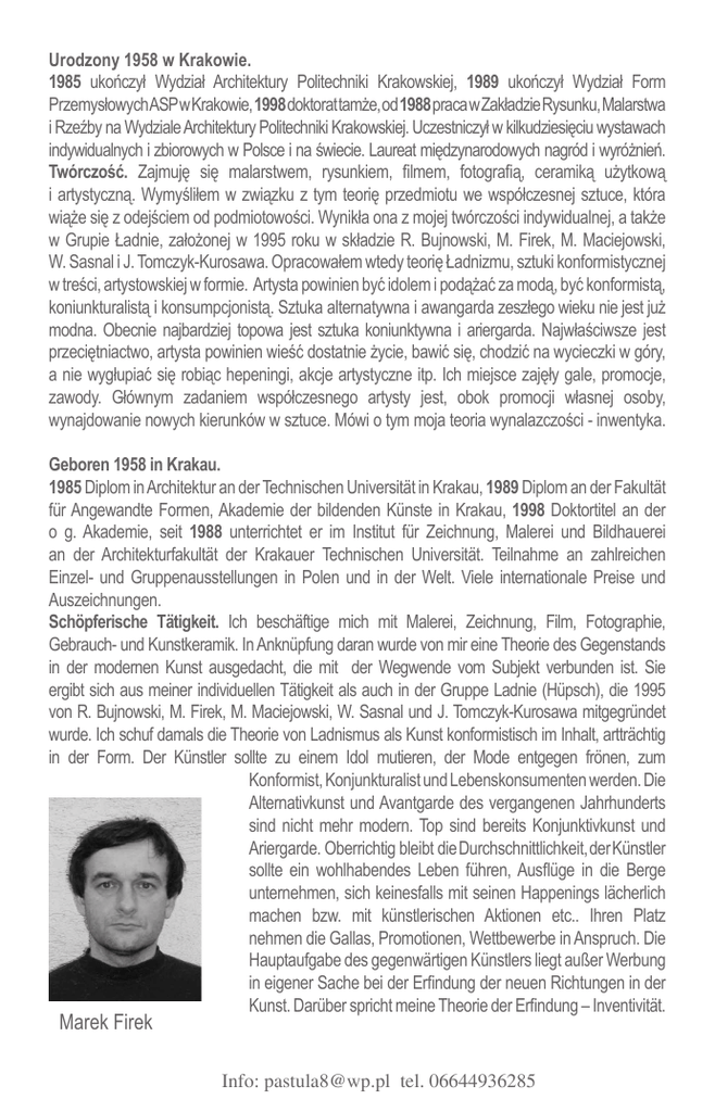 Urodzony 1958 w Krakowie. 1985 ukończył Wydział Architektury Politechniki Krakowskiej, 1989 ukończył Wydział Form PrzemysłowychASP w Krakowie, 1998 doktorat tamże, od 1988 praca w Zakładzie Rysunku, Malarstwa i Rzeźby na Wydziale Architektury Politechniki Krakowskiej. Uczestniczył w kilkudziesięciu wystawach indywidualnych i zbiorowych w Polsce i na świecie. Laureat międzynarodowych nagród i wyróżnień. Twórczość. Zajmuję się malarstwem, rysunkiem, filmem, fotografią, ceramiką użytkową i artystyczną. Wymyśliłem w związku z tym teorię przedmiotu we współczesnej sztuce, która wiąże się z odejściem od podmiotowości. Wynikła ona z mojej twórczości indywidualnej, a także w Grupie Ładnie, założonej w 1995 roku w składzie R. Bujnowski, M. Firek, M. Maciejowski, W. Sasnal i J. Tomczyk-Kurosawa. Opracowałem wtedy teorię Ładnizmu, sztuki konformistycznej w treści, artystowskiej w formie. Artysta powinien być idolem i podążać za modą, być konformistą, koniunkturalistą i konsumpcjonistą. Sztuka alternatywna i awangarda zeszłego wieku nie jest już modna. Obecnie najbardziej topowa jest sztuka koniunktywna i ariergarda. Najwłaściwsze jest przeciętniactwo, artysta powinien wieść dostatnie życie, bawić się, chodzić na wycieczki w góry, a nie wygłupiać się robiąc hepeningi, akcje artystyczne itp. Ich miejsce zajęły gale, promocje, zawody. Głównym zadaniem współczesnego artysty jest, obok promocji własnej osoby, wynajdowanie nowych kierunków w sztuce. Mówi o tym moja teoria wynalazczości - inwentyka. Geboren 1958 in Krakau. 1985 Diplom in Architektur an der Technischen Universität in Krakau, 1989 Diplom an der Fakultät für Angewandte Formen, Akademie der bildenden Künste in Krakau, 1998 Doktortitel an der o g. Akademie, seit 1988 unterrichtet er im Institut für Zeichnung, Malerei und Bildhauerei an der Architekturfakultät der Krakauer Technischen Universität. Teilnahme an zahlreichen Einzel- und Gruppenausstellungen in Polen und in der Welt. Viele internationale Preise und Auszeichnungen. Schöpferische Tätigkeit. Ich beschäftige mich mit Malerei, Zeichnung, Film, Fotographie, Gebrauch- und Kunstkeramik. In Anknüpfung daran wurde von mir eine Theorie des Gegenstands in der modernen Kunst ausgedacht, die mit der Wegwende vom Subjekt verbunden ist. Sie ergibt sich aus meiner individuellen Tätigkeit als auch in der Gruppe Ladnie (Hüpsch), die 1995 von R. Bujnowski, M. Firek, M. Maciejowski, W. Sasnal und J. Tomczyk-Kurosawa mitgegründet wurde. Ich schuf damals die Theorie von Ladnismus als Kunst konformistisch im Inhalt, artträchtig in der Form. Der Künstler sollte zu einem Idol mutieren, der Mode entgegen frönen, zum Konformist, Konjunkturalist und Lebenskonsumenten werden. Die Alternativkunst und Avantgarde des vergangenen Jahrhunderts sind nicht mehr modern. Top sind bereits Konjunktivkunst und Ariergarde. Oberrichtig bleibt die Durchschnittlichkeit, der Künstler sollte ein wohlhabendes Leben führen, Ausflüge in die Berge unternehmen, sich keinesfalls mit seinen Happenings lächerlich machen bzw. mit künstlerischen Aktionen etc.. Ihren Platz nehmen die Gallas, Promotionen, Wettbewerbe in Anspruch. Die Hauptaufgabe des gegenwärtigen Künstlers liegt außer Werbung in eigener Sache bei der Erfindung der neuen Richtungen in der Kunst. Darüber spricht meine Theorie der Erfindung – Inventivität. Marek Firek Info: [email protected] tel. 06644936285