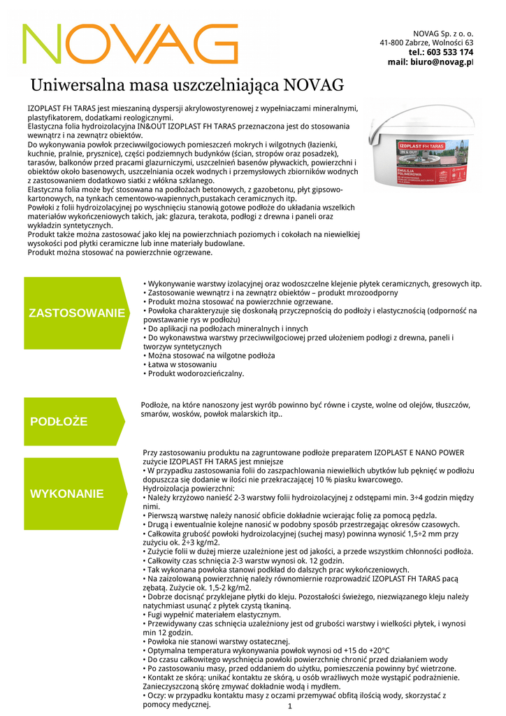 NOVAG Sp. z o. o. 41-800 Zabrze, Wolności 63 tel.: 603 533 174 mail: [email protected] Uniwersalna masa uszczelniająca NOVAG IZOPLAST FH TARAS jest mieszaniną dyspersji akrylowostyrenowej z wypełniaczami mineralnymi, plastyfikatorem, dodatkami reologicznymi. Elastyczna folia hydroizolacyjna IN&OUT IZOPLAST FH TARAS przeznaczona jest do stosowania wewnątrz i na zewnątrz obiektów. Do wykonywania powłok przeciwwilgociowych pomieszczeń mokrych i wilgotnych (łazienki, kuchnie, pralnie, prysznice), części podziemnych budynków (ścian, stropów oraz posadzek), tarasów, balkonów przed pracami glazurniczymi, uszczelnień basenów pływackich, powierzchni i obiektów około basenowych, uszczelniania oczek wodnych i przemysłowych zbiorników wodnych z zastosowaniem dodatkowo siatki z włókna szklanego. Elastyczna folia może być stosowana na podłożach betonowych, z gazobetonu, płyt gipsowokartonowych, na tynkach cementowo-wapiennych,pustakach ceramicznych itp. Powłoki z folii hydroizolacyjnej po wyschnięciu stanowią gotowe podłoże do układania wszelkich materiałów wykończeniowych takich, jak: glazura, terakota, podłogi z drewna i paneli oraz wykładzin syntetycznych. Produkt także można zastosować jako klej na powierzchniach poziomych i cokołach na niewielkiej wysokości pod płytki ceramiczne lub inne materiały budowlane. Produkt można stosować na powierzchnie ogrzewane. ZASTOSOWANIE PODŁOŻE WYKONANIE • Wykonywanie warstwy izolacyjnej oraz wodoszczelne klejenie płytek ceramicznych, gresowych itp. • Zastosowanie wewnątrz i na zewnątrz obiektów – produkt mrozoodporny • Produkt można stosować na powierzchnie ogrzewane. • Powłoka charakteryzuje się doskonałą przyczepnością do podłoży i elastycznością (odporność na powstawanie rys w podłożu) • Do aplikacji na podłożach mineralnych i innych • Do wykonawstwa warstwy przeciwwilgociowej przed ułożeniem podłogi z drewna, paneli i tworzyw syntetycznych • Można stosować na wilgotne podłoża • Łatwa w stosowaniu • Produkt wodorozcieńczalny. Podłoże, na które nanoszony jest wyrób powinno być równe i czyste, wolne od olejów, tłuszczów, smarów, wosków, powłok malarskich itp.. Przy zastosowaniu produktu na zagruntowane podłoże preparatem IZOPLAST E NANO POWER zużycie IZOPLAST FH TARAS jest mniejsze • W przypadku zastosowania folii do zaszpachlowania niewielkich ubytków lub pęknięć w podłożu dopuszcza się dodanie w ilości nie przekraczającej 10 % piasku kwarcowego. Hydroizolacja powierzchni: • Należy krzyżowo nanieść 2-3 warstwy folii hydroizolacyjnej z odstępami min. 3÷4 godzin między nimi. • Pierwszą warstwę należy nanosić obficie dokładnie wcierając folię za pomocą pędzla. • Drugą i ewentualnie kolejne nanosić w podobny sposób przestrzegając okresów czasowych. • Całkowita grubość powłoki hydroizolacyjnej (suchej masy) powinna wynosić 1,5÷2 mm przy zużyciu ok. 2÷3 kg/m2. • Zużycie folii w dużej mierze uzależnione jest od jakości, a przede wszystkim chłonności podłoża. • Całkowity czas schnięcia 2-3 warstw wynosi ok. 12 godzin. • Tak wykonana powłoka stanowi podkład do dalszych prac wykończeniowych. • Na zaizolowaną powierzchnię należy równomiernie rozprowadzić IZOPLAST FH TARAS pacą zębatą. Zużycie ok. 1,5-2 kg/m2. • Dobrze docisnąć przyklejane płytki do kleju. Pozostałości świeżego, niezwiązanego kleju należy natychmiast usunąć z płytek czystą tkaniną. • Fugi wypełnić materiałem elastycznym. • Przewidywany czas schnięcia uzależniony jest od grubości warstwy i wielkości płytek, i wynosi min 12 godzin. • Powłoka nie stanowi warstwy ostatecznej. • Optymalna temperatura wykonywania powłok wynosi od +15 do +20°C • Do czasu całkowitego wyschnięcia powłoki powierzchnię chronić przed działaniem wody • Po zastosowaniu masy, przed oddaniem do użytku, pomieszczenia powinny być wietrzone. • Kontakt ze skórą: unikać kontaktu ze skórą, u osób wrażliwych może wystąpić podrażnienie. Zanieczyszczoną skórę zmywać dokładnie wodą i mydłem. • Oczy: w przypadku kontaktu masy z oczami przemywać obfitą ilością wody, skorzystać z pomocy medycznej. 1 NOVAG Sp. z o. o. 41-800 Zabrze, Wolności 63 tel.: 603 533 174 mail: [email protected] Dostępne opakowania: wiadro 1,3 kg, wiadro 14 kg PAKOWANIE PRZECHOWY WANIE DEKLARACJE TECHNICZNA • Magazynowanie w suchych pomieszczeniach zabezpieczonych przed przemarznięciem. • Transport dowolnymi środkami transportowymi w oryginalnych opakowaniach producenta z zastosowaniem paletyzacji. • Ładunki należy zabezpieczyć przed przemieszczaniem i wywróceniem w trakcie przewozów. • Bezwzględnie przestrzegać warunków temperaturowych+5 do 25 °C. • Dokument odniesienia Aprobata Techniczna ITB nr AT-159054/2012 • Certyfikat Zgodności ITB nr ITB-0498/Z • Deklaracja zgodności nr 26a/2013 • Posiada atest higieniczny PZH 2