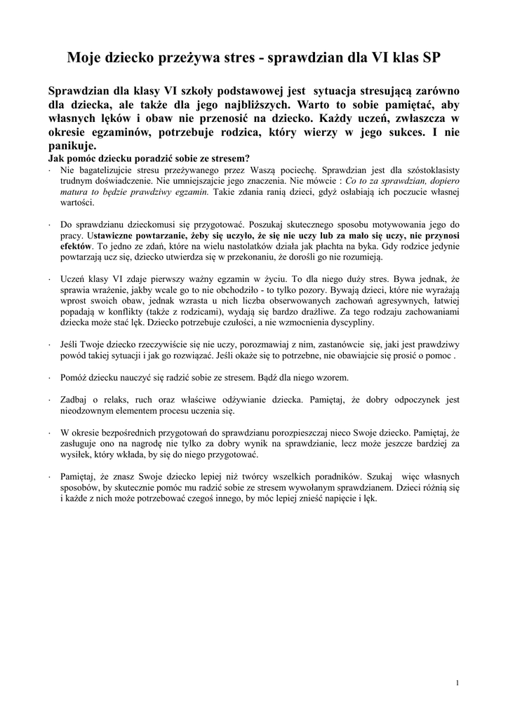 Moje dziecko przeżywa stres - sprawdzian dla VI klas SP Sprawdzian dla klasy VI szkoły podstawowej jest sytuacja stresującą zarówno dla dziecka, ale także dla jego najbliższych. Warto to sobie pamiętać, aby własnych lęków i obaw nie przenosić na dziecko. Każdy uczeń, zwłaszcza w okresie egzaminów, potrzebuje rodzica, który wierzy w jego sukces. I nie panikuje. Jak pomóc dziecku poradzić sobie ze stresem? ⋅ Nie bagatelizujcie stresu przeżywanego przez Waszą pociechę. Sprawdzian jest dla szóstoklasisty trudnym doświadczenie. Nie umniejszajcie jego znaczenia. Nie mówcie : Co to za sprawdzian, dopiero matura to będzie prawdziwy egzamin. Takie zdania ranią dzieci, gdyż osłabiają ich poczucie własnej wartości. ⋅ Do sprawdzianu dzieckomusi się przygotować. Poszukaj skutecznego sposobu motywowania jego do pracy. Ustawiczne powtarzanie, żeby się uczyło, że się nie uczy lub za mało się uczy, nie przynosi efektów. To jedno ze zdań, które na wielu nastolatków działa jak płachta na byka. Gdy rodzice jedynie powtarzają ucz się, dziecko utwierdza się w przekonaniu, że dorośli go nie rozumieją. ⋅ Uczeń klasy VI zdaje pierwszy ważny egzamin w życiu. To dla niego duży stres. Bywa jednak, że sprawia wrażenie, jakby wcale go to nie obchodziło - to tylko pozory. Bywają dzieci, które nie wyrażają wprost swoich obaw, jednak wzrasta u nich liczba obserwowanych zachowań agresywnych, łatwiej popadają w konflikty (także z rodzicami), wydają się bardzo drażliwe. Za tego rodzaju zachowaniami dziecka może stać lęk. Dziecko potrzebuje czułości, a nie wzmocnienia dyscypliny. ⋅ Jeśli Twoje dziecko rzeczywiście się nie uczy, porozmawiaj z nim, zastanówcie się, jaki jest prawdziwy powód takiej sytuacji i jak go rozwiązać. Jeśli okaże się to potrzebne, nie obawiajcie się prosić o pomoc . ⋅ Pomóż dziecku nauczyć się radzić sobie ze stresem. Bądź dla niego wzorem. ⋅ Zadbaj o relaks, ruch oraz właściwe odżywianie dziecka. Pamiętaj, że dobry odpoczynek jest nieodzownym elementem procesu uczenia się. ⋅ W okresie bezpośrednich przygotowań do sprawdzianu porozpieszczaj nieco Swoje dziecko. Pamiętaj, że zasługuje ono na nagrodę nie tylko za dobry wynik na sprawdzianie, lecz może jeszcze bardziej za wysiłek, który wkłada, by się do niego przygotować. ⋅ Pamiętaj, że znasz Swoje dziecko lepiej niż twórcy wszelkich poradników. Szukaj więc własnych sposobów, by skutecznie pomóc mu radzić sobie ze stresem wywołanym sprawdzianem. Dzieci różnią się i każde z nich może potrzebować czegoś innego, by móc lepiej znieść napięcie i lęk. 1