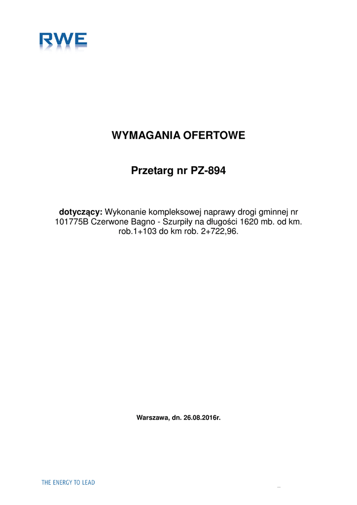 WYMAGANIA OFERTOWE Przetarg nr PZ-894 dotyczący: Wykonanie kompleksowej naprawy drogi gminnej nr 101775B Czerwone Bagno - Szurpiły na długości 1620 mb. od km. rob.1+103 do km rob. 2+722,96. Warszawa, dn. 26.08.2016r. ... Przetarg nr PZ-894 1. Dane Ogólne 1.1. Park Wiatrowy Suwałki Spółką z ograniczoną odpowiedzialnością z siedzibą przy ul. Wybrzeże Kościuszkowskie 41, w Warszawie, zwana dalej „Zamawiającym” w imieniu i na rzecz, którego działa: RWE Polska Spółka Akcyjna z siedzibą przy ul. Wybrzeże Kościuszkowskie 41 w Warszawie zaprasza do wzięcia udziału w Przetargu na Wykonanie kompleksowej naprawy drogi gminnej nr 101775B Czerwone Bagno - Szurpiły na długości 1620 mb. od km. rob.1+103 do km rob. 2+722,96 (skrzyżowanie z drogą powiatową nr 1133B) na podstawie projektu autorstwa Renaty. 1.2. Termin realizacji przedmiotu Przetargu: Rozpoczęcie prac niezwłocznie po podpisaniu Umowy, przewidywane zakończenie do 15.11.2016r.. 1.3. O udzielenie zamówienia ubiegać się mogą Oferenci spełniający następujące warunki: a) posiadają niezbędne uprawnienia do występowania w obrocie prawym; b) posiadają niezbędne doświadczenie i sprzęt: np. uprawnienia zaświadczenie o przynależności do IIB itp., wykaz posiadanego sprzętu; budowlane, c) w ostatnich 3 latach zrealizowali co najmniej 3 zadania o charakterze i złożoności porównywalnej z zakresem Przetargu; d) nie zalegają z płatnościami wobec Urzędu Skarbowego i ZUS oraz znajdują się w sytuacji finansowej pozwalającej na wykonanie przedmiotu Przetargu; 2. Procedura Przetargowa Przetarg składa się z dwóch etapów: Etap I – Zgłoszenie chęci udziału, Etap II – Złożenie ofert w za pośrednictwem Portalu Dostawcy RWE: https://supplier.rwe.com/irj/portal/ 2.1. Etap I. Zgłoszenie chęci wzięcia udziału w Przetargu odbywa się na podstawie zeskanowanego wypełnionego i podpisanego Formularza Zgłoszenia (Załącznik 1), który 00 należy wysłać mailem w terminie do 07.09.2016r. do godziny 12 na e-mail: [email protected] 2.1.1. Zamawiający udostępni Oferentom materiały szkoleniowe dot. obsługi Portalu Dostawcy RWE. Po weryfikacji danych Oferenta materiały szkoleniowe zostaną wysłane drogą elektroniczną na adres e-mail podany na Formularzu Zgłoszenia. 2.2. Etap II – Złożenie ofert za pośrednictwem https://supplier.rwe.com/irj/portal/. Oferta powinna zawierać: Portalu Dostawcy RWE: 2.2.1. następujące dokumenty i oświadczenia: a) plik z danymi z KRS lub z Centralnej Ewidencji i Informacji o Działalności Gospodarczej Rzeczpospolitej Polskiej; b) dowody posiadania przez Oferenta niezbędnego doświadczenia: dokumenty poświadczające stosowne uprawnienia, wykaz posiadanego sprzętu c) wykaz prac/referencje ze zrealizowanych 3 zadań o charakterze i złożoności porównywalnej z zakresem Przetargu z ostatnich 3 lat. (Kontakt do osoby, która może je potwierdzić); 2.2.2. wynagrodzenie: a) wysokość wynagrodzenia za realizację przedmiotu Przetargu. Wycena przedmiotu Przetargu polega na podaniu kwot bez VAT, obejmujących całość przedmiotu Przetargu w podziale na miesiące. Wynagrodzenie musi pokrywać wartość kompletnej realizacji przedmiotu Przetargu, w tym koszty uzyskania 2 Przetarg nr PZ-894 wszelkich niezbędnych do rozpoczęcia realizacji przedmiotu Przetargu opinii, uzgodnień, materiałów, pozwoleń, decyzji, itp.; b) termin realizacji przedmiotu zamówienia. Należy kalendarzowych potrzebnych na wykonanie całego zadania. podać ilość dni 2.3. Składanie oferty 2.3.1. Dokumenty wymienione w punkcie 2.2. (Etap II) Procedury Przetargowej należy 00 złożyć w terminie od 09.09.2016r. do 12.09.2016r. do godziny 10 za pośrednictwem Portalu Dostawcy RWE: https://supplier.rwe.com/irj/portal/. 2.3.2. Oferta będzie wprowadzona do Portalu w języku polskim przez uprawnionego przedstawiciela Oferenta. 2.3.3. Wszystkie oferty otrzymane przez Zamawiającego w formie innej niż za pośrednictwem Portalu Dostawcy RWE lub po terminie podanym powyżej nie będą rozpatrywane. 2.4. Pozostałe wymagania 2.4.1. Oferta zostanie przesłana bezpłatnie oraz w sposób niewiążący dla Zamawiającego. 2.4.2. Zaleca się, aby Oferent zdobył wszelkie informacje, które mogą być konieczne do przygotowania oferty oraz zaakceptowania umowy. 2.4.3. Każdy Oferent przedłoży tylko jedną ofertę sam lub jako reprezentant spółki. Oferent, który przedłoży więcej niż jedną ofertę (nie dotyczy modyfikacji oferty przed upływem terminu składania ofert) zostanie wyłączony z postępowania. 2.4.4. Przy wyborze oferty Zamawiający będzie kierował się następującymi kryteriami: • Cena całkowita ………………………………………………...100% Gwarancja- minimum 36 miesięcy 2.4.5. W szczególnie uzasadnionych przypadkach, przed upływem terminu składania ofert Zamawiający może zmodyfikować treść dokumentów Przetargowych. Każda wprowadzona przez Zamawiającego zmiana zostanie opublikowana na stronie internetowej Zamawiającego w dziale Przetargów. Zamawiający może przedłużyć wówczas określony w pkt. 2.2.1. termin składania ofert w celu umożliwienia Oferentom uwzględnienia w przygotowywanych ofertach otrzymanych zmian. W tym przypadku wszelkie prawa i zobowiązania Zamawiającego i Oferenta odnośnie wcześniej ustalonego terminu będą podlegały ewentualnemu nowemu terminowi. 2.4.6. Termin związania ofertą handlową wynosi 90 dni od daty jej złożenia. 2.4.7. Oferent może wprowadzać zmiany lub wycofać złożoną przez siebie ofertę do końca wyznaczonego w pkt. 2.3.1 terminu składania ofert Oferent nie może wycofać oferty i wprowadzać zmian w ofercie po upływie terminu składania ofert. 2.4.8. Wszystkie oferty będą oceniane przez Komisję Przetargową. 2.4.9. Komisja Przetargowa odrzuca oferty: a) nie odpowiadające w sposób oczywisty warunkom Przetargu; b) złożone bez wymaganych lub kompletnych dokumentów; c)