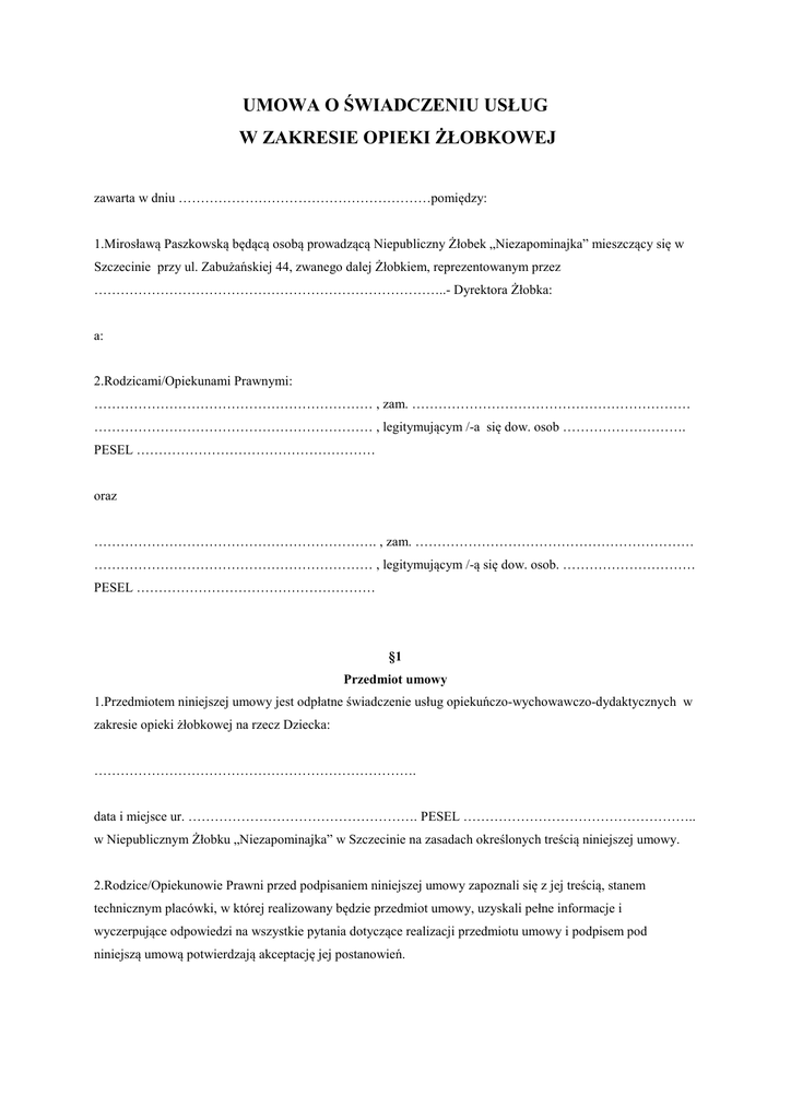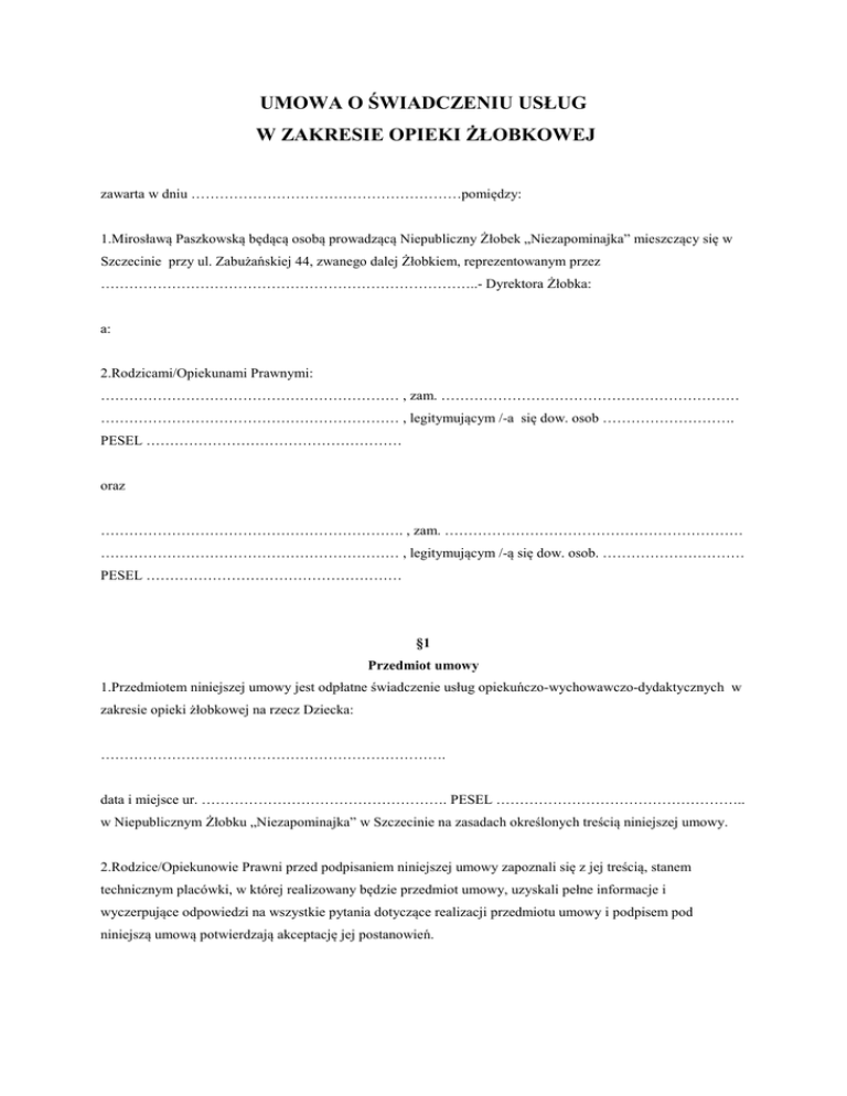UMOWA O ŚWIADCZENIU USŁUG W ZAKRESIE OPIEKI ŻŁOBKOWEJ zawarta w dniu …………………………………………………pomiędzy: 1.Mirosławą Paszkowską będącą osobą prowadzącą Niepubliczny Żłobek „Niezapominajka” mieszczący się w Szczecinie przy ul. Zabużańskiej 44, zwanego dalej Żłobkiem, reprezentowanym przez ……………………………………………………………………..- Dyrektora Żłobka: a: 2.Rodzicami/Opiekunami Prawnymi: ……………………………………………………… , zam. ……………………………………………………… ……………………………………………………… , legitymującym /-a się dow. osob ………………………. PESEL ……………………………………………… oraz ………………………………………………………. , zam. ……………………………………………………… ……………………………………………………… , legitymującym /-ą się dow. osob. ………………………… PESEL ……………………………………………… §1 Przedmiot umowy 1.Przedmiotem niniejszej umowy jest odpłatne świadczenie usług opiekuńczo-wychowawczo-dydaktycznych w zakresie opieki żłobkowej na rzecz Dziecka: ………………………………………………………………. data i miejsce ur. ……………………………………………. PESEL …………………………………………….. w Niepublicznym Żłobku „Niezapominajka” w Szczecinie na zasadach określonych treścią niniejszej umowy. 2.Rodzice/Opiekunowie Prawni przed podpisaniem niniejszej umowy zapoznali się z jej treścią, stanem technicznym placówki, w której realizowany będzie przedmiot umowy, uzyskali pełne informacje i wyczerpujące odpowiedzi na wszystkie pytania dotyczące realizacji przedmiotu umowy i podpisem pod niniejszą umową potwierdzają akceptację jej postanowień. §2 Obowiązki Żłobka 1.Żłobek „Niezapominajka” zobowiązany jest do: a. sprawowania opieki nad dzieckiem w czasie określonym w §5 niniejszej umowy, b. zapewnienia odpowiednich warunków pobytu i bezpieczeństwa dziecka, c. organizacji zajęć wychowawczych i dydaktycznych uwzględniających właściwy rozwój psychomotoryczny dziecka, d. współpracy z Rodzicami/Opiekunami Prawnymi w procesie opiekuńczo-wychowawczo-dydaktycznym, e. zatrudnienia wykwalifikowanej kadry pedagogicznej f. zapewnienia wyżywienia: trzech posiłków dziennie (śniadanie, obiad dwudaniowy, podwieczorek), g. zapewnienia przestrzegania wymagań w zakresie ochrony informacji o dziecku i rodzicach oraz ochrony danych osobowych i innych, uważanych za poufne, stosownie do wytycznych ustawowych, h. ubezpieczenia dziecka od następstw nieszczęśliwych wypadków, i. pozostałe obowiązki Żłobka określa statut oraz regulamin placówki 2. Prawo do odbioru dziecka ze Żłobka przysługuje Rodzicom/Prawnym Opiekunom oraz innym osobom wskazanym w pisemnym UPOWAŻNIENIU (załącznik nr 4 części umowy) z wyłączeniem osób niepełnoletnich, osób nie posiadających pełnej zdolności do czynności prawnych oraz osób będących w stanie nietrzeźwym. §3 Obowiązki Rodziców /Opiekunów 1.Rodzice /Opiekunowie zobowiązani są do: a. rzetelnego i zgodnego z prawdą wypełnienia „KARTY ZGŁOSZENIA DZIECKA” (załącznik nr 2 części umowy), b. rzetelnego i zgodnego z prawdą wypełnienia „KARTY INFORMACYJNEJ DZIECKA” (załącznik nr 3 części umowy), c. współpracy ze żłobkiem w procesie opiekuńczo-wychowawczo-dydaktycznym, d. przyprowadzania dziecka od godz. 6:30 do godz. 9:00 i jego odbioru nie później niż do godziny 17:30, e. dostarczenia z chwilą przyprowadzenia dziecka po raz pierwszy do Niepublicznego Żłobka „Niezapominajka” zaświadczenia lekarskiego, że dziecko jest zdrowe i może uczęszczać do placówki, f. pozostawienia dziecka na czas choroby, przeziębienia poza opieką żłobkową, g. informowania o planowanych lub nieplanowanych nieobecnościach dziecka, h. zapłacenia składki za ubezpieczenia NNW dziecka w wysokości i terminach wskazanych przez Ubezpieczyciela, i. terminowego uiszczania opłat. 2. W okresie wakacyjnym, od lipca do sierpnia, żłobek realizuje program zajęć podstawowych. W tym okresie zajęcia uzupełniające mogą nie być realizowane, co pozostaje bez wpływu na wysokość czesnego za ten okres. §4 Zajęcia adaptacyjne Rodzice/Opiekunowie, których dziecko po raz pierwszy przekraczają próg żłobka, mają prawo do uczestnictwa w nieodpłatnych zajęciach adaptacyjnych w wymiarze 8 godzin jednorazowo lub podziału na dwa, trzy dni. Termin ustala się w porozumieniu z Dyrektorem Żłobka. §5 Organizacja pracy placówki 1.Żłobek „Niezapominajka” zapewnia opiekę całoroczną od 1 września do 31 sierpnia roku następnego. 2.Żłobek jest czynny od poniedziałku do piątku w godzinach od 6:30 do 17:30 z wyjątkiem świąt i dni ustawowo wolnych od pracy. 3. Pozostałe zasady organizacji Żłobka określają statut i regulamin placówki. §6 Zasady odpłatności 1.Za świadczenie przez Żłobek przedmiotu umowy Rodzice/Opiekunowie Prawni zobowiązani są do zapłaty na rzecz Żłobka wynagrodzenia ryczałtowego w wysokości określonej w załączniku nr 1 do niniejszej umowy, jak również innych należności wprost określonych w treści w/w załącznika, a w szczególności opłaty rezerwacyjnej. 2.Wynagrodzenie, o którym mowa w ust.1 płatne jest z góry w terminie do 10-tego każdego miesiąca poprzez dokonanie płatności w kasie Żłobka w godzinach jego otwarcia lub na rachunek bankowy Żłobka nr 61 1020 4812 0000 0802 0131 7684. Jako datę zapłaty wynagrodzenia strony zgodnie uznają datę pokwitowania wpłaty należności lub datę wpływu środków na rachunek bankowy Żłobka. Koszty płatności wynagrodzenia, jak i innych należności ponoszą Rodzice/Opiekunowie Prawni