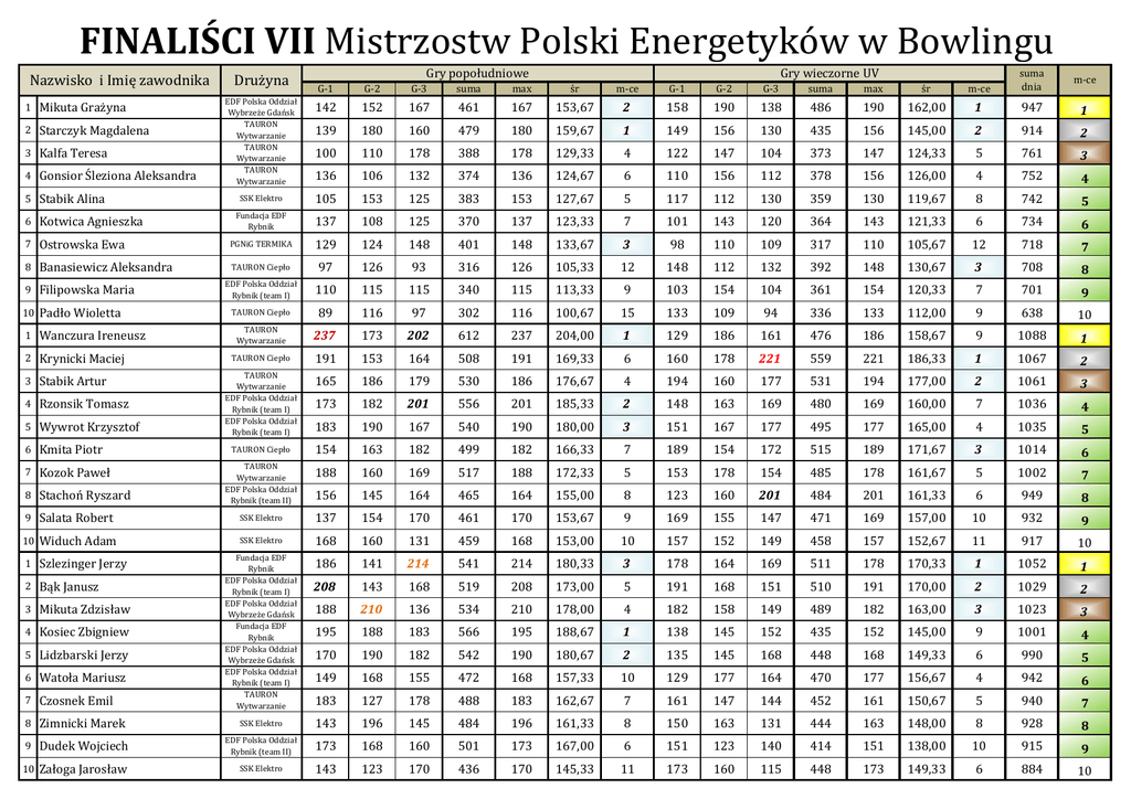 FINALIŚCI VII Mistrzostw Polski Energetyków w Bowlingu Nazwisko i Imię zawodnika 1 Mikuta Grażyna 2 Starczyk Magdalena 3 Kalfa Teresa 4 Gonsior Śleziona Aleksandra 5 Stabik Alina 6 Kotwica Agnieszka 7 Ostrowska Ewa 8 Banasiewicz Aleksandra 9 Filipowska Maria 10 Padło Wioletta 1 Wanczura Ireneusz 2 Krynicki Maciej 3 Stabik Artur 4 Rzonsik Tomasz 5 Wywrot Krzysztof 6 Kmita Piotr 7 Kozok Paweł 8 Stachoń Ryszard 9 Salata Robert 10 Widuch Adam Gry popołudniowe Gry wieczorne UV G-1 G-2 G-3 suma max śr m-ce G-1 G-2 G-3 suma max śr m-ce suma dnia m-ce EDF Polska Oddział Wybrzeże Gdańsk TAURON Wytwarzanie TAURON Wytwarzanie TAURON Wytwarzanie 142 152 167 461 167 153,67 2 158 190 138 486 190 162,00 1 947 1 139 180 160 479 180 159,67 1 149 156 130 435 156 145,00 2 914 2 100 110 178 388 178 129,33 4 122 147 104 373 147 124,33 5 761 3 136 106 132 374 136 124,67 6 110 156 112 378 156 126,00 4 752 4 SSK Elektro 105 153 125 383 153 127,67 5 117 112 130 359 130 119,67 8 742 5 Fundacja EDF Rybnik 137 108 125 370 137 123,33 7 101 143 120 364 143 121,33 6 734 6 PGNiG TERMIKA 129 124 148 401 148 133,67 3 98 110 109 317 110 105,67 12 718 7 Drużyna TAURON Ciepło 97 126 93 316 126 105,33 12 148 112 132 392 148 130,67 3 708 8 EDF Polska Oddział Rybnik (team I) 110 115 115 340 115 113,33 9 103 154 104 361 154 120,33 7 701 9 TAURON Ciepło 89 116 97 302 116 100,67 15 133 109 94 336 133 112,00 9 638 10 TAURON Wytwarzanie 237 173 202 612 237 204,00 1 129 186 161 476 186 158,67 9 1088 1 TAURON Ciepło 191 153 164 508 191 169,33 6 160 178 221 559 221 186,33 1 1067 2 TAURON Wytwarzanie EDF Polska Oddział Rybnik (team I) EDF Polska Oddział Rybnik (team I) 165 186 179 530 186 176,67 4 194 160 177 531 194 177,00 2 1061 3 173 182 201 556 201 185,33 2 148 163 169 480 169 160,00 7 1036 4 183 190 167 540 190 180,00 3 151 167 177 495 177 165,00 4 1035 5 TAURON Ciepło 154 163 182 499 182 166,33 7 189 154 172 515 189 171,67 3 1014 6 TAURON Wytwarzanie EDF Polska Oddział Rybnik (team II) 188 160 169 517 188 172,33 5 153 178 154 485 178 161,67 5 1002 7 156 145 164 465 164 155,00 8 123 160 201 484 201 161,33 6 949 8 SSK Elektro 137 154 170 461 170 153,67 9 169 155 147 471 169 157,00 10 932 9 SSK Elektro 168 160 131 459 168 153,00 10 157 152 149 458 157 152,67 11 917 10 Fundacja EDF Rybnik EDF Polska Oddział Rybnik (team I) EDF Polska Oddział Wybrzeże Gdańsk Fundacja EDF Rybnik EDF Polska Oddział Wybrzeże Gdańsk EDF Polska Oddział Rybnik (team I) TAURON Wytwarzanie 186 141 214 541 214 180,33 3 178 164 169 511 178 170,33 1 1052 1 208 143 168 519 208 173,00 5 191 168 151 510 191 170,00 2 1029 2 188 210 136 534 210 178,00 4 182 158 149 489 182 163,00 3 1023 3 195 188 183 566 195 188,67 1 138 145 152 435 152 145,00 9 1001 4 170 190 182 542 190 180,67 2 135 145 168 448 168 149,33 6 990 5 149 168 155 472 168 157,33 10 129 177 164 470 177 156,67 4 942 6 183 127 178 488 183 162,67 7 161 147 144 452 161 150,67 5 940 7 1 Szlezinger Jerzy 2 Bąk Janusz 3 Mikuta Zdzisław 4 Kosiec Zbigniew 5 Lidzbarski Jerzy 6 Watoła Mariusz 7 Czosnek Emil 8 Zimnicki Marek SSK Elektro 143 196 145 484 196 161,33 8 150 163 131 444 163 148,00 8 928 8 9 Dudek Wojciech EDF Polska Oddział Rybnik (team II) 173 168 160 501 173 167,00 6 151 123 140 414 151 138,00 10 915 9 10 Załoga Jarosław SSK Elektro 143 123 170 436 170 145,33 11 173 160 115 448 173 149,33 6 884 10