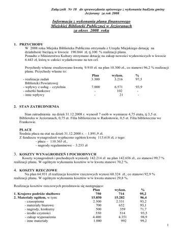 Załącznik Nr 18 do sprawozdania opisowego z wykonania budżetu gminy Jeziorany za rok 2008 Informacja z wykonania planu finansowego Miejskiej Biblioteki Publicznej w Jezioranach za okres 2008 roku 1. PRZYCHODY W 2008 roku Miejska Biblioteka Publiczna otrzymała z Urzędu Miejskiego dotację na działalność bieżącą w kwocie 190.844 zł, tj.100 % realizacji planu. Ponadto z Ministerstwa Kultury otrzymano dotację na zakup nowości wydawniczych w kwocie 6.443 zł, którą w całości wydatkowano na ten cel. Przychody własne zrealizowano kwotą 9.910 zł. na plan 10.300 zł., co stanowi 96,2 % realizacji planu. Przychody własne to: Plan wykon. % - realizacja zadań 3.300 3.216 97,5 Biblioteki Powiatowej - wpływy z usług – czytelnia 7.000 6.571 93,9 - odsetki bankowe 102 - inne wpływy 21 - 2. STAN ZATRUDNIENIA Stan zatrudnienia na dzień 31.12.2008 r. wynosił 7 osób w wymiarze 4,75 etatu, tj 3,5 et. Biblioteka w Jezioranach, 0,75 et. Filia biblioteczna w Radostowie, 0,5 et. Filia biblioteczna we Frankowie. PŁACE Średnia płaca na etat na dzień 31.12.2008 r. – 1.891,9 zł. Z funduszu wynagrodzeń wypłacono ogółem kwotę 113.618 zł, z tego: - płace – 110.365 zł., - nagrody regulaminowe – 3.253 zł 3. KOSZTY WYNAGRODZEŃ I POCHODNYCH Koszty wynagrodzeń i pochodnych wyniosły 142.214 zł na plan 142.656 zł., co stanowi 99,7 % realizacji planu. W ogólnym wykonaniu kosztów w/w kwota stanowi 70,2 %. 4. KOSZTY RZECZOWE Na plan 64.931 zł realizacja kosztów rzeczowych wynosi 60.324 zł., co stanowi 92,9 % realizacji planu. W ogólnym wykonaniu kosztów w/w kwota stanowi 29,8 %. Realizacja kosztów rzeczowych przedstawia się następująco: Plan 1. Krajowe podróże służbowe 750 2. Materiały ogółem, w tym: 15.850 - czasopisma 2.500 - materiały biurowe 700 - nagrody, konkursy 500 - środki czystości 550 - zakup wyposażenia 4.400 - inne materiały 1.000 wykon. 714 15.282 2.331 652 359 514 4.351 992 % 95,2 96,4 93,2 93,1 71,7 93,5 98,9 99,2 1 - zak. materiałów – czytelnia - zak. materiałów – organizacja 60-lecia MBP w J-nach 3.900 2.300 3.813 2.270 97,8 98,7 3. Zakup energii ogółem, w tym: - energia elektryczna - woda, ścieki - energia cieplna, c. o. 14.000 3.100 200 10.700 13.527 3.077 100 10.350 96,6 99,3 50,0 96,7 4. Zakup usług pozostałych, w tym: - usługi transport., wywóz nieczyst. - usługi ksero i inne - prowizje bankowe - opłaty RTV, kons. syst. alarm. - szkolenia pracowników - badania lekarskie - zakup usług – czytelnia intern. - zakup usług – organizacja 670-lecia Jezioran 5. Usługi internetowe 6. Usł. telekomunikacyjne telefonii stacjonarnej 7. Książki 8. Różne opłaty i składki 9. Zakup programów komputerowych 14.750 700 600 1.250 450 560 190 1.000 10.000 13.539 532 519 1. 206 326 560 60 336 10.000 91,8 76,0 86,5 96,5 72,5 100,0 31,6 33,6 100,0 1.300 2.300 13.331 500 2.300 1.007 1.833 13.188 14 1.220 77,4 79,7 98,9 4,0 53,0 Realizacja planu finansowego za 2008 roku przebiega w sposób planowy, zgodnie z zaplanowanymi do realizacji zadaniami. Działalność merytoryczna Działalność Biblioteki Publicznej oraz jej filii terenowych oparta jest na półrocznych planach pracy, ze szczególnym uwzględnieniem: - popularyzacji książki i czytelnictwa, - realizacji zadań w zakresie realizacji programów: a) Wirtualnej Biblioteki Powiatowej, b) BIS (Bibliotecznej Informacyjnej Sieci Szkoleniowej), c) IKONKA, d) KISS (Kultura Informacja Sukces - Sieć), e) Programu Ministerstwa Kultury „Upowszechnianie i promocja czytelnictwa” - upowszechniania nowoczesnych technologii medialnych, - organizacji konkursów czytelniczych i recytatorskich, - zajęć bibliotecznych, - pracy z katalogiem. Sprawozdanie merytoryczne z działalności w MBP w Jezioranach W okresie od stycznia do grudnia 2008 Miejska Biblioteka Publiczna w Jezioranach zorganizowała następujące imprezy: | Ferie Zimowe. 2 | „Spotkanie teatralne przy stolikach”. W spotkaniu tym udział wzięły dzieci ze Szkoły Podstawowej oraz Gimnazjum w Jezioranach. | Z okazji Międzynarodowego Dnia Książki dla Dzieci, dzieci odbyły podróż w świat bajki, a następnie malowały, kolorowały i układały różne postaci bajkowe i baśniowe, uczyły się także jak korzystać z komputerów i surfować po Internecie. | XXVI konkurs recytatorski „Spotkanie z poezją” | pogadanka z młodzieżą na temat narkomanii | W związku ze współpracą z Domem Pomocy Społecznej w Jezioranach co środa do czytelni internetowej przychodzą z opiekunem pensjonariuszki DPS w celu nauki korzystania z Internetu. | Letnisko dla dzieci z terenu Miasta i Gminy Jeziorany pt. „Wakacje z Biblioteką” | 60-lecie Miejskiej Biblioteki Publicznej zakończone spotkaniem autorskim z Tomaszem Białkowskim i występem zespołu „Dłoń” z Biskupca | Spotkanie dla dzieci z okazji Dnia Głośnego Czytania, w trakcie którego mogły słuchać czytanych bajek, a także brać udział w różnych konkursach i zabawach | Spotkanie z dziećmi z przedszkola p. Ewy Arnisty „Klub Maluszka”, które poznawały zawód bibliotekarza | Z okazji zbliżającej się 55 rocznicy śmierci Juliana Tuwima została zorganizowana lekcja biblioteczna dla dzieci z zerówki, które z zaciekawieniem słuchały jego twórczości, także o zasobach i katalogach bibliotecznych | W związku ze współpracą z Domem Pomocy Społecznej w Jezioranach co środa do czytelni internetowej przychodzą z opiekunem pensjonariuszki DPS w celu nauki korzystania z Internetu. Ogłoszone konkursy: | | | | | | | własnoręcznie wykonaną zakładkę do książki, Znam swój język ojczysty, Tradycje i obrzędy Świąt Wielkiej Nocy, Kurczak w tradycji ozdób Wielkanocnych, wiedzy o Warmii, Najpiękniejszy list do Mamy, Mój Tata jest wspaniały, | na logo z okazji Jubileuszu 60-lecia MBP w Jezioranach (1948 – 2008) , | rysunkowy pt. ”Moja Biblioteka”, | na opowiadanie „Wspomnienia z wakacji”, | literacki pt. „List do Świ