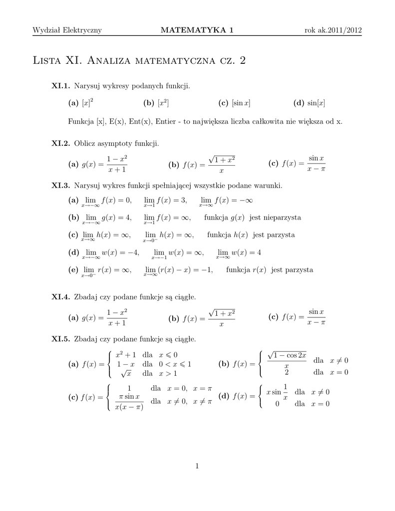 MATEMATYKA 1 Wydział Elektryczny rok ak.2011/2012 Lista XI. Analiza matematyczna cz. 2 XI.1. Narysuj wykresy podanych funkcji. (a) [x]2 (b) [x2 ] (c) [sin x] (d) sin[x] Funkcja [x], E(x), Ent(x), Entier - to największa liczba całkowita nie większa od x. XI.2. Oblicz asymptoty funkcji. √ 1 − x2 (a) g(x) = x+1 (b) f (x) = 1 + x2 x (c) f (x) = sin x x−π XI.3. Narysuj wykres funkcji spełniającej wszystkie podane warunki. (a) lim f (x) = 0, x→−∞ (b) lim g(x) = 4, x→−∞ (c) lim h(x) = ∞, x→∞ (d) lim w(x) = −4, x→−∞ (e) lim− r(x) = ∞, x→0 lim f (x) = −∞ lim f (x) = 3, x→∞ x→1 lim f (x) = ∞, funkcja g(x) jest nieparzysta lim h(x) = ∞, funkcja h(x) jest parzysta x→1 x→0− lim w(x) = ∞, lim w(x) = 4 x→∞ x→−1 lim (r(x) − x) = −1, x→∞ funkcja r(x) jest parzysta XI.4. Zbadaj czy podane funkcje są ciągłe. 1 − x2 (a) g(x) = x+1 √ (b) f (x) = 1 + x2 x (c) f (x) = sin x x−π XI.5. Zbadaj czy podane funkcje są ciągłe. x2 + 1 dla x ¬ 0 − x dla 0 < x ¬ 1 (a) f (x) = 1√ x dla x > 1 (b) f (x) = √ 1 − cos 2x dla x 6= 0 x 2 dla x = 0 1 1 dla x = 0, x = π x sin dla x 6= 0 (d) f (x) = π sin x (c) f (x) = x dla x 6= 0, x = 6 π 0 dla x = 0 x(x − π) 1 MATEMATYKA 1 Wydział Elektryczny rok ak.2011/2012 XI.6. Dobierz parametry a, b ∈ R tak, aby podane funkcje były ciągłe we wskazanych punktach. (x − 1)3 dla x 6= 0 (b) f (x) = ax√+ b dla 0 < x < 1 x dla x 1 2 dla x ¬ 0 x (a) f (x) = a + b dla 0 < x < 1 3 dla x 1 XI.7. Określ rodzaj nieciągłości. x2 − 1 √ dla x ∈ (0, 1) ∪ (1, ∞) (a) f (x) = x − 1 3 dla x = 1 (b) f (x) = 1 ex + 2 dla x 6= 0 1 ex + 1 e dla x = 0 |x| + x dla x 6= 0 (c) f (x) = x2 0 dla x = 0 2