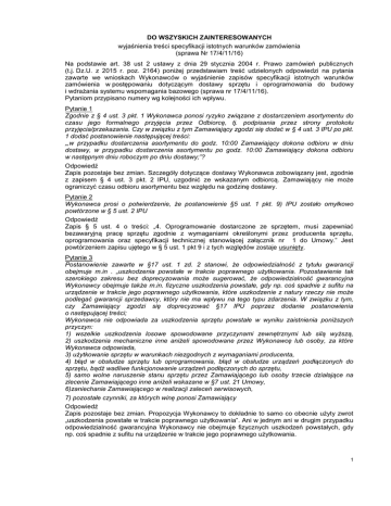 DO WSZYSKICH ZAINTERESOWANYCH wyjaśnienia treści specyfikacji istotnych warunków zamówienia (sprawa Nr 17/4/11/16) Na podstawie art. 38 ust 2 ustawy z dnia 29 stycznia 2004 r. Prawo zamówień publicznych (t.j. Dz.U. z 2015 r. poz. 2164) poniżej przedstawiam treść udzielonych odpowiedzi na pytania zawarte we wnioskach Wykonawców o wyjaśnienie zapisów specyfikacji istotnych warunków zamówienia w postępowaniu dotyczącym dostawy sprzętu i oprogramowania do budowy i wdrażania systemu wspomagania bazowego (sprawa nr 17/4/11/16). Pytaniom przypisano numery wg kolejności ich wpływu. Pytanie 1 Zgodnie z § 4 ust. 3 pkt. 1 Wykonawca ponosi ryzyko związane z dostarczeniem asortymentu do czasu jego formalnego przyjęcia przez Odbiorcę, tj. podpisania przez strony protokołu przyjęcia/przekazania. Czy w związku z tym Zamawiający zgodzi się dodać w § 4 ust. 3 IPU po pkt. 1 dodać postanowienie następującej treści: „,w przypadku dostarczenia asortymentu do godz. 10:00 Zamawiający dokona odbioru w dniu dostawy, w przypadku dostarczenia asortymentu po godz. 10:00 Zamawiający dokona odbioru w następnym dniu roboczym po dniu dostawy;”? Odpowiedź Zapis pozostaje bez zmian. Szczegóły dotyczące dostawy Wykonawca zobowiązany jest, zgodnie z zapisem § 4 ust. 3 pkt. 2 IPU, uzgodnić ze wskazanym odbiorcą. Zamawiający nie może ograniczyć czasu odbioru asortymentu bez względu na godzinę dostawy. Pytanie 2 Wykonawca prosi o potwierdzenie, że postanowienie §5 ust. 1 pkt. 9) IPU zostało omyłkowo powtórzone w § 5 ust. 2 IPU Odpowiedź Zapis § 5 ust. 4 o treści: „4. Oprogramowanie dostarczone ze sprzętem, musi zapewniać bezawaryjną pracę sprzętu zgodnie z wymaganiami określonymi przez producenta sprzętu, oprogramowania oraz specyfikacji technicznej stanowiącej załącznik nr 1 do Umowy.” Jest powtórzeniem zapisu ujętego w § 5 ust. 1 pkt 9 i z tych względów zostaje usunięty. Pytanie 3 Postanowienie zawarte w §17 ust. 1 zd. 2 stanowi, że odpowiedzialność z tytułu gwarancji obejmuje m.in . „uszkodzenia powstałe w trakcie poprawnego użytkowania. Pozostawienie tak szerokiego zakresu bez doprecyzowania może sugerować, że odpowiedzialność gwarancyjna Wykonawcy obejmuje także m.in. fizyczne uszkodzenia powstałe, gdy np. coś spadnie z sufitu na urządzenie w trakcie jego poprawnego użytkowania, które uszkodzenie z natury rzeczy nie może podlegać gwarancji sprzedawcy, który nie ma wpływu na tego typu zdarzenia. W związku z tym, czy Zamawiający zgodzi się doprecyzować §17 IPU poprzez dodanie postanowienia o następującej treści; Wykonawca nie odpowiada za uszkodzenia sprzętu powstałe w wyniku zaistnienia poniższych przyczyn: 1) wszelkie uszkodzenia losowe spowodowane przyczynami zewnętrznymi lub silą wyższą, 2) uszkodzenia mechaniczne inne aniżeli spowodowane przez Wykonawcę lub osoby, za które Wykonawca odpowiada, 3) użytkowanie sprzętu w warunkach niezgodnych z wymaganiami producenta, 4) błąd w obsłudze sprzętu lub oprogramowania, błąd w obsłudze urządzeń podłączonych do sprzętu, bądź wadliwe funkcjonowanie urządzeń podłączonych do sprzętu, 5) samo wolne naruszenie stanu sprzętu przez Zamawiającego lub osoby trzecie działające na zlecenie Zamawiającego inne aniżeli wskazane w §7 ust. 21 Umowy, 6)zaniechanie Zamawiającego w realizacji zaleceń serwisowych, 7) pozostałe czynniki, za których winę ponosi Zamawiający Odpowiedź Zapis pozostaje bez zmian. Propozycja Wykonawcy to dokładnie to samo co obecnie użyty zwrot „uszkodzenia powstałe w trakcie poprawnego użytkowania”. Ani w jednym ani w drugim przypadku odpowiedzialność gwarancyjna Wykonawcy nie obejmuje fizycznych uszkodzeń powstałych, gdy np. coś spadnie z sufitu na urządzenie w trakcie jego poprawnego użytkowania. 1 Pytanie 4 Zamawiający wymaga od Wykonawcy m.in. dostarczenia oprogramowania wraz z licencjami uprawniającymi Zamawiającego do korzystania z niego na zasadach określonych w umowie. W takim przypadku właścicielem oprogramowania pozostaje jego licencjodawca. Wykonawca prosi zatem o potwierdzenie, że wymóg, iż przedmiot Umowy nie może stanowić własności osoby trzeciej dotyczy wyłącznie sprzętu dostarczanego w ramach umowy. Odpowiedź Zamawiający potwierdza, że wymóg „… iż przedmiot umowy nie może stanowić własności osoby trzeciej” dotyczy wyłącznie sprzętu dostarczanego w ramach umowy. Pytanie 5 Wykonawca zobowiązany jest do udzielenia gwarancji jakości na przedmiot Umowy. Jednocześnie, zgodnie z postanowieniami §7 ust. 5 IPU jeżeli w wykonaniu swoich obowiązków Wykonawca dostarczy Zamawiającemu zamiast wyrobów wadliwych takie same wyroby nowe - wolne od wad, termin gwarancji biegnie na nowo od chwili Ich dostarczenia. Należy zwrócić uwagę, że gwarancja, która biegnie na nowo od momentu wymiany, może biec teoretycznie w nieskończoność, zatem Wykonawca zwraca się do Zamawiającego z pytaniem, czy Zamawiający zgodzi się dodać w ust. 5 w 7 IW zdania trzeciego w brzmieniu: Niezależnie jednak od wymian i napraw, gwarancja wygasa najpóźniej w terminie 12 miesięcy od daty, W której powinna się zakończyć, gdyby do wymian i napraw nie doszło.”? Odpowiedź Zapis pozostaje bez zmian. Wykonawca będzie ponosił konsekwencje dostarczenia Zamawiającemu wadliwego przedmiotu umowy na zasadach określonych w umowie. Zamawiający nie jest zainteresowany teoretycznym biegiem gwarancji „w nieskończoność”, za wyjątkiem sytuacji, gdy dostarczony sprzęt przez wykonawcę będzie tak wadliwy, że rzeczywiście będzie zachodziła konieczność jego ciągłej wymiany na nowy. Zamawiający zakłada, że Wykonawca dostarczy sprzęt należytej jakości i nie zajdzie konieczność jego ciągłej wymiany. Pytanie 6 Czy Zamawiający zgodzi się na doprecyzowanie postanowienia §7 ust. 24 IPU tak by brzmiało ono w następujący sposób: „Wykonawca powiadomi Za