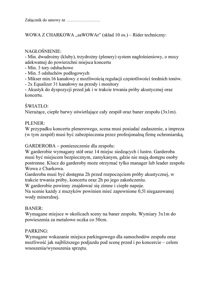 Załącznik do umowy nr …………………… WOWA Z CHARKOWA „saWOWAr” (skład 10 os.) – Rider techniczny: NAGŁOŚNIENIE: - Min. dwudrożny (kluby), trzydrożny (plenery) system nagłośnieniowy, o mocy adekwatnej do powierzchni miejsca koncertu - Min. 3 tory odsłuchowe - Min. 5 odsłuchów podłogowych - Mikser min.16 kanałowy z możliwością regulacji częstotliwości średnich tonów. - 2x Equalizer 31 kanałowy na przody i monitory - Akustyk do dyspozycji przed jak i w trakcie trwania próby akustycznej oraz koncertu. ŚWIATŁO: Nierażące, ciepłe barwy oświetlające cały zespół oraz baner zespołu (3x1m). PLENER: W przypadku koncertu plenerowego, scena musi posiadać zadaszenie, a impreza (w tym zespół) musi być zabezpieczona przez profesjonalną firmę ochroniarską. GARDEROBA – pomieszczenie dla zespołu: W garderobie wymagany stół oraz 14 miejsc siedzących i lustro. Garderoba musi być miejscem bezpiecznym, zamykanym, gdzie nie mają dostępu osoby postronne. Klucz do garderoby może otrzymać tylko manager lub leader zespołu Wowa z Charkowa. Garderoba musi być dostępna 2h przed rozpoczęciem próby akustycznej, w trakcie trwania próby, koncertu oraz 2h po jego zakończeniu. W garderobie powinny znajdować się zimne i ciepłe napoje. Na scenie każdy z muzyków powinien mieć zapewnione 0,5l niegazowanej wody mineralnej. BANER: Wymagane miejsce w okolicach sceny na baner zespołu. Wymiary 3x1m do powieszenia za metalowe oczka co 50cm. PARKING: Wymagane wskazanie miejsca parkingowego dla samochodów zespołu oraz możliwość jak najbliższego podjazdu pod scenę przed i po koncercie – celem wnoszenia/wynoszenia sprzętu. Perkusja: - standardowe nagłośnienie wraz z kablami: Stopa*, Werbel*, Tom*, Hihat, Overhead 2szt. - monitor* Gitara basowa: - gniazdo 230V z uziemieniem* - wejście do miksera wraz z kablami (1 kanał Jack + Dibox)* - monitor Gitara akustyczna: - gniazdo 230V z uziemieniem* - wejście do miksera wraz z kablami: (1 kanał Jack + Dibox)* albo (mikrofon* + statyw) - monitor Mandolina + wokal: - wyższe krzesło lub hoker - wejście do miksera wraz z kablami: (1 kanał Jack + Dibox)* + (mikrofon + statyw)* - monitor* Melodyka + wokal: - wejście do miksera wraz z kablami: mikrofon* + statyw* - monitor* Trąbka, Alto Saks, Tenor Saks, Puzon: - wejścia do miksera wraz z kablami: (4 mikrofony + 4 statywy)* - monitor* Piano: - gniazdo 230V z uziemieniem* - wejścia do miksera wraz z kablami: (1 kanał Jack + Dibox)* - monitor* *- pozycje wymagane do min. klubowego, reszta to min. plenerowe. MONITOR MONITOR MONITOR MONITOR wokal, melodyka piano G mandolina, wokal G sekcja dęta LEGENDA: GITARA, BAS G G MONITOR perkusja Wszelkie pytania lub zmiany prosimy konsultować: (+48) 664 929 616 [email protected] G = gniazdko elektryczne, kontakt.