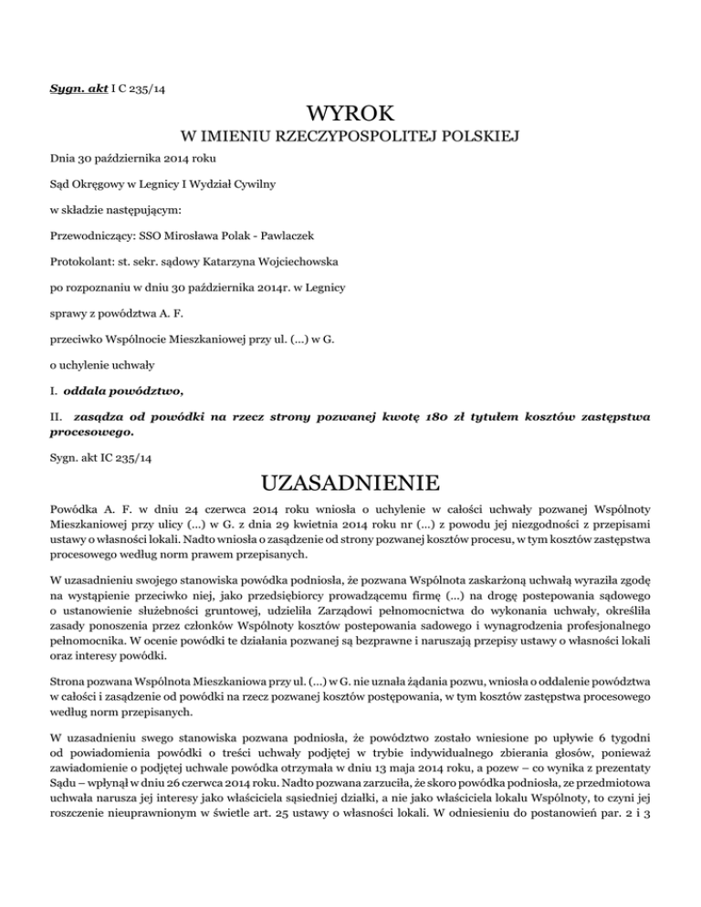 Sygn. akt I C 235/14 WYROK W IMIENIU RZECZYPOSPOLITEJ POLSKIEJ Dnia 30 października 2014 roku Sąd Okręgowy w Legnicy I Wydział Cywilny w składzie następującym: Przewodniczący: SSO Mirosława Polak - Pawlaczek Protokolant: st. sekr. sądowy Katarzyna Wojciechowska po rozpoznaniu w dniu 30 października 2014r. w Legnicy sprawy z powództwa A. F. przeciwko Wspólnocie Mieszkaniowej przy ul. (...) w G. o uchylenie uchwały I. oddala powództwo, II. zasądza od powódki na rzecz strony pozwanej kwotę 180 zł tytułem kosztów zastępstwa procesowego. Sygn. akt IC 235/14 UZASADNIENIE Powódka A. F. w dniu 24 czerwca 2014 roku wniosła o uchylenie w całości uchwały pozwanej Wspólnoty Mieszkaniowej przy ulicy (...) w G. z dnia 29 kwietnia 2014 roku nr (...) z powodu jej niezgodności z przepisami ustawy o własności lokali. Nadto wniosła o zasądzenie od strony pozwanej kosztów procesu, w tym kosztów zastępstwa procesowego według norm prawem przepisanych. W uzasadnieniu swojego stanowiska powódka podniosła, że pozwana Wspólnota zaskarżoną uchwałą wyraziła zgodę na wystąpienie przeciwko niej, jako przedsiębiorcy prowadzącemu firmę (...) na drogę postepowania sądowego o ustanowienie służebności gruntowej, udzieliła Zarządowi pełnomocnictwa do wykonania uchwały, określiła zasady ponoszenia przez członków Wspólnoty kosztów postepowania sadowego i wynagrodzenia profesjonalnego pełnomocnika. W ocenie powódki te działania pozwanej są bezprawne i naruszają przepisy ustawy o własności lokali oraz interesy powódki. Strona pozwana Wspólnota Mieszkaniowa przy ul. (...) w G. nie uznała żądania pozwu, wniosła o oddalenie powództwa w całości i zasądzenie od powódki na rzecz pozwanej kosztów postępowania, w tym kosztów zastępstwa procesowego według norm przepisanych. W uzasadnieniu swego stanowiska pozwana podniosła, że powództwo zostało wniesione po upływie 6 tygodni od powiadomienia powódki o treści uchwały podjętej w trybie indywidualnego zbierania głosów, ponieważ zawiadomienie o podjętej uchwale powódka otrzymała w dniu 13 maja 2014 roku, a pozew – co wynika z prezentaty Sądu – wpłynął w dniu 26 czerwca 2014 roku. Nadto pozwana zarzuciła, że skoro powódka podniosła, ze przedmiotowa uchwała narusza jej interesy jako właściciela sąsiedniej działki, a nie jako właściciela lokalu Wspólnoty, to czyni jej roszczenie nieuprawnionym w świetle art. 25 ustawy o własności lokali. W odniesieniu do postanowień par. 2 i 3 zaskarżonej uchwały, pozwana zarzuciła, że mają one charakter wykonawczy wobec postanowienia par. 1 uchwały i nie stanowią obejścia prawa. Sąd ustalił: Powódka A. F. jako deweloper jest właścicielem niesprzedanych jeszcze lokali w nieruchomości Wspólnoty, położonej w G. przy ul. (...) i członkiem pozwanej Wspólnoty Mieszkaniowej. (dowód: odpis księgi wieczystej k.13-32) W dniu 29 kwietnia 2014 roku pozwana Wspólnota Mieszkaniowa w G. przy ulicy (...), w trybie indywidualnego zbierania głosów, podjęła uchwałę nr (...) w sprawie: 1/ wyrażenia zgody na wystąpienie przez Wspólnotę na drogę postepowania sądowego przeciwko A. F., jako deweloperowi - o ustanowienie bezpłatnej służebności gruntowej: przejazdu i przechodu przez działki stanowiące własność powódki oraz korzystania z terenu utwardzonego, na którym usytuowane jest składowisko odpadów komunalnych, a który znajduje się na działce stanowiącej własność powódki, 2/ udzielenia Zarządowi pełnomocnictwa do wykonania niniejszej uchwały, 3/ pokrycia ze środków na rzecz utrzymania nieruchomości wspólnej ewentualnych kosztów postepowania sądowego, 4/ ustalenia, ze wynagrodzenie zastępstwa procesowego nastąpi na poziomie określonym w Rozporządzeniu Ministra Sprawiedliwości w sprawie opłat za czynności adwokackie oraz ponoszenia przez Skarb Państwa kosztów nieopłaconej pomocy prawnej udzielonej z urzędu . Uchwałę podjęto większością głosów „za” 1458/2740 do 80/2740 głosów „przeciw”. (dowód: uchwała k. 10-11) W dniu 29 kwietnia 2014 roku przesłano powódce zawiadomienie o treści podjętej uchwały nr (...) oraz innych jeszcze uchwałach podjętych w trybie indywidualnego zbierania głosów w okresie od 18 do 27 marca 2014 roku. Treść zawiadomienia dotarła do powódki w dniu 13 maja 2014 roku. Pozew o uchylenie zaskarżonej uchwały powódka nadała na poczcie w dniu 24 czerwca 2014 roku. (dowód: zawiadomienie k. 12, dowód nadania k. 59, koperta k. 35) Po podjęciu uchwały Zarządca Wspólnoty skierował do powódki pisma z wezwaniem do ustanowienia nieodpłatnej służebności w zakresie objętym zaskarżoną uchwałą. Powódka odmówiła ustanowienia służebności, albowiem twierdzi, że żądania wspólnoty są bezzasadne. (dowód: pisma wraz z załączonymi mapami k. 60-63, zeznania pozwanych) Powódka jako deweloper otrzymała pozwolenie na budowę a następnie pozwolenie na użytkowanie wybudowanego przez nią budynku mieszkalnego wielorodzinnego, w którym znajdują się lokale Wspólnoty. (dowód: decyzje k. 76-79) Sąd uznał: Żądanie pozwu nie zasługuje na uwzględnienie. Roszczenie powódki dotyczące uchylenia uchwały wynika z treści art. 25 ustawy z dnia 24 czerwca 1994 roku o własności lokali (tekst jednolity Dz. U. Nr 80 z 2000 r. poz. 903 z późn. zm), który stanowi, iż właściciel lokalu może zaskarżyć do sądu uchwałę z powodu jej niezgodności z prawem, umową właścicieli albo, gdy narusza ona zasady prawidłowego zarządu nieruchomością wspólną lub w inny sposób narusza jego interesy. W myśl ust. 2 tego przepisu powództwo może być wytoczone przeciwko wspólnocie mieszkaniowej w terminie 6 tygodni od podjęcia uchwały na zebraniu albo od dnia powiadomienia wytaczającego powództwo o treści uchwały podjętej w trybie indywidualnego zbierania głosów. Zgodnie z przyjętą linią orzecznictwa dotyczącego