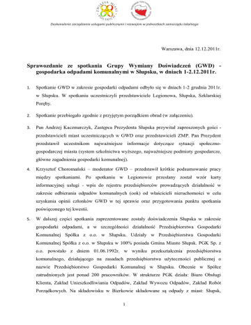 Warszawa, dnia 12.12.2011r. Sprawozdanie ze spotkania Grupy Wymiany Doświadczeń (GWD) gospodarka odpadami komunalnymi w Słupsku, w dniach 1-2.12.2011r. 1. Spotkanie GWD w zakresie gospodarki odpadami odbyło się w dniach 1-2 grudnia 2011r. w Słupsku. W spotkaniu uczestniczyli przedstawiciele Legionowa, Słupska, Szklarskiej Poręby. 2. Spotkanie przebiegało zgodnie z przyjętym porządkiem obrad (w załączeniu). 3. Pan Andrzej Kaczmarczyk, Zastępca Prezydenta Słupska przywitał zaproszonych gości przedstawicieli miast uczestniczących w GWD oraz przedstawicieli ZMP. Pan Prezydent przedstawił uczestnikom najważniejsze informacje dotyczące sytuacji społecznogospodarczej miasta (system szkolnictwa wyższego, najważniejsze podmioty gospodarcze, główne zagadnienia gospodarki komunalnej). 4. Krzysztof Choromański – moderator GWD – przedstawił krótkie podsumowanie pracy między spotkaniami. Po spotkaniu w Legionowie przesłany został wzór karty informacyjnej usługi - wpis do rejestru przedsiębiorców prowadzących działalność w zakresie odbierania odpadów komunalnych (ook) od właścicieli nieruchomości w celu uzyskania opinii członków GWD w tej sprawie oraz przygotowania punktu spotkania poświęconego tej kwestii. 5. W dalszej części spotkania zaprezentowane zostały doświadczenia Słupska w zakresie gospodarki odpadami, a w szczególności działalność Przedsiębiorstwa Gospodarki Komunalnej Spółka z o.o. w Słupsku. Udziały w Przedsiębiorstwa Gospodarki Komunalnej Spółka z o.o. w Słupsku w 100% posiada Gmina Miasto Słupsk. PGK Sp. z o.o. powstało z dniem 01.06.1992r. w wyniku przekształcenia przedsiębiorstwa komunalnego, działającego na zasadach przedsiębiorstwa użyteczności publicznej o nazwie Przedsiębiorstwo Gospodarki Komunalnej w Słupsku. Obecnie w Spółce zatrudnionych jest ponad 200 pracowników. W strukturze PGK działa: Biuro Obsługi Klienta, Zakład Unieszkodliwiania Odpadów, Zakład Wywozu Odpadów, Zakład Robót Porządkowych. Na składowisku w Bierkowie składowane są odpady z miast: Słupsk, 1 Ustka, Sławno oraz gmin: Słupsk, Ustka Kobylnica, Damnica, Główczyce, Dębnica Kaszubska, Smołdzino, Postomino, Trzebielino. 6. Następnie omówiony został obecny stan prac w gminach GWD w zakresie wdrażania zmian legislacyjnych w gospodarowaniu odpadami komunalnymi, ze szczególnym uwzględnieniem przygotowania procedury rejestracji podmiotów odbierających odpady komunalne. W przedyskutowany została sytuacja komunalnych zakładów budżetowych w świetle nowych regulacji prawnych, a przede wszystkim możliwość odbierania przez te zakłady odpadów komunalnych z nieruchomości zamieszkałych. W trakcie dyskusji ustalono, że obecnie można spotkać dwie skrajne interpretacje przepisów dotyczących tej kwestii. Niejasności prawne w tej sprawie utrudniają podjęcie działań niezbędnych do wdrażania nowych rozwiązań w gospodarowaniu odpadami m.in. w Szklarskiej Porębie. 7. Omówione zostały także uwarunkowania formalne i kwestie praktyczne dotyczące regulowanej działalności gospodarczej w zakresie odbierania odpadów komunalnych. Ostatnim punktem prac pierwszego dnia było podsumowanie dyskusji w kontekście braku rozporządzenia Ministra Środowiska w sprawie szczegółowych wymagań w zakresie odbierania odpadów komunalnych od właścicieli nieruchomości. 8. Drugi dzień spotkania GWD rozpoczął się wizytą w terenie. Zaprezentowany został Dom Przedpogrzebowy (z krematorium) na nowym cmentarzu komunalnym przy ul. Zachodniej w Słupsku. Budowa tej inwestycji kosztowała 4,7 mln zł. Wzniesione zostały pomieszczenia o ogólnej powierzchni 913 m kw. Obecnie trwają formalne przygotowania do uzyskania pozwolenia na użytkowanie przez wykonawcę. 9. W dalszej części Grupa przejechała na teren Zakładu Unieszkodliwiania Odpadów w Bierkowie stanowiącego własność Przedsiębiorstwa Gospodarki Komunalnej Spółka z o.o. w Słupsku. Udziały w Przedsiębiorstwa Gospodarki Komunalnej Spółka z o.o. w Słupsku w 100% posiada Gmina Miasto Słupsk. W strukturze ZUO funkcjonuje składowisko odpadów stałych. Składowisko zostało wybudowane w 1985 r. Przewiduje się jego eksploatację do 2020 roku. Całkowita powierzchnia składowiska to 16,48 ha. W chwili obecnej teren eksploatowany wynosi 10.21 ha i obejmuje wypełnione (stare) składowisko o pow. 6,45 ha uszczelnione metodą tradycyjną pyłami podymowymi oraz zbiornik A o pow. 3,76 ha wyłożony warstwą szczelnej grubej folii PHED zwanej "geomembraną" podzielony na czynne kwatery A1 i A2. W celu pozyskania gazu wysypiskowego na obszarze 8,95 ha składowiska odpadów stałych, wykonano 34 odwierty gazu i zamontowano instalację odgazowania złoża. Gaz kolektorami zbiorczymi doprowadzono 2 do budynków generatorów, gdzie za pomocą 2 zespołów prądotwórczych przetwarzany jest na energię elektryczną i cieplną (blok cieplny). Energia ta pokrywa potrzeby całego zaplecza technicznego i socjalnego składowiska, a nadmiar sprzedawany jest do Zakładu Energetycznego. Składowisko wyposażone jest w kwaterę o pow. 0,66 ha do składowania odpadów zawierających azbest. Kwatera ta posiada drogę technologiczną z placem manewrowym i wyizolowane dno z drenażem odcieków. Jest ogrodzona i obsadzona zielenią na zboczach skarp. W zakładzie znajduje się również sortownia odpadów zmieszanych przeznaczona jest do sortowania odpadów komunalnych na następujące rodzaje: makulatura, kartony, tworzywa sztuczne miękkie (folia), butelki PET, opakowania chemii gospodarczej, puszki aluminiowe, szkło opakowaniowe, opakowania wielowarstwowe typu tetrapak. Planowana wydajność linii sortowniczej wynosi 42.500 ton odpadów rocznie w czasie jednej zmiany. Odpady dostarczane są samochodami służb komunalnych do tzw. strefy buforowej obiektu. Tam wybierane są elementy wielkogabarytowe, a pozostała masa odpadów taśmociągiem kierowana jest do kabiny w