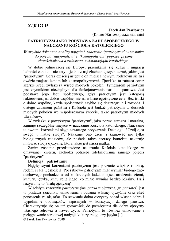 Українська полоністика. Випуск 6. Історико-філософські дослідження УДК 172.15 Jacek Jan Pawłowicz (Києво-Житомирська дієцезія) PATRIOTYZM JAKO PODSTAWA ŁADU SPOŁECZNEGO W NAUCZANIU KOŚCIOŁA KATOLICKIEGO W artykule dokonano analizy pojęcia i znaczenie "patriotyzmu" w stosunku do pojęcia "nacjonalizm" i "kosmopolityzm" poprzez pryzmę chrześcijaństwa a zwłaszcza światopoglądu katolickiego. W dobie jednoczącej się Europy, przenikania się kultur i migracji ludności zanika – niestety – jedno z najszlachetniejszych uczuć, jakim jest "patriotyzm". Coraz częściej ustępuje on miejsca nowym, rodzącym się tu i owdzie nacjonalizmom lub kosmopolityzmowi. Zjawisko to zatacza coraz szersze kręgi zwłaszcza wśród młodych pokoleń. Tymczasem patriotyzm jest czynnikiem niezbędnym dla funkcjonowania narodu i państwa. Jest podstawą jego ładu społecznego, gdyż patriotyzm jest kategorią nakierowaną na dobro wspólne, nie na własne egoistyczne cele. Bez troski o dobro wspólne, każda społeczność szybko się dezintegruje i rozpada. I dlatego zadaniem państwa i Kościoła jest budzić patriotyzm w duszach młodych pokoleń we współczesnym świecie, także patriotyzm młodych Ukraińców. W związku z powyższym "patriotyzm", jako norma etyczna i moralna, zajmuje szczególne miejsce w nauczaniu Kościoła katolickiego. Nauczanie to swoimi korzeniami sięga czwartego przykazania Dekalogu: "Czcij ojca swego i matkę swoją". Nakazuje ono czcić i szanować nie tylko biologicznych rodziców, ale posiada także szerszy kontekst, nakazuje miłować swoją ojczyznę, która także jest naszą matką. Zanim zostanie przedstawione nauczanie Kościoła katolickiego w omawianej kwestii, zachodzi potrzeba zdefiniowania samego pojęcia "patriotyzm". Definicja "patriotyzmu" Najgłębszymi korzeniami patriotyzmu jest poczucie więzi z rodziną, rodem i całą ludzkością. Początkowo patriotyzm miał wymiar biologicznoduchowego pochodzenia od konkretnych ludzi, miejsca urodzenia, ziemi, kultury, języka, kultu religijnego, co miało wymiar bardzo lokalny. Dziś nazywamy to "małą ojczyzną". W ścisłym znaczeniu patriotyzm (łac. patria = ojczyzna, gr. patriotes) jest to postawa szacunku, umiłowania i oddania własnej ojczyźnie oraz chęć ponoszenia za nią ofiar. To stawianie dobra ojczyzny ponad własne dobro i wypełnianie obowiązków zapisanych w konstytucji danego państwa. Charakteryzuje się on też gotowością do poświęcenia dla dobra ojczyzny własnego zdrowia a nawet życia. Patriotyzm to również umiłowanie i pielęgnowanie narodowej tradycji, kultury, religii czy języka [1]. © Jacek Jan Pawłowicz, 2009 30 Jacek Jan Pawłowicz. Patriotyzm jako podstawa ładu społecznego w nauczaniu Kościoła katolickiego Cechami prawdziwego patrioty jest umiłowanie własnej ojczyzny i narodu. Miłość ta może być realizowana w różnoraki sposób poprzez np. kultywowanie tradycji, oddawanie czci bohaterom narodowym i pamięć o nich, jak i również działania na rzecz danej społeczności; uczestnictwo w wyborach, czy też świadomą postawę obywatelską. Patriotyzm wiąże się także z poszanowaniem i tolerancją dla innych narodów, które zamieszkują terytorium danego państwa, wraz z ich kulturą i tradycjami. W konsekwencji mamy kilka podstawowych rodzajow patriotyzmu: narodowy, państwowy, cywilizacyjny, a nawet i religijny. 1. Patriotyzm narodowy jest to poczucie szczególnej więzi z narodem, a więc z tą wspólnotą, do której się należy i z której się pochodzi, np. obywatele polscy narodowości ukraińskiej uważają się raczej za patriotów ukraińskich; Polacy w Ameryce, nawet w drugim i trzecim pokoleniu, uważają bardzo często naród polski za ojczysty; Żydzi żyjący w diasporze po całym świecie czują się przede wszystkim patriotami narodowości żydowskiej, nie zaś państwa ani nawet religii. 2. Patriotyzm państwowy jest to poczucie organicznej więzi z państwem, w którego obrębie leży "mała ojczyzna" i często może to być państwo wielonarodowe, jak Rzym, I Rzeczpospolita Polska, Rosja, USA. Ludzie różnych narodowości czują się Rzymianami, Ukraińcami, Amerykanami. 3. Patriotyzm cywilizacyjny, czyli poczucie więzi człowieka z całą cywilizacją pochodzenia i rozwoju. Na przykład Europejczyk jest patriotą cywilizacji łacińskiej. Oczywiście, patriotyzm cywilizacyjny czy kulturowy nie jest tak mocno emocjonalny jak np. narodowy. 4. Patriotyzm duchowo-religijny, czyli głębokie wiązanie się z religią lub Kościołem pochodzenia i wychowania, z wyznaniem ojców i dziadów, z ich obrządkiem, liturgią, obyczajami religijnymi. Zaprezentowane rodzaje patriotyzmu mogą się wzajemnie przenikać i mieszać, decyduje przy tym pochodzenie i wychowanie człowieka, ale nie jest to bynajmniej proces mechaniczny. Decydująca jest wola i wybór samego człowieka, to on dokonuje wyboru jakie odniesienie uzna za podstawowe. W każdym razie trzeba mocno podkreślić, że ojczyzna we właściwym znaczeniu to nie tylko: ziemia, okolica, rośliny, zwierzęta, klimat, ale przede wszystkim ludzie, którzy tworzą daną społeczność, a więc rodzice, rodzina, ród, krewni, nauczyciele, wychowawcy, grupy rówieśnicze, koleżeństwo, następnie większe wspolnoty, jak wspolnoty pracownicze, państwo, naród. Ci wszyscy ludzie zrodzili nas fizycznie, osobowościowo czy duchowo, wychowali, ukształtowali, także przez swoje zalety, wartości, idee, obyczaje, kulturę, język, sposoby życia, wierzenia. W zakres zaś patriotyzmu wysokiego wchodzą większe społeczności: naród, państwo, kultura, religia. 31 Українська полоністика. Випуск 6. Історико-філософські дослідження Patriotyzm a nacjonalizm i kosmopolityzm Patriotyzm stoi w jawnej sprzeczności z nacjonalizmem i kosmopolityzmem. Patrio