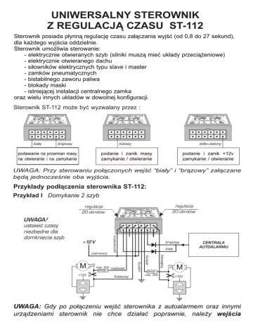 UNIWERSALNY STEROWNIK Z REGULACJ¥ CZASU ST-112 Sterownik posiada p³ynn¹ regulacjê czasu za³¹czania wyjœæ (od 0,8 do 27 sekund), dla ka¿dego wyjœcia oddzielnie. Sterownik umo¿liwia sterowanie: - elektrycznie otwieranych szyb (silniki musz¹ mieæ uk³ady przeci¹¿eniowe) - elektrycznie otwieranego dachu - si³owników elektrycznych typu slave i master - zamków pneumatycznych - bistabilnego zaworu paliwa - blokady maski - istniej¹cej instalacji centralnego zamka oraz wielu innych uk³adów w dowolnej konfiguracji. Sterownik ST-112 mo¿e byæ wyzwalany przez : bia³y br¹zowy ró¿owy ¿ó³to-zielony podanie i zanik masy zamykanie / otwieranie podawanie na przemian masy na otwieranie i na zamykanie podanie i zanik +12v zamykanie / otwieranie UWAGA: Przy sterowaniu po³¹czonych wejœæ “bia³y” i “br¹zowy” za³¹czane bêd¹ jednoczeœnie oba wyjœcia. Przyk³ady pod³¹czenia sterownika ST-112: Przyk³ad I Domykanie 2 szyb regulacja 20 obrotów M +12V +U max. 20A bezp. niebieski fioletowy bia³y bezp. max. 20A fioletowy czerwony br¹zowy zielony +12 V czarny UWAGA! ustawiæ czasy niezbêdne dla domkniêcia szyb pomarañcz. regulacja 20 obrotów +U CENTRALA AUTOALARMU M +12V UWAGA: Gdy po po³¹czeniu wejœæ sterownika z autoalarmem oraz innymi urz¹dzeniami sterownik nie chce dzia³aæ poprawnie, nale¿y wejœcia sterownika odseparowaæ diodami od reszty uk³adu. Przyk³ad II Sterowanie zamkami pneumatycznymi W samochodach, w których centralny zamek jest sterowany na przemian mas¹ i +12v (np. zamki pneumatyczne AUDI, MERCEDES), nale¿y odnaleŸæ przewód steruj¹cy, rozci¹æ i ustaliæ kierunki - do prze³¹cznika w drzwiach i do modu³u steruj¹cego (pompy). Na przewodzie musi pojawiaæ siê na przemian masa i +12v podczas zamykania i otwierania. UWAGA! W przypadku b³êdnego ustalenia kierunków, podczas sterowania nast¹pi zwarcie i uszkodzenie bezpiecznika oraz prze³¹cznika steruj¹cego w drzwiach. Sterownik pod³¹czyæ wg. rysunku: regulacja 20 obrotów regulacja 20 obrotów UWAGA! ustawiæ po 4 sekundy dla obu wyjœæ +12 V + 13,6 v PW ALTERNATOR +12 V br¹zowy 3A ¿ó³to-zielony czerwony czarny ró¿owy POMPA niebieski ci¹æ PRZE£¥CZNIK W DRZWIACH CENTRALA AUTOALARMU fioletowy lub CENTRALA AUTOALARMU albo CENTRALA AUTOALARMU bia³y Przyk³ad III Domykanie dachu sterowanego elektrycznie UWAGA! Ustawiæ czas niezbêdny dla zamkniêcia szyberdachu regulacja 20 obrotów + U przy zamykaniu bezp. wy³¹cznik steruj¹cy dachem niebieski bia³y fioletowy czerwony CENTRALA AUTOALARMU wy³¹cznik krañcowy dachu max. 20A +12 V pomarañcz. regulacja 20 obrotów centralka steruj¹ca dachem M