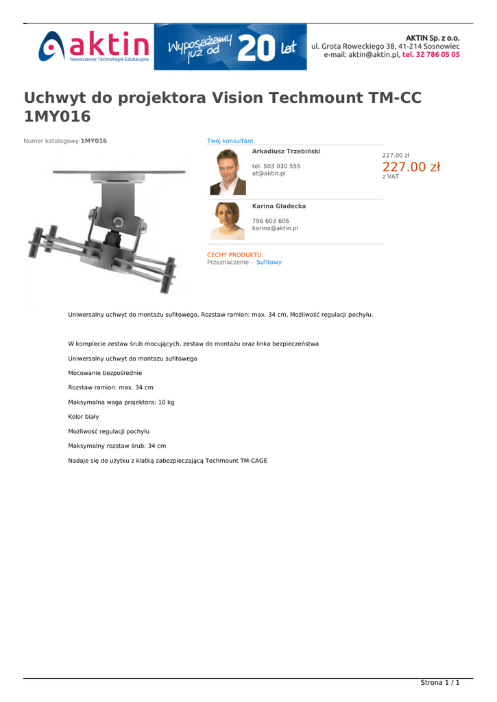 Uchwyt do projektora Vision Techmount TM-CC 1MY016 Numer katalogowy:1MY016 Twój konsultant Arkadiusz Trzebiński tel. 503 030 555 [email protected] NOWOŚĆ W OFERCIE 227.00 zł 227.00 zł z VAT Karina Gładecka 796 603 606 [email protected] CECHY PRODUKTU: Przeznaczenie - Sufitowy Uniwersalny uchwyt do montażu sufitowego, Rozstaw ramion: max. 34 cm, Możliwość regulacji pochyłu. W komplecie zestaw śrub mocujących, zestaw do montażu oraz linka bezpieczeństwa Uniwersalny uchwyt do montazu sufitowego Mocowanie bezpośrednie Rozstaw ramion: max. 34 cm Maksymalna waga projektora: 10 kg Kolor biały Możliwość regulacji pochyłu Maksymalny rozstaw śrub: 34 cm Nadaje się do użytku z klatką zabezpieczającą Techmount TM-CAGE Strona 1 / 1 Powered by TCPDF (www.tcpdf.org)