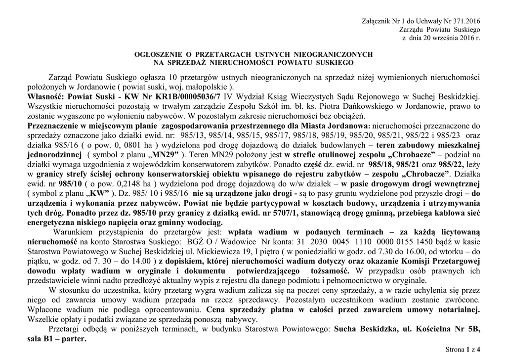 Załącznik Nr 1 do Uchwały Nr 371.2016 Zarządu Powiatu Suskiego z dnia 20 września 2016 r. OGŁOSZENIE O PRZETARGACH USTNYCH NIEOGRANICZONYCH NA SPRZEDAŻ NIERUCHOMOŚCI POWIATU SUSKIEGO Zarząd Powiatu Suskiego ogłasza 10 przetargów ustnych nieograniczonych na sprzedaż niżej wymienionych nieruchomości położonych w Jordanowie ( powiat suski, woj. małopolskie ). Własność: Powiat Suski - KW Nr KR1B/00005036/7 IV Wydział Ksiąg Wieczystych Sądu Rejonowego w Suchej Beskidzkiej. Wszystkie nieruchomości pozostają w trwałym zarządzie Zespołu Szkół im. bł. ks. Piotra Dańkowskiego w Jordanowie, prawo to zostanie wygaszone po wyłonieniu nabywców. W pozostałym zakresie nieruchomości bez obciążeń. Przeznaczenie w miejscowym planie zagospodarowania przestrzennego dla Miasta Jordanowa: nieruchomości przeznaczone do sprzedaży oznaczone jako działki ewid. nr: 985/13, 985/14, 985/15, 985/17, 985/18, 985/19, 985/20, 985/21, 985/22 i 985/23 oraz działka 985/16 ( o pow. 0, 0801 ha ) wydzielona pod drogę dojazdową do działek budowlanych – teren zabudowy mieszkalnej jednorodzinnej ( symbol z planu „MN29” ). Teren MN29 położony jest w strefie otulinowej zespołu „Chrobacze” – podział na działki wymaga uzgodnienia z wojewódzkim konserwatorem zabytków. Ponadto część dz. ewid. nr 985/18, 985/21 oraz 985/22, leży w granicy strefy ścisłej ochrony konserwatorskiej obiektu wpisanego do rejestru zabytków – zespołu „Chrobacze”. Działka ewid. nr 985/10 ( o pow. 0,2148 ha ) wydzielona pod drogę dojazdową do w/w działek – w pasie drogowym drogi wewnętrznej ( symbol z planu „KW” ). Dz. 985/ 10 i 985/16 nie są urządzone jako drogi - są to pasy gruntu wydzielone pod przyszłe drogi – do urządzenia i wykonania przez nabywców. Powiat nie będzie partycypował w kosztach budowy, urządzenia i utrzymywania tych dróg. Ponadto przez dz. 985/10 przy granicy z działką ewid. nr 5707/1, stanowiącą drogę gminną, przebiega kablowa sieć energetyczna niskiego napięcia oraz gminny wodociąg. Warunkiem przystąpienia do przetargów jest: wpłata wadium w podanych terminach – za każdą licytowaną nieruchomość na konto Starostwa Suskiego: BGŻ O / Wadowice Nr konta: 31 2030 0045 1110 0000 0155 1450 bądź w kasie Starostwa Powiatowego w Suchej Beskidzkiej ul. Mickiewicza 19, I piętro ( w poniedziałki w godz. od 7.30 do 16.00, od wtorku – do piątku, w godz. od 7. 30 – do 14.00 ) z dopiskiem, której nieruchomości wadium dotyczy oraz okazanie Komisji Przetargowej dowodu wpłaty wadium w oryginale i dokumentu potwierdzającego tożsamość. W przypadku osób prawnych ich przedstawiciele winni nadto przedłożyć aktualny wypis z rejestru dla danego podmiotu i pełnomocnictwo w oryginale. W stosunku do uczestnika, który przetarg wygra wadium zalicza się na poczet ceny sprzedaży, a w razie uchylenia się przez niego od zawarcia umowy wadium przepada na rzecz sprzedawcy. Pozostałym uczestnikom wadium zostanie zwrócone. Wpłacone wadium nie podlega oprocentowaniu. Cena sprzedaży płatna w całości przed zawarciem umowy notarialnej. Wszelkie opłaty i podatki związane ze sprzedażą ponoszą nabywcy. Przetargi odbędą w poniższych terminach, w budynku Starostwa Powiatowego: Sucha Beskidzka, ul. Kościelna Nr 5B, sala B1 – parter. Strona 1 z 4 Bliższe informacje: Wydział Geodezji, Kartografii, Katastru i Gospodarki Mieniem Starostwa Suskiego: Sucha Beskidzka, ul. Mickiewicza 19, pok. Nr: 103 – I piętro, tel. ( 0 – 33 ) 87 – 57 – 830. Przed przystąpieniem do przetargów można zapoznać się z dokumentacją dotyczącą sprzedawanych nieruchomości. Zdjęcie nieruchomości znajduje się na stronie internetowej Powiatu Suskiego www.powiatsuski.pl. Zastrzega się prawo odwołania przetargów z ważnych powodów. Opis nieruchomości, terminy i warunki przetargów: A / Przetargi w dniu 24 października 2016 r. – wpłata wadium do 18 października 2016 r. Godz. przetargu Oznaczenie nieruchomości jako przedmiotu sprzedaży wg ewidencji gruntów ( nr ew. działki ) Powierzchnia w ha ( dot. działek budowlanych; pow. działek wydzielonych pod drogi do działek budowlanych wynosi odpowiednio 985 / 10 - 0,2148 ha 985 / 16 – 0,0801 ha Opis nieruchomości Cena wywoławcza Minimalne postąpienie Wadium ( w pieniądzu polskim ) ( 1 % ceny wywoławczej ) 985 / 13 + udział Godz. 09. 00 Godz. 11. 00 1/6 cz. w dz. 985 / 16 oraz + udział 1/10 cz. w dz. 985 / 10 - wydzielonych pod 0,1583 ha drogi do działek budowlanych 985 / 14 + udział 1/6 cz. w dz. 985 / 16 oraz + udział 1/10 cz. w dz. 985 / 10 - 0,1788 ha - wydzielonych pod drogi do działek budowlanych 985 / 15 + udział Godz. 13. 00 1/6 cz. w dz. 985 / 16 oraz + udział 1/10 cz. w dz. 985 / 10 - wydzielonych pod drogi do działek budowlanych 0,1610 ha Niezabudowana, nieuzbrojona teren lekko pochyły, ze spadkiem w kierunku ul. Gen. Maczka, kształt działki regularny, zbliżony do trapezu 112 600,00 zł Niezabudowana, nieuzbrojona teren lekko pochyły ze spadkiem w kierunku ul. Gen. Maczka, kształt regularny zbliżony do trapezu 125 000,00 zł Niezabudowana, nieuzbrojona teren lekko pochyły, ze spadkiem w kierunku ul. Gen. Maczka, kształt działki regularny, zbliżony do trapezu, na granicy dz. zadrzewienia nieograniczające możliwości zagospodarowania działki 1 390,00 zł 20 000,00 zł 1 540,00 zł 20 000,00 zł 1 410,00 zł 20 000,00 zł + 23 % VAT + VAT 23 % 114 300,00 zł + VAT 23 % Strona 2 z 4 B / Przetargi w dniu 25 października 2016 r. – wpłata wadium do 19 października 2016 r. Godz. przetargu Godz. 09. 00 Oznaczenie nieruchomości wg ewidencji gruntów ( nr ew. działki ) 985 / 17 + udział 1/6 cz. w dz. 985 / 16 oraz + udział 1/10 cz. w dz. 985 / 10 - Pow. w ha ( pow. dz. 985 / 10 i 985 / 16 – jak w tabeli „ A” ) Opis nieruchomości Cena wywoławcza 84 200,00 zł 0,1105 ha Niezabudowana, nieuzbrojona teren lekko pochyły, ze spadkiem w kierunku u