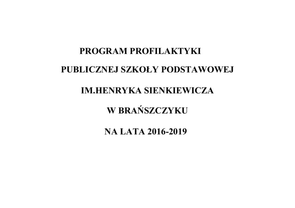 PROGRAM PROFILAKTYKI PUBLICZNEJ SZKOŁY PODSTAWOWEJ IM.HENRYKA SIENKIEWICZA W BRAŃSZCZYKU NA LATA 2016-2019 I PODSTAWA PRAWNA Program profilaktyki w Publicznej Szkole Podstawowej im. Henryka Sienkiewicza w Brańszczyku kieruje się celami i zasadami zawartymi w Statucie Szkoły i został opracowany w oparciu o następujące akty prawne: Konstytucja Rzeczypospolitej Polskiej Konwencja Praw Dziecka Ustawa z dnia 24 kwietnia 1997 r.o przeciwdziałaniu narkomanii (Dz. U. z 2003 r.nr.24,poz.198) Rozporządzenie MENiS z dnia 14 marca 2007 r. zmieniające rozporządzenie w sprawie statutów publicznego przedszkola i publicznych szkół (Dz.U. z 2007r. nr 35, poz. 222); Rozporządzenie MENiS z dnia 7 stycznia 2003 r. w sprawie zasad udzielania i organizacji pomocy psychologiczno-pedagogicznej w publicznych przedszkolach, szkołach i placówkach (Dz.U. nr 11 z dnia 7stycznia 2003r., poz. 114); Ustawa z dnia 26 października 1982r. o wychowaniu w trzeźwości i przeciwdziałaniu alkoholizmowi, rozdział 1, art. 2,1;(tekst jednolity z 28 marca 2007r. Dz .U .Nr 70, poz. 473) Ustawa z dnia 13 marca 2007 r. o przeciwdziałaniu alkoholizmowi, narkomanii;(ze zmianami z 10 czerwca 2010 r. Dz. U. z 2010 r. Nr 143, poz. 962) Ustawa z dnia 9 listopada 1995 r. o ochronie zdrowia przed następstwami używania tytoniu i wyrobów tytoniowych;(ze zmianami z 23 listopada 2003r.) Ustawa z dnia 19 sierpnia1994 r. o ochronie zdrowia psychicznego (Dz.U. z 2009 r. Nr76, poz. 641,N 98, poz.817 ) 2 Rozporządzenie MENiS z dnia 31 stycznia 2003r. w sprawie szczegółowych form działalności wychowawczej i zapobiegawczej wśród młodzieży zagrożonej uzależnieniem (Dz.U. nr 26 z 2003 r., poz.226). Rozporządzenie Rady Ministrów z dnia 23 czerwca 2015 poz.972 w sprawie realizacji Rządowego programu wspomagania w latach 2015-2018 organów prowadzących szkoły w zapewnieniu bezpiecznych warunków nauki, wychowania i opieki w szkołach ,,Bezpieczna+”. II ZAŁOŻENIA PROGRAMU Założenia programu są zgodne z: Programem Wychowawczym Szkoły; Szkolnym Zestawem Programów Nauczania; Statutem Szkoły. A. Profilaktyka rozumiana jako zapobieganie występowania niepożądanych procesów i zjawisk określanych jako przejawy patologii życia społecznego, jako system działań wzmacniających lub podtrzymujących różne, dodatnie społecznie postawy uczniów jest realizowana podczas działań edukacyjnych szkoły ,tj. w ramach godzin wychowawczych i w postaci różnych zajęć profilaktyczno-wychowawczych. B. Tworzenie Szkolnego Programu Profilaktyki zostało poprzedzone dyskusją wychowawców z uczniami na godzinach wychowawczych oraz nauczycieli z rodzicami na zebraniach rodzicielskich na podstawie wniosków ustalono diagnozę potrzeb uczniów, nauczycieli 3 i rodziców. C. Profilaktyka w naszej szkole będzie koncentrować się na wzmocnieniu czynników chroniących: - rozwijanie zainteresowań uczniów oraz przeciwdziałanie niepowodzeniom szkolnym; - wyrabianie umiejętności (zdolności) samodzielnego dokonywania wyboru zachowań właściwych dla zdrowia własnego i innych ludzi; - wspomaganie rozwoju moralnego uczniów (poszanowania norm, wartości, autorytetów); - stworzenie uczniom możliwości przynależności do pozytywnych grup rówieśniczych, kół zainteresowań, zespołów sportowych, muzycznych, itp.; - wspomaganie rodziców w prawidłowym pełnieniu przez nich funkcji wychowawczych. D. Działalność profilaktyczna szkoły pozostaje w ścisłym związku z działalnością profilaktyczną w środowisku lokalnym. Szkoła współpracuje z następującymi instytucjami: placówki kulturalno-oświatowe (Gminny Ośrodek Kultury, Gminna Biblioteka ,); placówki oświatowo-opiekuńcze (Poradnia Psychologiczno-Pedagogiczna, Gminna Komisja Rozwiązywania Problemów Alkoholowych, Gminny Ośrodek Pomocy Społecznej, Gminne Centrum Pomocy Rodzinie, Zakładem Opiekuńczo-Wychowawczym dla dzieci i młodzieży); stowarzyszenia i organizacje ( Samorząd Szkolny, Rada Rodziców ); wymiar sprawiedliwości ( sąd, policja). 4 IV DIAGNOZA ZACHOWAŃ PROBLEMOWYCH WYSTĘPUJĄCYCH W NASZEJ SZKOLE Aby profilaktyka była skuteczna, należy objąć nią nie tylko uczniów ale również i rodziców. Diagnozę zachowań problemowych przeprowadzono w dwóch obszarach: uczniowie i rodzice. Pytania diagnostyczne dotyczyły następujących problemów: - Czy szkoła jest bezpieczna i co o tym decyduje ? - Jakie oczekiwania mają uczniowie i ich rodzice w stosunku do szkoły? - Co uczniowie sądzą o lekcjach wychowawczych? - W jakim stopniu jest przydatny wewnątrzszkolny system oceniania? - Czy w szkole pali się papierosy, pije alkohol, bierze narkotyki? - W jakich warunkach i atmosferze w rodzinach wychowują się nasi uczniowie? Do uściślenia diagnozy wykorzystano informacje uzyskane z dzienniczków uwag, analizy frekwencji uczniów oraz ocen z poszczególnych przedmiotów, a także obserwacji zachowań uczniów ,rozmów z wychowawcami, nauczycielami, rodzicami, pracownikami szkoły Po przeprowadzeniu rozmów z uczniami na godzinie wychowawczej oraz dyskusji rodziców z wychowawcami na zebraniach rodzicielskich wyciągnięto następujące wnioski, które sformułowano jako niepokojące zjawiska , którym należy przeciwdziałać 5 Niepokojącymi zjawiskami okazały się: u uczniów: przemoc rówieśnicza; używanie wulgaryzmów; zaburzony system wartości; agresja; niszczenie mienia społecznego; niedbałość o własne zdrowie i zdrowie innych oraz higienę osobistą palenie papierosów u rodziców: małe zainteresowanie swoimi dziećmi; niewłaściwe umiejętności wychowawcze; przemoc wobec dzieci; uzależnienia; konflikty w rodzinie, sąsiedztwie 6 CELE SZCZEGÓŁOWE Ograniczenie zjawiska agresji wśród uczniów. Wzmacnianie bezpieczeństwa uczniówwspółpraca z organami pozarządowymi w ramach realizacji Rządowego programu wspomagania szkół w latach 2015-2018 Szkoła ,,Bezpieczna+” Szkoła otwarta na zewnątrz-budowanie po