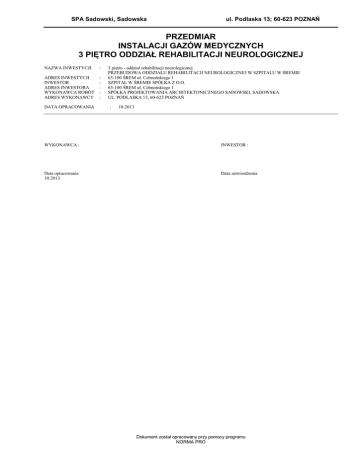 SPA Sadowski, Sadowska ul. Podlaska 13; 60-623 POZNAŃ PRZEDMIAR INSTALACJI GAZÓW MEDYCZNYCH 3 PIĘTRO ODDZIAŁ REHABILITACJI NEUROLOGICZNEJ NAZWA INWESTYCJI : ADRES INWESTYCJI INWESTOR ADRES INWESTORA WYKONAWCA ROBÓT ADRES WYKONAWCY : : : : : DATA OPRACOWANIA 3 piętro - oddział rehabilitacji neurologicznej PRZEBUDOWA ODDZIAŁU REHABILITACJI NEUROLOGICZNEJ W SZPITALU W ŚREMIE 63-100 ŚREM ul. Cełmońskiego 1 SZPITAL W ŚREMIE SPÓŁKA Z O.O. 63-100 ŚREM ul. Cełmońskiego 1 SPÓŁKA PROJEKTOWANIA ARCHITEKTONICZNEGO SADOWSKI, SADOWSKA UL. PODLASKA 13, 60-623 POZNAŃ : 10.2013 WYKONAWCA : INWESTOR : Data opracowania 10.2013 Data zatwierdzenia Dokument został opracowany przy pomocy programu NORMA PRO INSTALACJA GAZÓW MEDYCZNYCH- ODDZIAŁ NEUROLOGICZNY OBMIAR Lp. Podstawa Opis i wyliczenia INSTALACJA GAZÓW MEDYCZNYCH - ODDZIAŁ NEUROLOGICZNY 1 INSTALACJA GAZÓW MEDYCZNYCH 1 KNR 7-28 Wykucie bruzd pionowych lub skośnych o przekroju do 100 cm2 w ścianach murowad.1 0209-04 nych 22*2.3 2 KNR 7-28 d.1 0203-03 3 KNR 7-28 d.1 0203-02 4 KNR 7-28 d.1 0203-01 5 KNR 2-15 d.1 0601-02 6 KNR 2-15 d.1 0601-03 7 KNR 2-15 d.1 0601-04 8 KNR 2-15 d.1 0601-05 9 KNR 2-15 d.1 0604-06 10 KNR 2-15 d.1 0604-05 11 KNR 2-15 d.1 0604-05 12 KNR 2-15 d.1 0604-04 13 KNR 2-15 d.1 0604-03 14 KNR 2-15 d.1 0604-03 15 KNR 2-15 d.1 0604-04 16 KNR 2-15 d.1 0606-05 17 KNR 2-15 d.1 0606-04 18 KNR 2-15 d.1 0606-03 19 KNR 2-15 d.1 0606-05 j.m. m Przebicie otworów dla przewodów instalacyjnych o średnicy do 50 mm w ścianach muro- otw. wanych o grub. 1 ceg. 14 otw. Przebicie otworów dla przewodów instalacyjnych o średnicy do 50 mm w ścianach muro- otw. wanych o grub. 1/2 ceg. 13 otw. Rurociągi miedziane na ciśnienie do 1.0 MPa o śr.zew. 10 mm na ścianach w instalacjach m gazów medycznych 134 m Rurociągi miedziane na ciśnienie do 1.0 MPa o śr.zew. 12 mm na ścianach w instalacjach m gazów medycznych 196 m Rurociągi miedziane na ciśnienie do 1.0 MPa o śr.zew. 18 mm na ścianach w instalacjach m gazów medycznych 196 m Rurociągi miedziane na ciśnienie do 1.0 MPa o śr.zew. 22 mm na ścianach w instalacjach m gazów medycznych 46 m Trójniki miedziane gładkie o śr.zew. 28x28 mm w instalacjach gazów medycznych szt. 2 szt. Trójniki miedziane gładkie o śr.zew. 22x22 mm w instalacjach gazów medycznych szt. 6 szt. Trójniki miedziane gładkie o śr.zew. 22x18 mm w instalacjach gazów medycznych szt. 16 szt. Trójniki miedziane gładkie o śr.zew. 18x12 mm w instalacjach gazów medycznych - w obiektach modernizowanych 16 szt. Trójniki miedziane gładkie o śr.zew. 12x10 mm w instalacjach gazów medycznych szt. 26 szt. Trójniki miedziane gładkie o śr.zew. 18x12x18 mm w instalacjach gazów medycznych szt. 52 szt. Trójniki miedziane gładkie o śr.zew. 12x10x12mm w instalacjach gazów medycznych szt. 52 szt. Złączki miedziane gładkie o śr.zew. 22x18 mm w instalacjach gazów medycznych - redukcje 16 szt. Złączki miedziane gładkie o śr.zew. 18x12 mm w instalacjach gazów medycznych - redukcje 16 szt. Złączki miedziane gładkie o śr.zew. 18x12 mm w instalacjach gazów medycznych - redukcje 16 szt. Złączki miedziane gładkie o śr.zew. 22 mm w instalacjach gazów medycznych - mufy szt. 84 szt. Norma PRO Wersja 4.44 Nr seryjny: 5365 Razem m Przebicie otworów dla przewodów instalacyjnych o średnicy do 50 mm w ścianach muro- otw. wanych o grub. 1 1/2 ceg. 4 otw. -2- Poszcz. szt. szt. szt. szt. 50.600 RAZEM 50.600 4.000 RAZEM 4.000 14.000 RAZEM 14.000 13.000 RAZEM 13.000 134.000 RAZEM 134.000 196.000 RAZEM 196.000 196.000 RAZEM 196.000 46.000 RAZEM 46.000 2.000 RAZEM 2.000 6.000 RAZEM 6.000 16.000 RAZEM 16.000 16.000 RAZEM 16.000 26.000 RAZEM 26.000 52.000 RAZEM 52.000 52.000 RAZEM 52.000 16.000 RAZEM 16.000 16.000 RAZEM 16.000 16.000 RAZEM 16.000 84.000 RAZEM 84.000 INSTALACJA GAZÓW MEDYCZNYCH- ODDZIAŁ NEUROLOGICZNY OBMIAR Lp. Podstawa 20 KNR 2-15 d.1 0606-04 21 KNR 2-15 d.1 0606-03 22 KNR 2-15 d.1 0606-05 23 KNR 2-15 d.1 0606-04 24 KNR 2-15 d.1 0606-03 25 KNR 2-15 d.1 0606-03 26 KNR 2-15 d.1 0606-04 27 KNR 2-15 d.1 0606-05 28 KNR 2-15 d.1 0613-01 29 KNR 2-15 d.1 0613-01 30 KNR 2-15 d.1 0613-01 31 KNR 2-15 d.1 0619-01 32 KNR 2-15 d.1 0618-01 33 KNR 2-15 d.1 0634-04 34 KNR 2-15 d.1 0634-05 35 KNR 2-15 d.1 0634-06 36 KNR 2-15 d.1 0634-07 37 KNR 2-15 d.1 0634-08 38 KNR 2-15 d.1 0633-01 39 KNR 2-15 d.1 0633-02 Opis i wyliczenia Złączki miedziane gładkie o śr.zew. 18 mm w instalacjach gazów medycznych - mufy j.m. szt. 194 szt. Złączki miedziane gładkie o śr.zew. 12 mm w instalacjach gazów medycznych - mufy szt. 84 szt. Złączki miedziane gładkie o śr.zew. 22 mm w instalacjach gazów medycznych - kolana szt. 32*2 szt. Złączki miedziane gładkie o śr.zew. 18 mm w instalacjach gazów medycznych - kolana szt. 32 szt. Złączki miedziane gładkie o śr.zew. 12 mm w instalacjach gazów medycznych - kolana szt. 90 szt. Złączki miedziane gładkie o śr.zew. 12 mm w instalacjach gazów medycznych - kolana jedno mufowe 120 szt. Złączki miedziane gładkie o śr.zew. 18 mm w instalacjach gazów medycznych - kolana jedno mufowe 36 szt. Złączki miedziane gładkie o śr.zew. 22 mm w instalacjach gazów medycznych - kolana jedno mufowe 36 szt. Punkty poboru gazów medycznych - tlenu kpl. 43 kpl. Punkty poboru gazów medycznych - powietrza kpl. 11 kpl. Punkty poboru gazów medycznych - próżnia kpl. 43 kpl. Ścienne tablice zaworowe dla trzech gazów kpl. 3 kpl. Aparaty sygnalizacyjne w instalacjach gazów medycznych kpl. 3 kpl. Połączenia lutowane elementów instalacji gazów medycznych przy śr.rury 10 mm szt. 340 szt. Połączenia lutowane elementów instalacji gazów medycznych przy śr.rury 12 mm szt. 290 szt. Połączenia lutowane elementów instalacji gazów medycznych przy śr.rury 18 mm szt. 190 szt. Połączenia lutowane elementów instalacji gazów medycznych przy śr.rury 22 mm szt. 80 szt. Połączenia lutowane elementów instalacji gazów medycznych przy śr.rury 28 mm szt. 