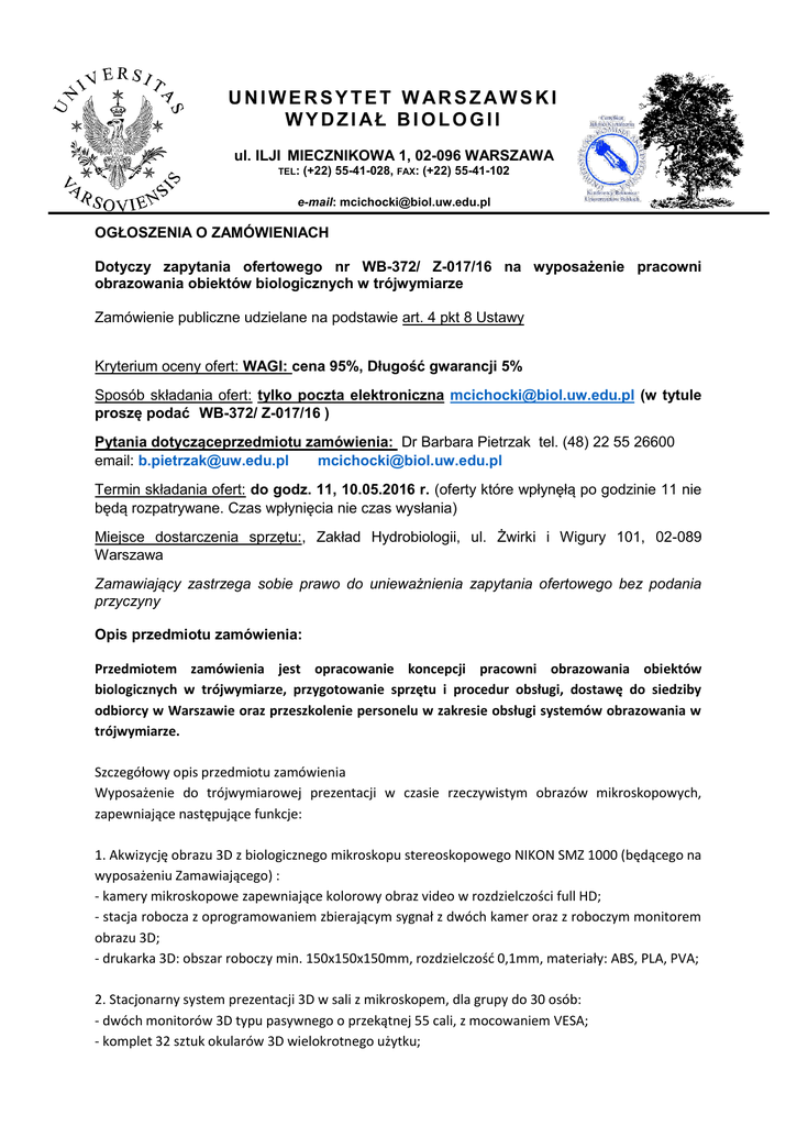 UNIWERSYTET WARSZAWSKI WYDZI AŁ BIOLOGII ul. ILJI MIECZNIKOWA 1, 02-096 WARSZAWA TEL: (+22) 55-41-028, FAX: (+22) 55-41-102 e-mail: [email protected] OGŁOSZENIA O ZAMÓWIENIACH Dotyczy zapytania ofertowego nr WB-372/ Z-017/16 na wyposażenie pracowni obrazowania obiektów biologicznych w trójwymiarze Zamówienie publiczne udzielane na podstawie art. 4 pkt 8 Ustawy Kryterium oceny ofert: WAGI: cena 95%, Długość gwarancji 5% Sposób składania ofert: tylko poczta elektroniczna [email protected] (w tytule proszę podać WB-372/ Z-017/16 ) Pytania dotycząceprzedmiotu zamówienia: Dr Barbara Pietrzak tel. (48) 22 55 26600 email: [email protected] [email protected] Termin składania ofert: do godz. 11, 10.05.2016 r. (oferty które wpłynęłą po godzinie 11 nie będą rozpatrywane. Czas wpłynięcia nie czas wysłania) Miejsce dostarczenia sprzętu:, Zakład Hydrobiologii, ul. Żwirki i Wigury 101, 02-089 Warszawa Zamawiający zastrzega sobie prawo do unieważnienia zapytania ofertowego bez podania przyczyny Opis przedmiotu zamówienia: Przedmiotem zamówienia jest opracowanie koncepcji pracowni obrazowania obiektów biologicznych w trójwymiarze, przygotowanie sprzętu i procedur obsługi, dostawę do siedziby odbiorcy w Warszawie oraz przeszkolenie personelu w zakresie obsługi systemów obrazowania w trójwymiarze. Szczegółowy opis przedmiotu zamówienia Wyposażenie do trójwymiarowej prezentacji w czasie rzeczywistym obrazów mikroskopowych, zapewniające następujące funkcje: 1. Akwizycję obrazu 3D z biologicznego mikroskopu stereoskopowego NIKON SMZ 1000 (będącego na wyposażeniu Zamawiającego) : - kamery mikroskopowe zapewniające kolorowy obraz video w rozdzielczości full HD; - stacja robocza z oprogramowaniem zbierającym sygnał z dwóch kamer oraz z roboczym monitorem obrazu 3D; - drukarka 3D: obszar roboczy min. 150x150x150mm, rozdzielczość 0,1mm, materiały: ABS, PLA, PVA; 2. Stacjonarny system prezentacji 3D w sali z mikroskopem, dla grupy do 30 osób: - dwóch monitorów 3D typu pasywnego o przekątnej 55 cali, z mocowaniem VESA; - komplet 32 sztuk okularów 3D wielokrotnego użytku; 3. Mobilny system prezentacji 3D dla grupy do 100 osób: - układ projekcyjny: serwer obrazu 3D, 2 projektory DLP o jasności min. 3500 ANSI i rozdzielczości min. 1920x1080 px, stolik o dwóch blatach – górny min wys. 120cm, stojak 3D z adjustacją zbieżności obrazów; - ekran do 3D pasywnego o wymiarach minimum 3,3 x 1,8 m (16:9), na składanej aluminiowej ramie, przenośny, w kontenerze transportowym z kółkami; - wzmacniacz audio z głośnikami; - komplet 100 sztuk okularów 3D wielokrotnego użytku. Dostawca: - zapewni wszystkie wymagane do uruchomienia przewody i akcesoria; - uruchomi sprzęt we wskazanych pomieszczeniach Zamawiającego; - przeszkoli personel w zakresie obsługi sprzętu i oprogramowania 3D. Zamawiający nie dopuszcza składania ofert częściowych – rozpatrywane będą tylko oferty kompletne. Termin wykonania zamówienia: - 20.08.2016 – zakup i instalacja elementów pracowni; - 20.09.2016 – przetestowanie elementów i uruchomienie pracowni oraz przeszkolenie pracowników. Obowiązkowo w ofercie na sprzęt: PRODUCENT TYP URZĄDZENIA CENA netto/brutto Długość gwarancji ............................................................................................... ................................................................................................ .................................................................................................. ......................................................................................................