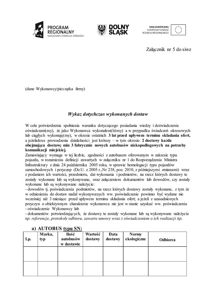 Załącznik nr 5 do siwz (dane Wykonawcy/pieczątka firmy) Wykaz dotychczas wykonanych dostaw W celu potwierdzenia spełniania warunku dotyczącego posiadania wiedzy i doświadczenia oświadczam(my), że jako Wykonawca wykonałem(liśmy) a w przypadku świadczeń okresowych lub ciągłych wykonuję(my), w okresie ostatnich 3 lat przed upływem terminu składania ofert, a jeżeliokres prowadzenia działalności jest krótszy – w tym okresie: 2 dostawy każda obejmująca dostawę min 3 fabrycznie nowych autobusów niskopodłogowych na potrzeby komunikacji miejskiej. Zamawiający wymaga w tej liczbie, zgodności z autobusem oferowanym w zakresie typu pojazdu, w rozumieniu definicji zawartych w załączniku nr 1 do Rozporządzenia Ministra Infrastruktury z dnia 24 października 2005 roku, w sprawie homologacji typu pojazdów samochodowych i przyczep (Dz.U. z 2005 r.,Nr 238, poz. 2010, z późniejszymi zmianami) wraz z podaniem ich wartości, przedmiotu, dat wykonania i podmiotów, na rzecz których dostawy te zostały wykonane lub są wykonywane, oraz załączeniem dokumentów lub dowodów, czy zostały wykonane lub są wykonywane należycie: - dowodów tj. poświadczenia podmiotów, na rzecz których dostawy zostały wykonane, z tym że w odniesieniu do dostaw nadal wykonywanych ww. poświadczenie powinno być wydane nie wcześniej niż 3 miesiące przed upływem terminu składania ofert; a jeżeli z uzasadnionych przyczyn o obiektywnym charakterze wykonawca nie jest w stanie uzyskać ww. poświadczenia - oświadczenie Wykonawcy lub - dokumentów potwierdzających, że dostawy te zostały wykonane lub są wykonywane należycie np. referencje, protokoły odbioru, zawarte umowy wraz z oświadczeniem o ich realizacji itp. a) AUTOBUS typu SN: Lp. Marka, typ Ilość autobusów w dostawie Wartość dostawy Data dostawy Normy ekologiczne Odbiorca b) AUTOBUS typu KN: Lp. Marka, typ Ilość autobusów w dostawie Wartość dostawy Data dostawy Normy ekologiczne Odbiorca Na potwierdzenie wykonania w/w dostaw załączam dokumenty potwierdzające ich należyte wykonanie. Prawdziwość powyższych danych potwierdzam(my) własnoręcznym podpisem świadom(mi) odpowiedzialności karnej z art. 297 Kodeksu karnego. ………………………… …………………………………. Miejscowość i data podpis i pieczątka Upoważnionego przedstawiciela Wykonawcy 2/2