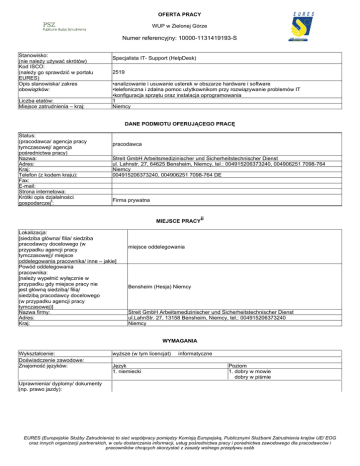 OFERTA PRACY WUP w Zielonej Górze Numer referencyjny: 10000-1131419193-S Stanowisko: (nie należy używać skrótów) Kod ISCO: (należy go sprawdzić w portalu EURES) Opis stanowiska/ zakres obowiązków: Liczba etatów: Miejsce zatrudnienia – kraj: Specjalista IT- Support (HelpDesk) 2519 •analizowanie i usuwanie usterek w obszarze hardware i software •telefoniczna i zdalna pomoc użytkownikom przy rozwiązywanie problemów IT •konfiguracja sprzętu oraz instalacja oprogramowania 1 Niemcy DANE PODMIOTU OFERUJĄCEGO PRACĘ Status: (pracodawca/ agencja pracy tymczasowej/ agencja pośrednictwa pracy) Nazwa: Adres: Kraj: Telefon (z kodem kraju): Fax: E-mail: Strona internetowa: Krótki opis działalności gospodarczeji: pracodawca Streit GmbH Arbeitsmedizinischer und Sicherheitstechnischer Dienst ul. Lahnstr. 27, 64625 Bensheim, Niemcy, tel.: 004915206373240, 004906251 7098-764 Niemcy 004915206373240, 004906251 7098-764 DE Firma prywatna MIEJSCE PRACYii Lokalizacja: [siedziba główna/ filia/ siedziba pracodawcy docelowego (w przypadku agencji pracy tymczasowej)/ miejsce oddelegowania pracownika/ inne – jakie] Powód oddelegowania pracownika: [należy wypełnić wyłącznie w przypadku gdy miejsce pracy nie jest główną siedzibą/ filią/ siedzibą pracodawcy docelowego (w przypadku agencji pracy tymczasowej)] Nazwa firmy: Adres: Kraj: miejsce oddelegowania Bensheim (Hesja) Niemcy Streit GmbH Arbeitsmedizinischer und Sicherheitstechnischer Dienst ul.LahnStr. 27, 13158 Bensheim, Niemcy, tel.: 004915206373240 Niemcy WYMAGANIA Wykształcenie: Doświadczenie zawodowe: Znajomość języków: wyższe (w tym licencjat) Język 1. niemiecki informatyczne Poziom 1. dobry w mowie dobry w piśmie Uprawnienia/ dyplomy/ dokumenty (np. prawo jazdy): EURES (Europejskie Służby Zatrudnienia) to sieć współpracy pomiędzy Komisją Europejską, Publicznymi Służbami Zatrudnienia krajów UE/ EOG oraz innych organizacji partnerskich, w celu dostarczania informacji, usług pośrednictwa pracy i poradnictwa zawodowego dla pracodawców i pracowników chcących skorzystać z zasady wolnego przepływu osób Inne istotne wymagania: •znajomość powszechnie stosowanego oprogramowania (Microsoft Windows, MS Office, Client-Security, przeglądarki internetowe) i sprzętu komputerowego (PC, sieci LAN i WLAN, routery i modemy UMTS/DSL, urządzenia peryferyjne, ISDN) •doświadczenie w pracy z oprogramowaniem do zdalnego wsparcia technicznego, np. Teamviewer lub PCVisit. •wykształcenie jako inżynier informaty lub licencjat na kierunku informatyka lub podobne WYNAGRODZENIE I WARUNKI ZATRUDNIENIA Wysokość pensji brutto: Wysokość pensji netto: Waluta, w jakiej wypłacana jest pensja: Rodzaj stawki wynagrodzenia: (godzinowa/ tygodniowa/ miesięczna/ roczna/ inna) Premie: Dodatkowe świadczenia (zakwaterowanie, wyżywienie, koszty związane ze zmianą miejsca zamieszkania, koszty podróży itp.): Nazwa firmy, z którą zostanie podpisana umowa: Rodzaj umowy: (umowa o pracę, umowa zlecenia, wolontariat, praktyka zawodowa/ staż, praca zdalna, agencja pracy tymczasowej, inne): Wymiar czasu pracy (praca na pełen etat/ część etatu): Czas trwania umowy: (nieokreślony/ określony) 10,00 Liczba godzin tygodniowo: Zmiany i praca w dni wolne: Data rozpoczęcia: Inne informacje: 40,00 Praca w systemie jednozmianowym Euro Czasowo-premiowy ze staw. godz Pracodawca pomaga w znalezieniu zakwaterowania. Streit GmbH Arbeitsmedizinischer und Sicherheitstechnischer Dienst umowa o pracę pełen etat nieokreślony Data wygaśnięcia umowy (w przypadku umowy na czas określony): Praca w systemie jednozmianowym SPOSÓB SKŁADANIA WNIOSKU Wymagane dokumenty (list motywacyjny, CV itp.): Język, w którym muszą być sporządzone przedkładane dokumenty: Do kogo należy wysłać dokumenty: (do pracodawcy/ doradcy EURES) Gdzie należy wysłać dokumenty: (adres, adres e-mail, nr faksu z kodem kraju itp.) Dane teleadresowe doradcy EURES lub przedstawiciela pracodawcy: (nazwisko, adres, telefon, fax, e-mail itp.) CV w języku niemieckim, kopie uprawnień oraz posiadane rekomendacje. niemiecki do pracodawcy Prosimy o przesłanie aplikacji, załaczajac CV w j. niemieckim, kopie uprawnien oraz posiadane rekomendacje na adres mailowy: [email protected] Kontakt telefoniczny: +49 152 063 732 40. Prosimy o przesłanie aplikacji, załaczajac CV w j. niemieckim, kopie uprawnien oraz posiadane rekomendacje na adres mailowy: [email protected] Kontakt telefoniczny: +49 152 063 732 40. DODATKOWE INFORMACJE Zastrzegamy sobie prawo do kontaktowania się z wybranymi kandydatami. WAŻNOŚĆ 2016-01-12 Data publikacji: Termin przedkładania podań o pracę / 2016-03-12 zakończenia ważności oferty: Uprzejmie informujemy, że skontaktujemy się wyłącznie z wybranymi kandydatami. UWAGA: 1. Umowa z zagranicznym pracodawcą jest zawierana, co do zasady, zgodnie z prawem kraju zatrudnienia. Oznacza to, że wszystkie roszczenia odnośnie warunków, które obejmuje umowa, można kierować wyłącznie do odpowiedniego sądu w kraju zatrudnienia. EURES (Europejskie Służby Zatrudnienia) to sieć współpracy pomiędzy Komisją Europejską, Publicznymi Służbami Zatrudnienia krajów UE/ EOG oraz innych organizacji partnerskich, w celu dostarczania informacji, usług pośrednictwa pracy i poradnictwa zawodowego dla pracodawców i pracowników chcących skorzystać z zasady wolnego przepływu osób Publiczne służby zatrudnienia (EURES) nie mogą pośredniczyć ani reprezentować pracownika w sądzie kraju zatrudnienia w przypadku sporu z pracodawcą. 2. Publiczne służby zatrudnienia (EURES) dokładają wszelkich starań, aby zapewnić rzetelność i wiarygodność ofert pracy zgłoszonych w lokalnym urzędzie pracy. Należy wyjaśnić, że oferta pracy została zgłoszona przez stronę trzecią i EURES nie odpowiada za ewentualne rozbieżności między warunkami pracy określonymi w ofercie pracy i warunkami oferowanymi przez potencjalnego pr