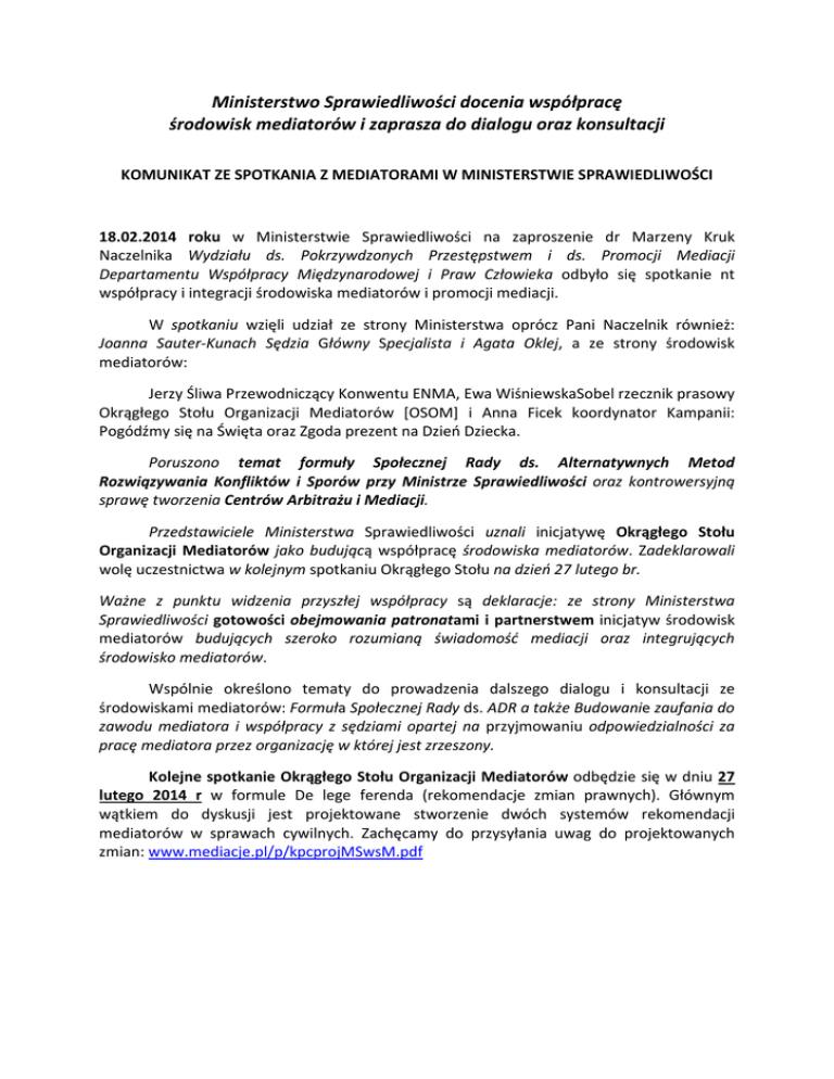 Ministerstwo Sprawiedliwości docenia współpracę środowisk mediatorów i zaprasza do dialogu oraz konsultacji KOMUNIKAT ZE SPOTKANIA Z MEDIATORAMI W MINISTERSTWIE SPRAWIEDLIWOŚCI 18.02.2014 roku w Ministerstwie Sprawiedliwości na zaproszenie dr Marzeny Kruk Naczelnika Wydziału ds. Pokrzywdzonych Przestępstwem i ds. Promocji Mediacji Departamentu Współpracy Międzynarodowej i Praw Człowieka odbyło się spotkanie nt współpracy i integracji środowiska mediatorów i promocji mediacji. W spotkaniu wzięli udział ze strony Ministerstwa oprócz Pani Naczelnik również: Joanna Sauter-Kunach Sędzia Główny Specjalista i Agata Oklej, a ze strony środowisk mediatorów: Jerzy Śliwa Przewodniczący Konwentu ENMA, Ewa WiśniewskaSobel rzecznik prasowy Okrągłego Stołu Organizacji Mediatorów [OSOM] i Anna Ficek koordynator Kampanii: Pogódźmy się na Święta oraz Zgoda prezent na Dzień Dziecka. Poruszono temat formuły Społecznej Rady ds. Alternatywnych Metod Rozwiązywania Konfliktów i Sporów przy Ministrze Sprawiedliwości oraz kontrowersyjną sprawę tworzenia Centrów Arbitrażu i Mediacji. Przedstawiciele Ministerstwa Sprawiedliwości uznali inicjatywę Okrągłego Stołu Organizacji Mediatorów jako budującą współpracę środowiska mediatorów. Zadeklarowali wolę uczestnictwa w kolejnym spotkaniu Okrągłego Stołu na dzień 27 lutego br. Ważne z punktu widzenia przyszłej współpracy są deklaracje: ze strony Ministerstwa Sprawiedliwości gotowości obejmowania patronatami i partnerstwem inicjatyw środowisk mediatorów budujących szeroko rozumianą świadomość mediacji oraz integrujących środowisko mediatorów. Wspólnie określono tematy do prowadzenia dalszego dialogu i konsultacji ze środowiskami mediatorów: Formuła Społecznej Rady ds. ADR a także Budowanie zaufania do zawodu mediatora i współpracy z sędziami opartej na przyjmowaniu odpowiedzialności za pracę mediatora przez organizację w której jest zrzeszony. Kolejne spotkanie Okrągłego Stołu Organizacji Mediatorów odbędzie się w dniu 27 lutego 2014 r w formule De lege ferenda (rekomendacje zmian prawnych). Głównym wątkiem do dyskusji jest projektowane stworzenie dwóch systemów rekomendacji mediatorów w sprawach cywilnych. Zachęcamy do przysyłania uwag do projektowanych zmian: www.mediacje.pl/p/kpcprojMSwsM.pdf Więcej informacji i przyjmowanie zgłoszeń do udziału w spotkaniu 27.02.2014: Ewa Wiśniewska-Sobel rzecznik prasowy tel. + 48 666 829 997, [email protected]