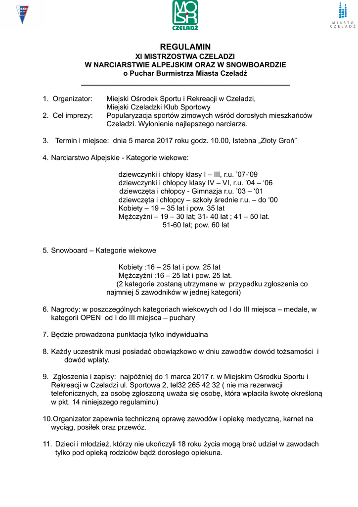 REGULAMIN XI MISTRZOSTWA CZELADZI W NARCIARSTWIE ALPEJSKIM ORAZ W SNOWBOARDZIE o Puchar Burmistrza Miasta Czeladź ____________________________________________________ 1. Organizator: 2. Cel imprezy: Miejski Ośrodek Sportu i Rekreacji w Czeladzi, Miejski Czeladzki Klub Sportowy Popularyzacja sportów zimowych wśród dorosłych mieszkańców Czeladzi. Wyłonienie najlepszego narciarza. 3. Termin i miejsce: dnia 5 marca 2017 roku godz. 10.00, Istebna „Złoty Groń” 4. Narciarstwo Alpejskie - Kategorie wiekowe: dziewczynki i chłopy klasy I – III, r.u. ’07-‘09 dziewczynki i chłopcy klasy IV – VI, r.u. ’04 – ‘06 dziewczęta i chłopcy - Gimnazja r.u. ’03 – ‘01 dziewczęta i chłopcy – szkoły średnie r.u. – do ‘00 Kobiety – 19 – 35 lat i pow. 35 lat Mężczyźni – 19 – 30 lat; 31- 40 lat ; 41 – 50 lat. 51-60 lat; pow. 60 lat 5. Snowboard – Kategorie wiekowe Kobiety :16 – 25 lat i pow. 25 lat Mężczyźni :16 – 25 lat i pow. 25 lat. (2 kategorie zostaną utrzymane w przypadku zgłoszenia co najmniej 5 zawodników w jednej kategorii) 6. Nagrody: w poszczególnych kategoriach wiekowych od I do III miejsca – medale, w kategorii OPEN od I do III miejsca – puchary 7. Będzie prowadzona punktacja tylko indywidualna 8. Każdy uczestnik musi posiadać obowiązkowo w dniu zawodów dowód tożsamości i dowód wpłaty. 9. Zgłoszenia i zapisy: najpóźniej do 1 marca 2017 r. w Miejskim Ośrodku Sportu i Rekreacji w Czeladzi ul. Sportowa 2, tel32 265 42 32 ( nie ma rezerwacji telefonicznych, za osobę zgłoszoną uważa się osobę, która wpłaciła kwotę określoną w pkt. 14 niniejszego regulaminu) 10.Organizator zapewnia techniczną oprawę zawodów i opiekę medyczną, karnet na wyciąg, posiłek oraz przewóz. 11. Dzieci i młodzież, którzy nie ukończyli 18 roku życia mogą brać udział w zawodach tylko pod opieką rodziców bądź dorosłego opiekuna. 12. Każdy uczestnik zawodów ubezpiecza się we własnym zakresie i oświadcza iż zapoznał się z niniejszym regulaminem przed przystąpieniem do zawodów. 13. Każdy uczestnik zawodów musi posiadać własny sprzęt narciarski. 14. Każdy uczestnik zawodów oraz opiekun zobowiązany jest uiścić opłatę w wysokości 40,00 złotych 15. Wszystkich uczestników obowiązują przepisy ustalone przez organizatora i sędziego głównego zawodów. Organizator zastrzega sobie prawo zmian w regulaminie. 16. Uczestnik imprezy wyraża dobrowolnie zgodę na zbieranie i przetwarzanie swoich danych osobowych, na zasadach zawartych w Ustawie o ochronie danych osobowych z dnia 29.08.1997r. (Dz. U. z 2002r. Nr 101, poz.926 ze zm.) oraz wyraża dobrowolnie zgodę na wykorzystanie wizerunku przez Miejski Ośrodek Sportu i Rekreacji z siedzibą w Czeladzi przy ul. Sportowej 2 w celach niezbędnych do wykonania statutowych zadań MOSiR. Klasyfikacją objęci zostaną tylko mieszkańcy Czeladzi 17. Wyjazd w dniu zawodów tj. 05.03.2017 roku (niedziela) I autokar Hala MOSiR Czeladź, ul. Sportowa 2 – zbiórka 5.30, wyjazd 6.00 II autokar parking LIDL – zbiórka 6.00, wyjazd 6.30 18. W przypadku niekorzystnych warunków atmosferycznych organizator ma prawo odwołać zawody.