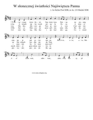 W słonecznej światłości Najświętsza Panna t.: ks.Stefan Pruś SDB, m.:ks. I.O.Mański SDB 43 1.W sło ne cznej li ściach Ma tko, Ser ce zmi łuj 2.Na 3.O, 4.Me 5.O 6 świa dę dla Mat się, tło ści bo wych cze go czy ne Ma tko Naj sta Twe prze i świę nę ja peł po tsza ła sne nia każ Pan Pa o smu dro na ni, czy, tek, gę, na zie mię A dzie ci Cier pie nie Bo du sze Co z ziemi zstę na i mych pro pu je klę czkach smu tek dzie ci wa dzi jak mo bo grze pro zo dlą le chem sto 12 ri a! Zdro waś, rza się śnie zaa do ran na. do Niej. mro czy? tru te. Bo ga. Ref.A ve, a ve, a ve, Ma zdro www.nuty.religijne.org waś, zdro waś, Ma ry ja!