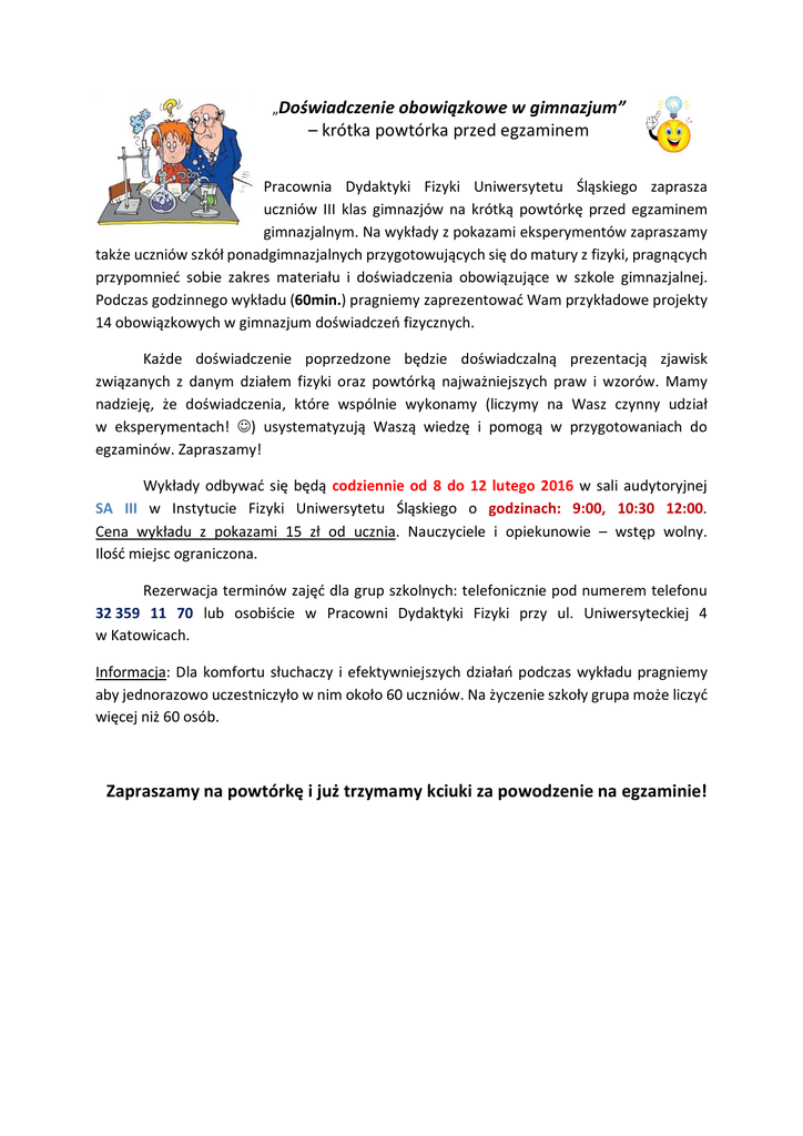 „Doświadczenie obowiązkowe w gimnazjum” – krótka powtórka przed egzaminem Pracownia Dydaktyki Fizyki Uniwersytetu Śląskiego zaprasza uczniów III klas gimnazjów na krótką powtórkę przed egzaminem gimnazjalnym. Na wykłady z pokazami eksperymentów zapraszamy także uczniów szkół ponadgimnazjalnych przygotowujących się do matury z fizyki, pragnących przypomnieć sobie zakres materiału i doświadczenia obowiązujące w szkole gimnazjalnej. Podczas godzinnego wykładu (60min.) pragniemy zaprezentować Wam przykładowe projekty 14 obowiązkowych w gimnazjum doświadczeń fizycznych. Każde doświadczenie poprzedzone będzie doświadczalną prezentacją zjawisk związanych z danym działem fizyki oraz powtórką najważniejszych praw i wzorów. Mamy nadzieję, że doświadczenia, które wspólnie wykonamy (liczymy na Wasz czynny udział w eksperymentach! ) usystematyzują Waszą wiedzę i pomogą w przygotowaniach do egzaminów. Zapraszamy! Wykłady odbywać się będą codziennie od 8 do 12 lutego 2016 w sali audytoryjnej SA III w Instytucie Fizyki Uniwersytetu Śląskiego o godzinach: 9:00, 10:30 12:00. Cena wykładu z pokazami 15 zł od ucznia. Nauczyciele i opiekunowie – wstęp wolny. Ilość miejsc ograniczona. Rezerwacja terminów zajęć dla grup szkolnych: telefonicznie pod numerem telefonu 32 359 11 70 lub osobiście w Pracowni Dydaktyki Fizyki przy ul. Uniwersyteckiej 4 w Katowicach. Informacja: Dla komfortu słuchaczy i efektywniejszych działań podczas wykładu pragniemy aby jednorazowo uczestniczyło w nim około 60 uczniów. Na życzenie szkoły grupa może liczyć więcej niż 60 osób. Zapraszamy na powtórkę i już trzymamy kciuki za powodzenie na egzaminie! Uczniów szkół gimnazjalnych i ponadgimnazjalnych zapraszamy na zajęcia laboratoryjne! Podczas zajęć laboratoryjnych samodzielnie wykonać możecie jedno lub kilka spośród doświadczeń obowiązkowych w szkole gimnazjalnej jak i ponadgimnazjalnej. Na podstawie otrzymanej instrukcji (karty pracy), wykorzystując zaproponowane, przygotowane zestawy przyrządów możecie wykonać pomiary konkretnych wielkości fizycznych, następnie wykonać analizę otrzymanych pomiarów i wyciągnąć właściwe wnioski wynikające z otrzymanych danych. Swoje obserwacje i wnioski z wykonanych pomiarów, pod koniec zajęć możecie także zaprezentować kolegom z klasy. Zajęcia odbywają się w Pracowni Dydaktyki Fizyki, Instytucie Fizyki przy ul. Uniwersyteckiej 4 w Katowicach. Termin, godzinę oraz czas trwania zajęć oraz ich szczegóły można uzgodnić telefonicznie pod numerem 32 359 1170 lub osobiście w Pracowni Dydaktyki Fizyki. Zajęcia prowadzone są dla grup nie większych niż 15 osób! Koszt zajęć laboratoryjnych to 20 zł od osoby za godzinę lekcyjną (45min.)