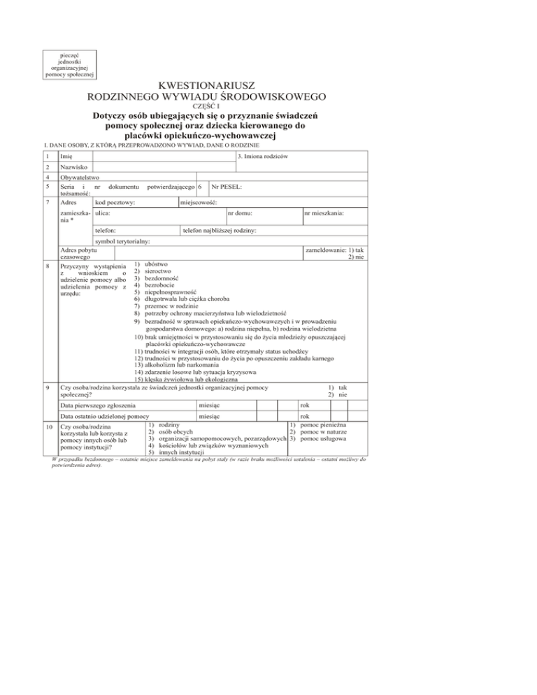 pieczęć jednostki organizacyjnej pomocy społecznej KWESTIONARIUSZ RODZINNEGO WYWIADU ŚRODOWISKOWEGO CZĘŚĆ I Dotyczy osób ubiegających się o przyznanie świadczeń pomocy społecznej oraz dziecka kierowanego do placówki opiekuńczowychowawczej I. DANE OSOBY, Z KTÓRĄ PRZEPROWADZONO WYWIAD, DANE O RODZINIE 1 Imię 3. Imiona rodziców 2 Nazwisko 4 Obywatelstwo Seria i nr dokumentu potwierdzającego 6 Nr PESEL: tożsamość: Adres kod pocztowy: miejscowość: 5 7 zamieszka ulica: nr domu: nr mieszkania: nia * telefon: telefon najbliższej rodziny: symbol terytorialny: Adres pobytu zameldowanie: 1) tak czasowego 2) nie Przyczyny wystąpienia 1) ubóstwo z wnioskiem o 2) sieroctwo udzielenie pomocy albo 3) bezdomność udzielenia pomocy z 4) bezrobocie 5) niepełnosprawność urzędu: 6) długotrwała lub ciężka choroba 7) przemoc w rodzinie 8) potrzeby ochrony macierzyństwa lub wielodzietność 9) bezradność w sprawach opiekuńczowychowawczych i w prowadzeniu gospodarstwa domowego: a) rodzina niepełna, b) rodzina wielodzietna 10) brak umiejętności w przystosowaniu się do życia młodzieży opuszczającej placówki opiekuńczowychowawcze 11) trudności w integracji osób, które otrzymały status uchodźcy 12) trudności w przystosowaniu do życia po opuszczeniu zakładu karnego 13) alkoholizm lub narkomania 14) zdarzenie losowe lub sytuacja kryzysowa 15) klęska żywiołowa lub ekologiczna 1) tak Czy osoba/rodzina korzystała ze świadczeń jednostki organizacyjnej pomocy społecznej? 2) nie 8 9 Data pierwszego zgłoszenia 10 miesiąc rok Data ostatnio udzielonej pomocy miesiąc rok 1) rodziny 1) pomoc pienieżna Czy osoba/rodzina 2) osób obcych 2) pomoc w naturze korzystała lub korzysta z 3) organizacji samopomocowych, pozarządowych 3) pomoc usługowa pomocy innych osób lub 4) kościołów lub związków wyznaniowych pomocy instytucji? 5) innych instytucji W przypadku bezdomnego – ostatnie miejsce zameldowania na pobyt stały (w razie braku możliwości ustalenia – ostatni możliwy do potwierdzenia adres). 11. Informacje o członkach rodziny 1 2 3 4 5 6 Lp. Imię i nazwisko Data urodzenia Płeć Stan cywilny Stopień pokrewieństwa dzień mc rok 1* 2 3 4 5 6 7 8 9 10 11 12 13 14 * Należy wpisać dane osoby, z którą przeprowadzono wywiad. Uwaga: 1. Oddzielne gospodarstwa domowe należy odznaczyć poziomą kreską. 2. W przypadku większej liczby osób w rodzinie niż 14 należy dołączyć dodatkową str. 2 i 3. 7 8 9 10 11 12 Lp. 1 2 3 4 5 6 7 8 9 10 11 12 13 14 Wykształcenie, wykonywany zawód Miejsce pracy lub nauki (szkoła, przedszkole) Pozycja na rynku pracy Sytuacja zdrowotna Źródło dochodu (utrzymania) rodzaj wysokość 12 Imię i nazwisko, stopień pokrewieństwa oraz adresy osób, o których mowa w art. 103 ustawy o pomocy społecznej, wielkość i forma świadczonej lub deklarowanej pomocy: 13 Łączny dochód w rodzinie (zgodnie z art. 8 ustawy o pomocy społecznej) 14 Stałe miesięczne wydatki osoby/rodziny łącznie: zł w tym: czynsz zł energia elektryczna zł gaz zł alimenty zł opłaty za dom pomocy społecznej zł opłaty za szkołę/bursę/internat zł opłaty za przedszkole zł opłaty rodziców/opiekunów prawnych za pobyt dziecka w placówce opiekuńczowychowawczej zł opłaty rodziców za pobyt dziecka w rodzinie zastępczej zł wydatki na leki i leczenie zł inne – jakie? zł 15 Alimenty świadczone przez osobę, z którą przeprowadzany jest wywiad, lub innych członków rodziny: Kto? Na czyją rzecz? Wysokość Wysokość zaległych alimentów zł 1) dobrowolne 2) na podstawie zł orzeczenia sądu II. SYTUACJA MIESZKANIOWA OSOBY/RODZINY 1 Główny lokator lub właściciel mieszkania, domu /imię i nazwisko, adres/ 2 Mieszkanie: 3 Liczba izb 4. Oddzielna kuchnia: 5 Piętro 6. Winda: 7 Wyposażenie mieszkania w instalacje: Woda zimna: Woda ciepła: 1) w mieszkaniu 1) w mieszkaniu 2) poza mieszkaniem 2) poza mieszkaniem 3) poza budynkiem 3) poza budynkiem 4) brak wody 4) brak wody Łazienka: WC: 1) w mieszkaniu 1) w mieszkaniu 2) poza mieszkaniem 2) poza mieszkaniem 3) brak łazienki 3) poza budynkiem Ogrzewanie: 1) piece węglowe 2) ogrzewanie centralne 3) ogrzewanie centralne – gazowe 4) ogrzewanie elektryczne – akumulacyjne 5) brak ogrzewania Gaz: Telefon: 1) tak 1) tak 2) nie 2) nie 8 Stan utrzymania mieszkania: 9 Czy rodzina posiada podstawowe sprzęty gospodarstwa domowego?* 1) lokatorskie spółdzielcze prawo do lokalu mieszkalnego 2) własnościowe spółdzielcze prawo do lokalu mieszkalnego 3) własność lokalu/domu 4) komunalne/kwaterunkowe 5) mieszkanie wynajęte 6) mieszkanie chronione 7) prawo do domu jednorodzinnego/jego części w spółdzielni mieszkaniowej 8) hotel 9) barak 10) brak mieszkania 11) inne (jakie?) 1) tak 2) nie 1) tak 2) nie 1) czyste, zadbane 2) brudne, zaniedbane 3) zdewastowane 1) tak 2) nie Jeżeli nie, to wymienić, jakich sprzętów brakuje: 10 Liczba miejsc do spania 11 Czy mieszkanie jest dostosowane do potrzeb osoby niepełnosprawnej? 12 Czy osoba niepełnosprawna posiada osobny pokój samodzielne łóżko 1) tak 2) nie 1) tak 2) nie 1) tak 2) nie *Tj. sprzęt niezbędny danej osobie lub rodzinie do prowadzenia, w miarę możliwości, samodzielnego gospodarstwa domowego. III. SYTUACJA RODZINNA OSÓB WSPÓLNIE ZAMIESZKUJĄCYCH 1 Kto z członków rodziny i dlaczego, mimo wspólnego zamieszkiwania, prowadzi oddzielne gospodarstwo domowe? 2 Czy w rodzinie występują konflikty? 1) tak Kogo dotyczą? 2) nie 3 Przyczyny konfliktów: Czy były podejmowane próby rozwiązania konfliktów? 1) tak 2) nie Możliwości rozwiązania konfliktów: 4 Czy występują problemy opiekuńczowychowawcze z dziećmi? Jeżeli tak, to czy były lub są podejmowane próby ich rozwiązania? Jakie ? 5 Czy rodzina lub dziecko są objęci nadzorem kuratora ? 1) tak 2) nie Czy w rodzinie występuje przemoc ? 1) tak 2) nie Przeciwko komu jest skierowana ? Kto jest sprawcą przemocy ? Jakie podjęto działania ? Efekt 