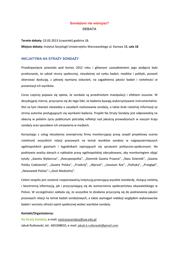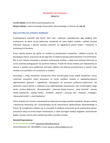 Sondażom nie wierzysz? DEBATA Termin debaty: 23.05.2013 (czwartek) godzina 18. Miejsce debaty: Instytut Socjologii Uniwersytetu Warszawskiego ul. Karowa 18, sala 18 INICJATYWA NA STRAŻY SONDAŻY Przedsięwzięcie powstało pod koniec 2012 roku i głównym uzasadnieniem jego podjęcia było przekonanie, że udział strony społecznej, niezależnej od rynku badao, mediów i polityki, pozwoli skierowad dyskusję, z jałowej wymiany oskarżeo, na zagadnienia jakości badao i rzetelności w prezentacji ich wyników. Coraz częściej pojawia się opinia, że sondaże są przedmiotem manipulacji i efektem oszustw. W decydującej mierze, przyczynia się do tego fakt, że badania bywają wykorzystywane instrumentalnie. Stoi za tym również niewiedza o zasadach realizowania sondaży, a także brak rzetelnej informacji ze strony autorów posługujących się wynikami badania. Projekt Na Straży Sondaży jest odpowiedzią na obecną w polskim życiu publicznym potrzebę refleksji nad jakością prowadzonych w naszym kraju sondaży oraz sposobem ich omawiania w mediach. Korzystając z usług niezależnej zewnętrznej firmy monitorującej prasę zespół projektowy ocenia rzetelnośd wszystkich relacji prasowych na temat wyników sondaży w najpopularniejszych ogólnopolskich gazetach i tygodnikach zajmujących się sprawami polityczno-społecznymi. Na podstawie analizy danych o nakładzie prasy ogólnopolskiej zdecydowano, aby monitoringiem objąd tytuły: „Gazeta Wyborcza”, „Rzeczpospolita”, „Dziennik Gazeta Prawna”, „Nasz Dziennik”, „Gazeta Polska Codziennie”, „Gazeta Polska”, „Przekrój”, „Wprost”, „Uważam Rze”, „Polityka”, „Przegląd”, „Newsweek Polska” i „Gośd Niedzielny”. Celem zespołu jest zostanie rozpoznawalną instytucją promującą wysokie standardy, służącą rzetelną i bezstronną informacją, jak i przyczyniającą się do wzmocnienia społeczeostwa obywatelskiego w Polsce. W szczególności zakłada się, że wszystkie te działania przyczynią się do podniesienia jakości prasowych relacji na temat badao sondażowych, a także wymagao redakcji względem wykonawców badao i wzrostu ufności opinii społecznej wobec wyników sondaży. Kontakt/Organizatorzy: Na Straży Sondaży, e-mail: [email protected] Jakub Rutkowski, tel.: 665268810, e-mail: [email protected]