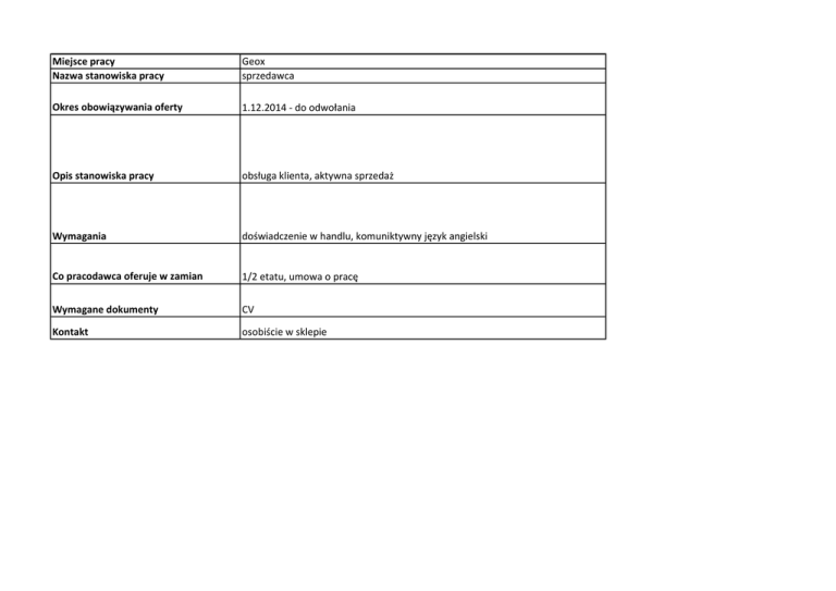 Miejsce pracy Nazwa stanowiska pracy Geox sprzedawca Okres obowiązywania oferty 1.12.2014 - do odwołania Opis stanowiska pracy obsługa klienta, aktywna sprzedaż Wymagania doświadczenie w handlu, komuniktywny język angielski Co pracodawca oferuje w zamian 1/2 etatu, umowa o pracę Wymagane dokumenty CV Kontakt osobiście w sklepie
