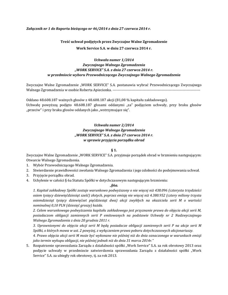 Załącznik nr 1 do Raportu bieżącego nr 46/2014 z dnia 27 czerwca 2014 r. Treść uchwał podjętych przez Zwyczajne Walne Zgromadzenie Work Service S.A. w dniu 27 czerwca 2014 r. Uchwała numer 1/2014 Zwyczajnego Walnego Zgromadzenia „WORK SERVICE” S.A. z dnia 27 czerwca 2014 r. w przedmiocie wyboru Przewodniczącego Zwyczajnego Walnego Zgromadzenia Zwyczajne Walne Zgromadzenie „WORK SERVICE” S.A. postanawia wybrać Przewodniczącego Zwyczajnego Walnego Zgromadzenia w osobie Roberta Apiecionka. ---------------------------------------------------------------------Oddano 48.608.187 ważnych głosów z 48.608.187 akcji (81,08 % kapitału zakładowego). Uchwałę powyższą podjęto 48.608.187 głosami oddanymi „za” podjęciem uchwały, przy braku głosów „przeciw” i przy braku głosów oddanych jako „wstrzymujące się”. Uchwała numer 2/2014 Zwyczajnego Walnego Zgromadzenia „WORK SERVICE” S.A. z dnia 27 czerwca 2014 r. w sprawie przyjęcia porządku obrad § 1. Zwyczajne Walne Zgromadzenie „WORK SERVICE” S.A. przyjmuje porządek obrad w brzmieniu następującym: Otwarcie Walnego Zgromadzenia. 1. Wybór Przewodniczącego Walnego Zgromadzenia. 2. Stwierdzenie prawidłowości zwołania Walnego Zgromadzenia i jego zdolności do podejmowania uchwał. 3. Przyjęcie porządku obrad. 4. Uchylenie w całości § 6a Statutu Spółki w dotychczasowym następującym brzmieniu: „§6a. 1. Kapitał zakładowy Spółki zostaje warunkowo podwyższony o nie więcej niż 438.096 (czterysta trzydzieści osiem tysięcy dziewięćdziesiąt sześć) złotych, poprzez emisję nie więcej niż 4.380.952 (cztery miliony trzysta osiemdziesiąt tysięcy dziewięćset pięćdziesiąt dwa) akcji zwykłych na okaziciela serii M o wartości nominalnej 0,10 PLN (dziesięć groszy) każda. 2. Celem warunkowego podwyższenia kapitału zakładowego jest przyznanie prawa do objęcia akcji serii M, posiadaczom obligacji zamiennych serii P emitowanych na podstawie Uchwały nr 2 Nadzwyczajnego Walnego Zgromadzenia z dnia 20 grudnia 2011 r. 3. Uprawnionymi do objęcia akcji serii M będą posiadacze obligacji zamiennych serii P na akcje serii M Spółki, o których mowa w ust. 2 powyżej, z wyłączeniem prawa poboru dotychczasowych akcjonariuszy. 4. Prawo objęcia akcji serii M może być wykonane nie później niż do dnia oznaczonego w warunkach emisji jako termin wykupu obligacji, nie później jednak niż do dnia 31 marca 2014r.” 5. Rozpatrzenie sprawozdania Zarządu z działalności spółki „Work Service” S.A. za rok obrotowy 2013 oraz podjęcie uchwały w przedmiocie zatwierdzenia sprawozdania Zarządu z działalności spółki „Work Service” S.A. za ubiegły rok obrotowy, tj. za rok 2013. 2 _____________________________________________________________________________________ ________ 6. 7. 8. 9. 10. 11. 12. 13. 14. Rozpatrzenie sprawozdania finansowego spółki „Work Service” S.A. za rok 2013 oraz podjęcie uchwały w przedmiocie zatwierdzenia sprawozdania finansowego spółki „Work Service” S.A. za ubiegły rok obrotowy, tj. za rok 2013. Podjęcie uchwały w przedmiocie podziału zysku spółki „Work Service” S.A. za 2013 rok. Rozpatrzenie sprawozdania Zarządu z działalności grupy kapitałowej Work Service za rok 2013 oraz podjęcie uchwały w przedmiocie zatwierdzenia sprawozdania Zarządu z działalności grupy kapitałowej Work Service za ubiegły rok obrotowy, tj. za rok 2013. Rozpatrzenie skonsolidowanego sprawozdania finansowego grupy kapitałowej Work Service za rok 2013 oraz podjęcie uchwały w przedmiocie zatwierdzenia skonsolidowanego sprawozdania finansowego grupy kapitałowej Work Service za ubiegły rok obrotowy, tj. za rok 2013. Podjęcie uchwał w sprawie udzielenia członkom organów spółki „Work Service” S.A. absolutorium z wykonania przez nich obowiązków w roku obrotowym 2013 roku. Podjęcie uchwały w przedmiocie zatwierdzenia sprawozdania Rady Nadzorczej Spółki za rok 2013. Podjęcie uchwał w przedmiocie powołania członków Rady Nadzorczej na nową kadencję. Podjęcie uchwały w przedmiocie ustalenia wynagrodzenia stałego dla Przewodniczącego Komitetu Audytu oraz zmiany uchwał Walnego Zgromadzenia Akcjonariuszy w przedmiocie określenia wysokości wynagrodzenia członków Rady Nadzorczej „Work Service” S.A. Podjęcie uchwały w przedmiocie podwyższenia kapitału zakładowego „Work Service” S.A. o kwotę 9.151,10 zł poprzez emisję w trybie oferty prywatnej 91.511 akcji zwykłych na okaziciela serii P z wyłączeniem w całości prawa poboru dotychczasowych akcjonariuszy, zmiany Statutu Spółki w związku z podwyższeniem kapitału zakładowego, dematerializacji akcji Spółki serii P oraz ubiegania się o dopuszczenie akcji Spółki do obrotu na rynku regulowanym prowadzonym przez Giełdę Papierów Wartościowych S.A. w Warszawie. Proponowana zmiana Statutu Spółki dotyczy nadania § 6 ust.1 nowego następującego brzmienia: „1. Kapitał zakładowy Spółki wynosi 6.003.950,70 zł (słownie: sześć milionów trzy tysiące dziewięćset pięćdziesiąt złote 70/100)i i dzieli się na: a)750.000 (słownie: siedemset pięćdziesiąt tysięcy) akcji serii A o wartości nominalnej po 10 (słownie: dziesięć) groszy każda, b)5.115.000 (słownie: pięć milionów sto piętnaście tysięcy) akcji serii B o wartości nominalnej po 10 (dziesięć) groszy każda, c)16.655.000 (szesnaście milionów sześćset pięćdziesiąt pięć tysięcy) akcji serii C o wartości nominalnej po 10 (dziesięć) groszy każda, d)100.000 (słownie: sto tysięcy) akcji serii D o wartości nominalnej po 10 (dziesięć) groszy każda, e)100.000 (słownie: sto tysięcy) akcji serii E o wartości nominalnej po 10 (dziesięć) groszy każda, f)7.406.860 (siedem milionów czterysta sześć tysięcy osiemset sześćdziesiąt) akcji serii F o wartości nominalnej po 10 (dziesięć) groszy każda, g)2.258.990 (dwa miliony dwieście pięćdzie