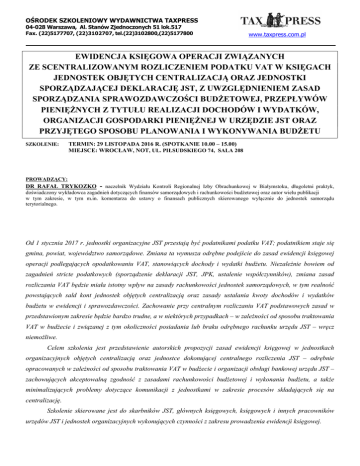 OŚRODEK SZKOLENIOWY WYDAWNICTWA TAXPRESS 04-028 Warszawa, Al. Stanów Zjednoczonych 51 lok.517 Fax. (22)5177707, (22)3102707, tel.(22)3102800,(22)5177800 www.taxpress.com.pl EWIDENCJA KSIĘGOWA OPERACJI ZWIĄZANYCH ZE SCENTRALIZOWANYM ROZLICZENIEM PODATKU VAT W KSIĘGACH JEDNOSTEK OBJĘTYCH CENTRALIZACJĄ ORAZ JEDNOSTKI SPORZĄDZAJĄCEJ DEKLARACJĘ JST, Z UWZGLĘDNIENIEM ZASAD SPORZĄDZANIA SPRAWOZDAWCZOŚCI BUDŻETOWEJ, PRZEPŁYWÓW PIENIĘŻNYCH Z TYTUŁU REALIZACJI DOCHODÓW I WYDATKÓW, ORGANIZACJI GOSPODARKI PIENIĘŻNEJ W URZĘDZIE JST ORAZ PRZYJĘTEGO SPOSOBU PLANOWANIA I WYKONYWANIA BUDŻETU SZKOLENIE: TERMIN: 29 LISTOPADA 2016 R. (SPOTKANIE 10.00 – 15.00) MIEJSCE: WROCŁAW, NOT, UL. PIŁSUDSKIEGO 74, SALA 208 PROWADZĄCY: - naczelnik Wydziału Kontroli Regionalnej Izby Obrachunkowej w Białymstoku, długoletni praktyk, doświadczony wykładowca zagadnień dotyczących finansów samorządowych i rachunkowości budżetowej oraz autor wielu publikacji w tym zakresie, w tym m.in. komentarza do ustawy o finansach publicznych skierowanego wyłącznie do jednostek samorządu terytorialnego. DR RAFAŁ TRYKOZKO Od 1 stycznia 2017 r. jednostki organizacyjne JST przestają być podatnikami podatku VAT; podatnikiem staje się gmina, powiat, województwo samorządowe. Zmiana ta wymusza odrębne podejście do zasad ewidencji księgowej operacji podlegających opodatkowaniu VAT, stanowiących dochody i wydatki budżetu. Niezależnie bowiem od zagadnień stricte podatkowych (sporządzenie deklaracji JST, JPK, ustalenie współczynników), zmiana zasad rozliczania VAT będzie miała istotny wpływ na zasady rachunkowości jednostek samorządowych, w tym realność powstających sald kont jednostek objętych centralizacją oraz zasady ustalania kwoty dochodów i wydatków budżetu w ewidencji i sprawozdawczości. Zachowanie przy centralnym rozliczaniu VAT podstawowych zasad w przedstawionym zakresie będzie bardzo trudne, a w niektórych przypadkach – w zależności od sposobu traktowania VAT w budżecie i związanej z tym okoliczności posiadania lub braku odrębnego rachunku urzędu JST – wręcz niemożliwe. Celem szkolenia jest przedstawienie autorskich propozycji zasad ewidencji księgowej w jednostkach organizacyjnych objętych centralizacją oraz jednostce dokonującej centralnego rozliczenia JST – odrębnie opracowanych w zależności od sposobu traktowania VAT w budżecie i organizacji obsługi bankowej urzędu JST – zachowujących akceptowalną zgodność z zasadami rachunkowości budżetowej i wykonania budżetu, a także minimalizujących problemy dotyczące komunikacji z jednostkami w zakresie procesów składających się na centralizację. Szkolenie skierowane jest do skarbników JST, głównych księgowych, księgowych i innych pracowników urzędów JST i jednostek organizacyjnych wykonujących czynności z zakresu prowadzenia ewidencji księgowej. OŚRODEK SZKOLENIOWY WYDAWNICTWA TAXPRESS 04-028 Warszawa, Al. Stanów Zjednoczonych 51 lok.517 Fax. (22)5177707, (22)3102707, tel.(22)3102800,(22)5177800 www.taxpress.com.pl PROGRAM SZKOLENIA: 1. Obowiązki dotyczące zachowania odrębności jednostek objętych centralnym rozliczeniem VAT w zakresie wymaganym ustawą o finansach publicznych i ustawą o rachunkowości. 2. Trzy sposoby traktowania podatku VAT w budżecie i wynikające stąd konsekwencje dla postanowień obowiązującego budżetu, jako wyznacznik możliwości wyboru właściwej metody ewidencji dotyczące scentralizowanego rozliczenia VAT. Praktyczne wady i zalety każdej z nich. 3. Przyjęty sposób sporządzania deklaracji JST jako rozwiązanie mające wpływ na zasady ewidencji 4. Znaczenie liczby jednostek objętych centralizacją w danej JST dla optymalnego wyboru metody ewidencji. 5. Przedstawienie proponowanych zasad ewidencji operacji, odrębnych dla każdej z trzech metod traktowania podatku VAT w budżecie, w formie prezentacji księgowań zachodzących operacji, wskazania dowodów księgowych je dokumentujących, objaśnienia znaczenia sald oraz warunków zachowania realności sald w jednostkach objętych centralizacją. Ponadto dla każdej z metod: przedstawienie rozwiązań alternatywnych dla sytuacji posiadania lub nieposiadania odrębnego rachunku dochodów i wydatków urzędu JST, ocena zasadności otwierania odrębnych rachunków dla rozliczeń VAT, omówienie zasad funkcjonowania nowych kont, niezbędnych do zaksięgowania operacji związanych z centralnym rozliczeniem, wskazanie wpływu metody na zasady sporządzania sprawozdań Rb-27S i Rb-28S, zasady stosowania klasyfikacji budżetowej, sposoby usuwania nierealnych sald (niemających treści ekonomicznej), których powstanie jest nieuniknione przy ewidencji centralnego rozliczenia VAT, przedstawienie zasad przepływu informacji niezbędnych dla dokonania rozliczenia i przepływu środków pieniężnych między jednostkami, przedstawienie „zasad” charakteryzujących ewidencję każdą z metod. 6. Uwagi dotyczące zakładu budżetowego jako objętego centralnym rozliczeniem VAT UWAGA! Jako materiały szkoleniowe uczestnicy otrzymają wzory księgowań z poszczególnymi metodami, opatrzone komentarzem. OŚRODEK SZKOLENIOWY WYDAWNICTWA TAXPRESS 04-028 Warszawa, Al. Stanów Zjednoczonych 51 lok.517 Fax. (22)5177707, (22)3102707, tel.(22)3102800,(22)5177800 www.taxpress.com.pl UWAGA!!! JEDYNIE U NAS PYTANIA MOŻNA ZGŁASZAĆ TAKŻE WCZEŚNIEJ, PRZYNAJMNIEJ 5 DNI PRZED SZKOLENIEM NA ADRES MAILOWY – [email protected] KOSZT: 389 zł* (bez lunchu: 374 zł*) (cena szkolenia obejmuje: materiały szkoleniowe, zaświadczenia, przerwę kawową, lunch) KOSZT DLA PRENUMERATORÓW „Przeglądu Podatków Lokalnych...”: 350 zł*, (bez lunchu: 335 zł*) KOSZT DLA PRENUMERATORÓW „Prawa Finansów Publicznych” oraz „Przeglądu Podatków Lokalnych …”: 331 zł*, (bez lunchu: 316 zł* ) (* Cena dotyczy szkoleń finansowanych ze środków publicznych, dla szkoleń finansowanych z innych źródeł na