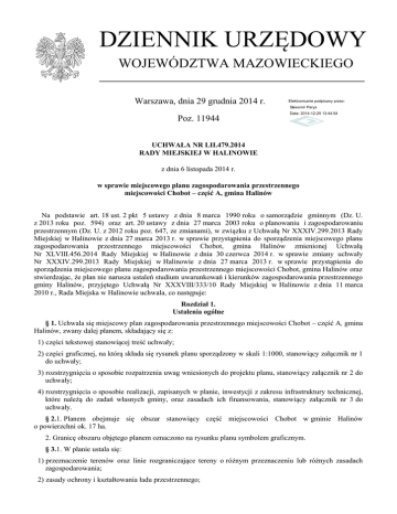 DZIENNIK URZĘDOWY WOJEWÓDZTWA MAZOWIECKIEGO Warszawa, dnia 29 grudnia 2014 r. Elektronicznie podpisany przez: Sławomir Parys Poz. 11944 Data: 2014-12-29 13:44:54 UCHWAŁA NR LII.479.2014 RADY MIEJSKIEJ W HALINOWIE z dnia 6 listopada 2014 r. w sprawie miejscowego planu zagospodarowania przestrzennego miejscowości Chobot – część A, gmina Halinów Na podstawie art. 18 ust. 2 pkt 5 ustawy z dnia 8 marca 1990 roku o samorządzie gminnym (Dz. U. z 2013 roku poz. 594) oraz art. 20 ustawy z dnia 27 marca 2003 roku o planowaniu i zagospodarowaniu przestrzennym (Dz. U. z 2012 roku poz. 647, ze zmianami), w związku z Uchwałą Nr XXXIV.299.2013 Rady Miejskiej w Halinowie z dnia 27 marca 2013 r. w sprawie przystąpienia do sporządzenia miejscowego planu zagospodarowania przestrzennego miejscowości Chobot, gmina Halinów zmienionej Uchwałą Nr XLVIII.456.2014 Rady Miejskiej w Halinowie z dnia 30 czerwca 2014 r. w sprawie zmiany uchwały Nr XXXIV.299.2013 Rady Miejskiej w Halinowie z dnia 27 marca 2013 r. w sprawie przystąpienia do sporządzenia miejscowego planu zagospodarowania przestrzennego miejscowości Chobot, gmina Halinów oraz stwierdzając, że plan nie narusza ustaleń studium uwarunkowań i kierunków zagospodarowania przestrzennego gminy Halinów, przyjętego Uchwałą Nr XXXVIII/333/10 Rady Miejskiej w Halinowie z dnia 11 marca 2010 r., Rada Miejska w Halinowie uchwala, co następuje: Rozdział 1. Ustalenia ogólne § 1. Uchwala się miejscowy plan zagospodarowania przestrzennego miejscowości Chobot – część A, gmina Halinów, zwany dalej planem, składający się z: 1) części tekstowej stanowiącej treść uchwały; 2) części graficznej, na którą składa się rysunek planu sporządzony w skali 1:1000, stanowiący załącznik nr 1 do uchwały; 3) rozstrzygnięcia o sposobie rozpatrzenia uwag wniesionych do projektu planu, stanowiący załącznik nr 2 do uchwały; 4) rozstrzygnięcia o sposobie realizacji, zapisanych w planie, inwestycji z zakresu infrastruktury technicznej, które należą do zadań własnych gminy, oraz zasadach ich finansowania, stanowiący załącznik nr 3 do uchwały. § 2.1. Planem obejmuje się obszar stanowiący część miejscowości Chobot w gminie Halinów o powierzchni ok. 17 ha. 2. Granicę obszaru objętego planem oznaczono na rysunku planu symbolem graficznym. § 3.1. W planie ustala się: 1) przeznaczenie terenów oraz linie rozgraniczające tereny o różnym przeznaczeniu lub różnych zasadach zagospodarowania; 2) zasady ochrony i kształtowania ładu przestrzennego; Dziennik Urzędowy Województwa Mazowieckiego –2– Poz. 11944 3) zasady kształtowania zabudowy; 4) granice i sposoby zagospodarowania terenów lub obiektów podlegających ochronie, ustalonych na podstawie odrębnych przepisów; 5) szczególne warunki zagospodarowania terenów oraz ograniczenia w ich użytkowaniu; 6) zasady modernizacji, rozbudowy i budowy systemów infrastruktury technicznej; 7) granice terenów inwestycji celu publicznego o znaczeniu ponadlokalnym, umieszczonych w planie zagospodarowania przestrzennego województwa. 2. Z powodu braku okoliczności faktycznie uzasadniających dokonanie takich ustaleń, w planie nie ustala się: 1) zasad ochrony środowiska, przyrody i krajobrazu kulturowego; 2) zasad ochrony dziedzictwa kulturowego i zabytków oraz dóbr kultury współczesnej; 3) wymagań wynikających z potrzeb kształtowania przestrzeni publicznych; 4) wskaźników zagospodarowania terenu, maksymalnej i minimalnej intensywności zabudowy jako wskaźnika powierzchni całkowitej zabudowy w odniesieniu do powierzchni działki budowlanej, minimalnego udziału procentowego powierzchni biologicznie czynnej w odniesieniu do powierzchni działki budowlanej, maksymalnej wysokości zabudowy, minimalnej liczby miejsc do parkowania i sposobu ich realizacji oraz linii zabudowy i gabarytów obiektów; 5) granic i sposobów zagospodarowania terenów górniczych, a także obszarów szczególnego zagrożenia powodzią oraz obszarów usuwania się mas ziemnych; 6) szczegółowych zasad i warunków scalania i podziału nieruchomości objętych planem miejscowym; 7) sposobu i terminu tymczasowego zagospodarowania, urządzania i użytkowania terenów. § 4.1. Ilekroć w uchwale jest mowa o: 1) pasie technologicznym napowietrznej linii elektroenergetycznej o napięciu 400 kV – należy przez to rozumieć obszar, którego oś symetrii wyznacza trasa napowietrznej linii elektroenergetycznej, przeznaczony do budowy, konserwacji i eksploatacji tej linii i urządzeń infrastruktury technicznej o szerokości 80 metrów (po 40 metrów w obie strony od osi linii); 2) przeznaczeniu dopuszczalnym – należy przez to rozumieć przeznaczenie inne niż podstawowe, dopuszczone na warunkach określonych planem; 3) przeznaczeniu podstawowym – należy przez to rozumieć ustalone w planie przeznaczenie dominujące na danym terenie. 2. Pojęcia niewymienione w ust. 1 należy rozumieć zgodnie z definicjami zawartymi w przepisach odrębnych lub zgodnie z ich powszechnie przyjętym znaczeniem. § 5.1. Następujące oznaczenia graficzne na rysunku planu są ustaleniami planu: 1) granica obszaru objętego planem; 2) linia rozgraniczająca tereny o różnym przeznaczeniu lub różnych zasadach zagospodarowania; 3) przeznaczenie terenów – określone za pomocą symboli liczbowych i literowych; 4) oś linii elektroenergetycznej 400 kV; 5) pas technologiczny od linii elektroenergetycznej 400 kV. 2. Oznaczenia graficzne występujące na rysunku planu, niewymienione w ust. 1, w tym wynikające z przepisów odrębnych, mają wyłącznie charakter informacyjny. § 6. Ustala się podstawowe przeznaczenie terenów wyznaczonych liniami rozgraniczającymi i oznaczonych symbolem literowym, zgodnie z rysunkiem planu: 1) R – tereny rolnicze; 2) WSr – tereny wód powierzchniowych – rowy. Dziennik Urzędowy Województwa Mazowieckiego –3– Poz. 11944 Rozdział 2. Ustalenia dla całego obsz