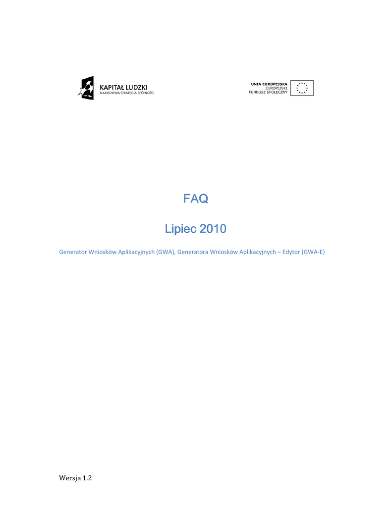 FAQ Lipiec 2010 Generator Wniosków Aplikacyjnych (GWA), Generatora Wniosków Aplikacyjnych – Edytor (GWA-E) Wersja 1.2 FAQ Lipiec 2010 Historia dokumentu: Wersja Data ostatniej modyfikacji 1.0 26.04.2010 r. 1.1 24.05.2010 r. 1.2 24.07.2010 r. 2|Strona FAQ Lipiec 2010 Pytania i odpowiedzi do generatorów wniosków: 1. [GWA] Jakie przeglądarki obsługują prawidłowe wyświetlanie strony generatora wniosków aplikacyjnych? Odpowiedź: Generator wniosków w wersji online jest obsługiwany przez popularne przeglądarki internetowe, takie jak Mozilla Firefox od wersji 2.0 i Internet Explorer od wersji 6.0. 2. [GWA] Pojawił się komunikat, że sesja wkrótce wygaśnie. Co to znaczy? Odpowiedź: Czas sesji to czas, w którym wszystkie zmiany są zapamiętywane i w razie utraty łączności, możliwe jest przywrócenie wpisanych danych, po naciśnięciu przycisku „odśwież” w przeglądarce. Jeżeli nie są zmieniane żadne dane, to sesja wygasa po 60min, po tym czasie, należy ponownie wczytać plik wniosku w celu dalszej edycji, lub ponownie wprowadzić dane projektu. 3. [GWA] W części CHARAKTERYSTYKA PROJEKTU jest wyświetlona informacja o ilości znaków, które można wpisać. Czego ona dotyczy? Odpowiedź: Ilość znaków jest zależna od wybranego działania w części Informacje o projekcie -> Nr i nazwa działania. Ilość znaków jest sumowana z pól 3.1; 3.2; 3.3; 3.4; 3.5. Jako znaki liczone są także spacje oraz znaki zakończenia linii. 4. [GWA] Czy możliwa jest zmiana nazwy pliku XML i PDF? Czy wpływa to na treść wniosku i sumę kontrolną? Odpowiedź: Nazwę pliku wniosku można zmieniać bez ograniczeń. Nie ma ona wpływu na sumę kontrolną wniosku. 5. [GWA] Czy możliwa jest edycja wniosku, tak, aby suma kontrolna nie została zmieniona? Odpowiedź: Każda edycja wniosku skutkuje zmianą unikatowego numeru sumy kontrolnej. Nie jest możliwa edycja wniosku bez zmiany unikatowego numeru. 6. [GWA] Mam wniosek utworzony w wersji 2.1 Generatora. Nie mogę go załadować do wersji GWA online, dlaczego? Odpowiedź: Nie jest możliwe zaimportowanie wniosku utworzonego w wersji 2.1 Generatora. Wersja ta nie jest obecnie wspierana. Konieczne jest ręczne przepisanie wniosku do GWA. Możliwe jest otwarcie wniosku w dowolnym edytorze tekstu i wyszukanie a następnie skopiowanie koniecznych informacji. 3|Strona FAQ Lipiec 2010 7. [GWA] Edytowałem wniosek i generator online przestał działać, pojawia się błąd „Server Error In ‘/Gwa53’ Application”. Czy możliwe jest odzyskanie danych, które wpisałem do czasu awarii? Odpowiedź: Dla każdego użytkownika, który łączy się z GWA, tworzona jest odrębna sesja generatora, po stronie serwera i nadawany jest unikatowy odnośnik np.: http://www.generatorwnioskow.efs.gov.pl/GWA53/(S(zlbwbozj3nosr3n5votohcm0_093))/d efault.aspx Zaznaczony fragment odnośnika, to unikatowy numer sesji. W przypadku awarii aplikacji, numer ten jest przechowywany przez godzinę. Jeżeli w tym czasie GWA zostanie naprawiony to możliwy jest powrót do wcześniej rozpoczętej edycji. Jako że naprawa tego typu awarii następuje najczęściej w trybie natychmiastowym, wystarczy zapamiętać lub zapisać cały adres wyświetlany w przeglądarce. Po naprawie generatora, przejść do niego i kontynuować edycję wniosku 8. [GWA] Wypełniłem wniosek, weryfikacja nie wykazała błędów, zapisałem plik xml oraz pobrałem plik PDF. Przy próbie otwarcia pliku PDF, w Adobe Readerze pojawia się komunikat błędu „Niepoprawny format pliku lub plik uszkorzony”. Przy próbie otwarcia pliku w innej przeglądarce (PDF Exchange Viever) pojawia się komunikat „Not valid Cross Reference table[…]” Odpowiedź: Problem jest spowodowany ustawieniami firewall po stronie beneficjenta. Podczas pobierania PDF, plik jest uszkadzany. Proszę skontaktować się z administratorem sieci, w celu ustawienia na firewall, zezwolenia na domenę http://www.generatorwnioskow.efs.gov.pl/. 9. [GWA, GWA-E] Mam zainstalowany generator wniosków offline w wersji 4.3.4. Nie mogę do niego wczytać wniosku, który był edytowany w generatorze online. Odpowiedź: Wnioski utworzone w generatorach offline, można wczytać do generatora online, są one wtedy automatycznie konwertowane do wersji 5.3. Zapisany wniosek z GWA online, nie jest możliwy do wczytania do generatora offline, który aktualnie istnieje tylko w wersji wcześniejszej. 10. [GWA-E] Czy jest możliwe pobranie wersji generatora offline, takiej samej jak generator online (wersja 5.3)? Odpowiedź: Jest obecnie dostępna wersja generatora offline która jest zgodna z wersją 5.3 generatora online. Można ją pobrać z adresu http://www.efs.gov.pl/generatory_wnioskow/Strony/generator_aplikacyjny.aspx 11. [GWA-E] Nie mogę uruchomić generatora wniosków zainstalowanego na moim komputerze. Po kliknięciu odnośnika, otwiera się okno przeglądarki i pojawia się błąd aplikacji. Dlaczego? 4|Strona FAQ Lipiec 2010 Odpowiedź: Instalacja oraz pierwsze uruchomienie musi być przeprowadzone w trybie administracyjnym dla Windows Vista i 7. Dla systemu Windows XP instalację musi przeprowadzić użytkownik, który należy do grupy administratorów komputera, na którym jest instalowany Generator. 12. [GWA-E, GWP] Czy istnieje wersja instalacyjna generatora dla systemów innych niż Microsoft Windows? Odpowiedź: w chwili obecnej nie istnieje możliwość bezpośredniego zainstalowania GWA-E oraz GWP w systemach innych niż MS Windows. 5|Strona