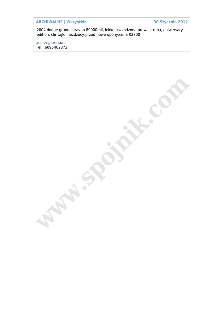 ARCHIWALNE | Wszystkie 30 Stycznia 2012 2004 dodge grand caravan 89000mil, lekko uszkodzona prawa strona, aniwersary edition, clir tajlo , jezdzocy,przod nowe opony,cena $2700 w w w .s po jn ik .c o m andrzej, trenton Tel.: 6095402372