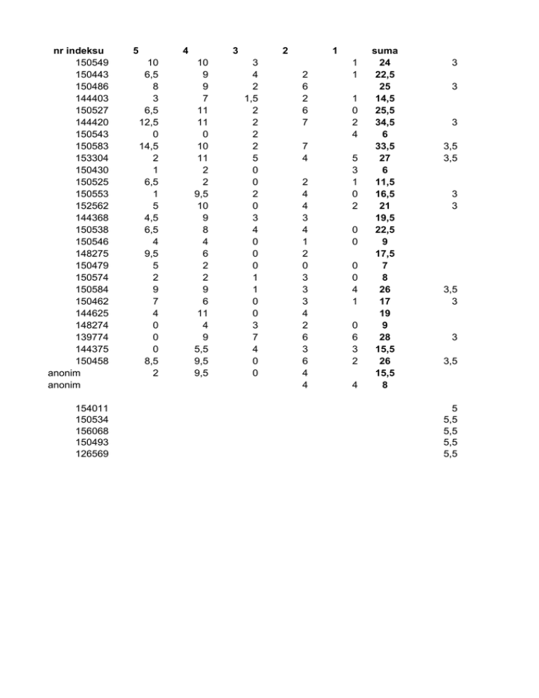 nr indeksu 5 4 3 2 1 suma 150549 10 10 3 1 24 3 150443 6,5 9 4 2 1