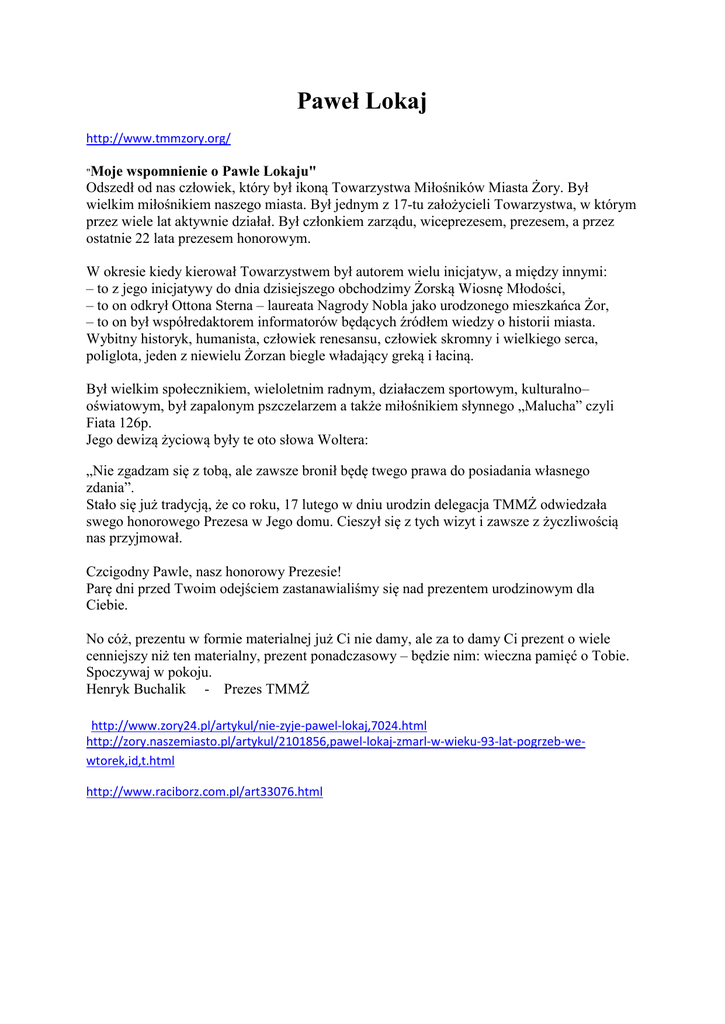 Paweł Lokaj http://www.tmmzory.org/ "Moje wspomnienie o Pawle Lokaju" Odszedł od nas człowiek, który był ikoną Towarzystwa Miłośników Miasta Żory. Był wielkim miłośnikiem naszego miasta. Był jednym z 17-tu założycieli Towarzystwa, w którym przez wiele lat aktywnie działał. Był członkiem zarządu, wiceprezesem, prezesem, a przez ostatnie 22 lata prezesem honorowym. W okresie kiedy kierował Towarzystwem był autorem wielu inicjatyw, a między innymi: – to z jego inicjatywy do dnia dzisiejszego obchodzimy Żorską Wiosnę Młodości, – to on odkrył Ottona Sterna – laureata Nagrody Nobla jako urodzonego mieszkańca Żor, – to on był współredaktorem informatorów będących źródłem wiedzy o historii miasta. Wybitny historyk, humanista, człowiek renesansu, człowiek skromny i wielkiego serca, poliglota, jeden z niewielu Żorzan biegle władający greką i łaciną. Był wielkim społecznikiem, wieloletnim radnym, działaczem sportowym, kulturalno– oświatowym, był zapalonym pszczelarzem a także miłośnikiem słynnego „Malucha” czyli Fiata 126p. Jego dewizą życiową były te oto słowa Woltera: „Nie zgadzam się z tobą, ale zawsze bronił będę twego prawa do posiadania własnego zdania”. Stało się już tradycją, że co roku, 17 lutego w dniu urodzin delegacja TMMŻ odwiedzała swego honorowego Prezesa w Jego domu. Cieszył się z tych wizyt i zawsze z życzliwością nas przyjmował. Czcigodny Pawle, nasz honorowy Prezesie! Parę dni przed Twoim odejściem zastanawialiśmy się nad prezentem urodzinowym dla Ciebie. No cóż, prezentu w formie materialnej już Ci nie damy, ale za to damy Ci prezent o wiele cenniejszy niż ten materialny, prezent ponadczasowy – będzie nim: wieczna pamięć o Tobie. Spoczywaj w pokoju. Henryk Buchalik - Prezes TMMŻ http://www.zory24.pl/artykul/nie-zyje-pawel-lokaj,7024.html http://zory.naszemiasto.pl/artykul/2101856,pawel-lokaj-zmarl-w-wieku-93-lat-pogrzeb-wewtorek,id,t.html http://www.raciborz.com.pl/art33076.html