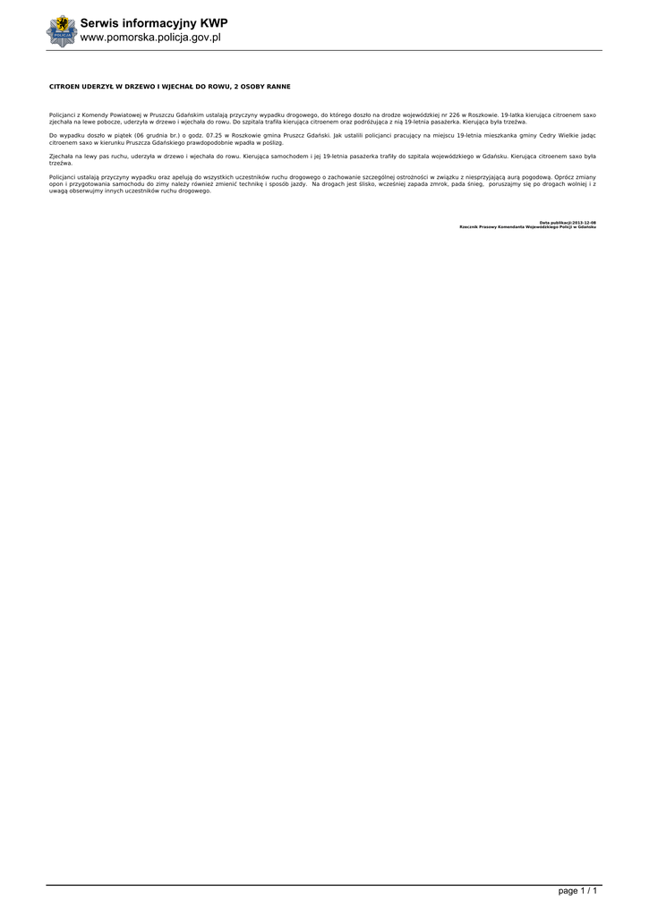 Serwis informacyjny KWP www.pomorska.policja.gov.pl CITROEN UDERZYŁ W DRZEWO I WJECHAŁ DO ROWU, 2 OSOBY RANNE Policjanci z Komendy Powiatowej w Pruszczu Gdańskim ustalają przyczyny wypadku drogowego, do którego doszło na drodze wojewódzkiej nr 226 w Roszkowie. 19-latka kierująca citroenem saxo zjechała na lewe pobocze, uderzyła w drzewo i wjechała do rowu. Do szpitala trafiła kierująca citroenem oraz podróżująca z nią 19-letnia pasażerka. Kierująca była trzeźwa. Do wypadku doszło w piątek (06 grudnia br.) o godz. 07.25 w Roszkowie gmina Pruszcz Gdański. Jak ustalili policjanci pracujący na miejscu 19-letnia mieszkanka gminy Cedry Wielkie jadąc citroenem saxo w kierunku Pruszcza Gdańskiego prawdopodobnie wpadła w poślizg. Zjechała na lewy pas ruchu, uderzyła w drzewo i wjechała do rowu. Kierująca samochodem i jej 19-letnia pasażerka trafiły do szpitala wojewódzkiego w Gdańsku. Kierująca citroenem saxo była trzeźwa. Policjanci ustalają przyczyny wypadku oraz apelują do wszystkich uczestników ruchu drogowego o zachowanie szczególnej ostrożności w związku z niesprzyjającą aurą pogodową. Oprócz zmiany opon i przygotowania samochodu do zimy należy również zmienić technikę i sposób jazdy. Na drogach jest ślisko, wcześniej zapada zmrok, pada śnieg, poruszajmy się po drogach wolniej i z uwagą obserwujmy innych uczestników ruchu drogowego. Data publikacji:2013-12-08 Rzecznik Prasowy Komendanta Wojewódzkiego Policji w Gdańsku page 1 / 1 Powered by TCPDF (www.tcpdf.org)