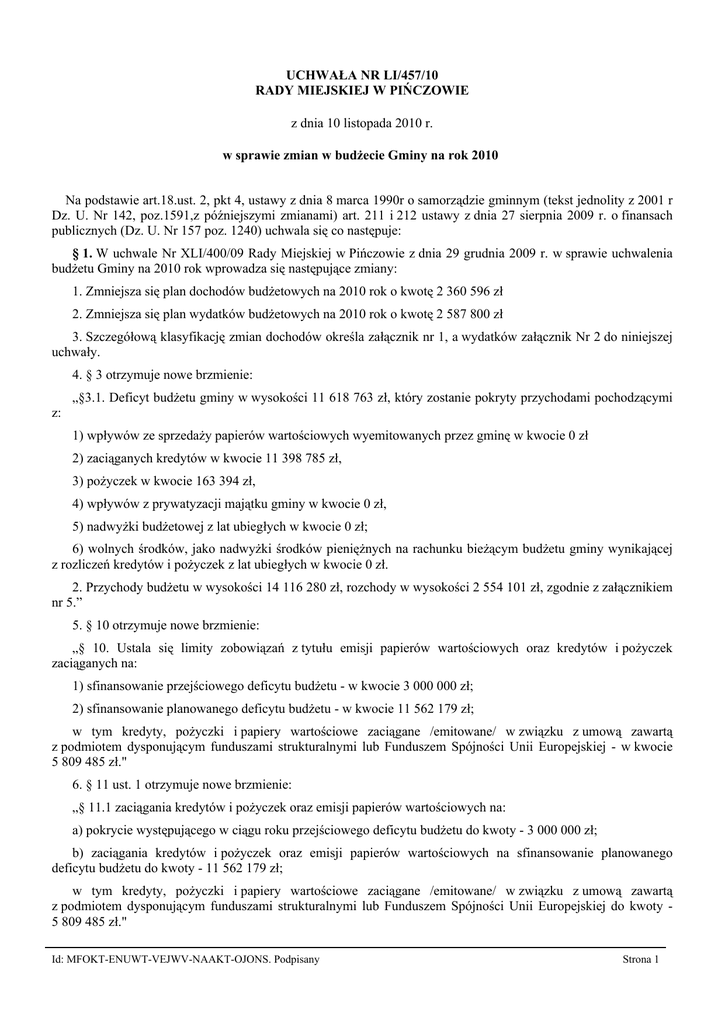UCHWAŁA NR LI/457/10 RADY MIEJSKIEJ W PIŃCZOWIE z dnia 10 listopada 2010 r. w sprawie zmian w budżecie Gminy na rok 2010 Na podstawie art.18.ust. 2, pkt 4, ustawy z dnia 8 marca 1990r o samorządzie gminnym (tekst jednolity z 2001 r Dz. U. Nr 142, poz.1591,z późniejszymi zmianami) art. 211 i 212 ustawy z dnia 27 sierpnia 2009 r. o finansach publicznych (Dz. U. Nr 157 poz. 1240) uchwala się co następuje: § 1. W uchwale Nr XLI/400/09 Rady Miejskiej w Pińczowie z dnia 29 grudnia 2009 r. w sprawie uchwalenia budżetu Gminy na 2010 rok wprowadza się następujące zmiany: 1. Zmniejsza się plan dochodów budżetowych na 2010 rok o kwotę 2 360 596 zł 2. Zmniejsza się plan wydatków budżetowych na 2010 rok o kwotę 2 587 800 zł 3. Szczegółową klasyfikację zmian dochodów określa załącznik nr 1, a wydatków załącznik Nr 2 do niniejszej uchwały. 4. § 3 otrzymuje nowe brzmienie: „§3.1. Deficyt budżetu gminy w wysokości 11 618 763 zł, który zostanie pokryty przychodami pochodzącymi z: 1) wpływów ze sprzedaży papierów wartościowych wyemitowanych przez gminę w kwocie 0 zł 2) zaciąganych kredytów w kwocie 11 398 785 zł, 3) pożyczek w kwocie 163 394 zł, 4) wpływów z prywatyzacji majątku gminy w kwocie 0 zł, 5) nadwyżki budżetowej z lat ubiegłych w kwocie 0 zł; 6) wolnych środków, jako nadwyżki środków pieniężnych na rachunku bieżącym budżetu gminy wynikającej z rozliczeń kredytów i pożyczek z lat ubiegłych w kwocie 0 zł. 2. Przychody budżetu w wysokości 14 116 280 zł, rozchody w wysokości 2 554 101 zł, zgodnie z załącznikiem nr 5.” 5. § 10 otrzymuje nowe brzmienie: „§ 10. Ustala się limity zobowiązań z tytułu emisji papierów wartościowych oraz kredytów i pożyczek zaciąganych na: 1) sfinansowanie przejściowego deficytu budżetu - w kwocie 3 000 000 zł; 2) sfinansowanie planowanego deficytu budżetu - w kwocie 11 562 179 zł; w tym kredyty, pożyczki i papiery wartościowe zaciągane /emitowane/ w związku z umową zawartą z podmiotem dysponującym funduszami strukturalnymi lub Funduszem Spójności Unii Europejskiej - w kwocie 5 809 485 zł." 6. § 11 ust. 1 otrzymuje nowe brzmienie: „§ 11.1 zaciągania kredytów i pożyczek oraz emisji papierów wartościowych na: a) pokrycie występującego w ciągu roku przejściowego deficytu budżetu do kwoty - 3 000 000 zł; b) zaciągania kredytów i pożyczek oraz emisji papierów wartościowych na sfinansowanie planowanego deficytu budżetu do kwoty - 11 562 179 zł; w tym kredyty, pożyczki i papiery wartościowe zaciągane /emitowane/ w związku z umową zawartą z podmiotem dysponującym funduszami strukturalnymi lub Funduszem Spójności Unii Europejskiej do kwoty 5 809 485 zł." Id: MFOKT-ENUWT-VEJWV-NAAKT-OJONS. Podpisany Strona 1 7. Załącznik Nr 3 do uchwały „Limity wydatków na wieloletnie programy inwestycyjne w latach 2010 - 2012” otrzymuje nowe brzmienie zgodnie z załącznikiem Nr 3 do niniejszej uchwały 8. Załącznik Nr 3a do uchwały „Zadania inwestycyjne roczne w 2010 r.” otrzymuje nowe brzmienie zgodnie z załącznikiem Nr 4 do niniejszej uchwały. 9. Załącznik Nr 4 do uchwały „Wydatki na programy i projekty realizowane ze środków pochodzących z budżetu Unii Europejskiej oraz innych źródeł zagranicznych, niepodlegających zwrotowi na 2010 rok” otrzymuje nowe brzmienie zgodnie z załącznikiem Nr 5 do niniejszej uchwały. 10. Załącznik Nr 4a do uchwały „Wydatki majątkowe na programy i projekty realizowane ze środków pochodzących z budżetu Unii Europejskiej oraz innych źródeł zagranicznych, niepodlegających zwrotowi na 2010 rok” otrzymuje nowe brzmienie zgodnie z załącznikiem Nr 6 do niniejszej uchwały. 11. Załącznik Nr 4b do uchwały „Wydatki bieżące na programy i projekty realizowane ze środków pochodzących z budżetu Unii Europejskiej oraz innych źródeł zagranicznych, niepodlegających zwrotowi na 2010 rok” otrzymuje nowe brzmienie zgodnie z załącznikiem Nr 7 do niniejszej uchwały. 12. Załącznik Nr 5 do uchwały „Plan przychodów i rozchodów budżetu w 2010 r.” otrzymuje nowe brzmienie zgodnie z załącznikiem Nr 8 do niniejszej uchwały. 13. Załącznik Nr 6 do uchwały „Dochody i wydatki związane z realizacją zadań z zakresu administracji rządowej i innych zadań zleconych odrębnymi ustawami w 2010 r.” otrzymuje nowe brzmienie zgodnie z załącznikiem Nr 9 do niniejszej uchwały 14. Załącznik Nr 7 do uchwały „Dochody i wydatki związane z realizacją zadań realizowanych na podstawie porozumień (umów) między jednostkami samorządu terytorialnego w 2010 r..” otrzymuje nowe brzmienie zgodnie z załącznikiem Nr 10 do niniejszej uchwały. 15. Załącznik Nr 12 do uchwały „Dotacje celowe” otrzymuje nowe brzmienie zgodnie z załącznikiem Nr 11 do niniejszej uchwały. § 2. Szczegółową klasyfikację zmian w zakresie działów określa załącznik Nr 1 i załącznik Nr 2 do niniejszej uchwały. § 3. Wykonanie uchwały powierza się Burmistrzowi § 4. 1. Uchwała wchodzi w życie z dniem powzięcia. 2. Uchwała podlega ogłoszeniu w Dzienniku Urzędowym Województwa Świętokrzyskiego. Id: MFOKT-ENUWT-VEJWV-NAAKT-OJONS. Podpisany Strona 2 Załączniki binarne Załącznik nr 1 do Uchwały z dnia 10 listopada 2010 r. Załącznik Nr 1 Zalacznik1.xls Załącznik nr 2 do Uchwały z dnia 10 listopada 2010 r. Załącznik Nr 2 Zalacznik2.xls Załącznik nr 3 do Uchwały z dnia 10 listopada 2010 r. Załączniki Nr 3-11 Zalacznik3.xls