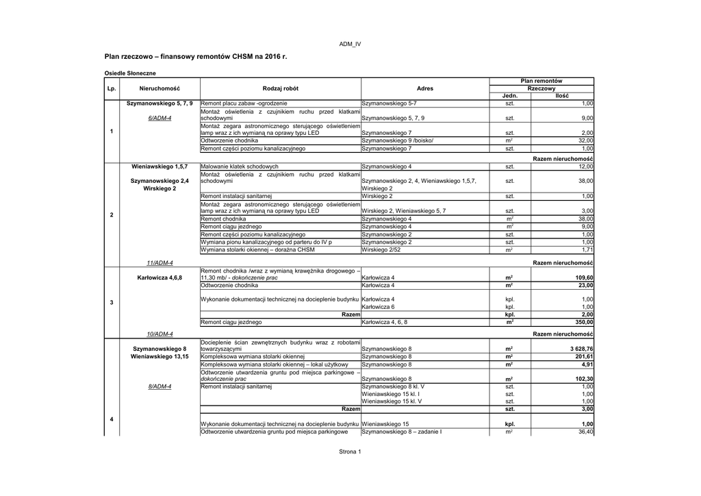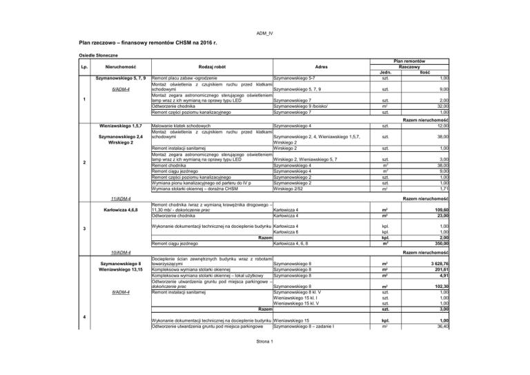 Plan rzeczowo – finansowy remontów CHSM na 2016 r.